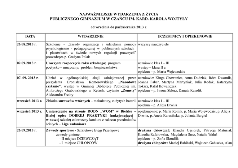 NAJWAŻNIEJSZE WYDARZENIA Z ŻYCIA PUBLICZNEGO GIMNAZJUM W CZAŃCU IM. KARD. KAROLA WOJTYŁY od września do października 2013 r. DATA WYDARZENIE UCZESTNICY I OPIEKUNOWIE 26.08.2013 r. Szkolenie - „Zasady organizacji i udzielania pomocy wszyscy nauczyciele psychologiczno - pedagogicznej w publicznych szkołach i placówkach w świetle nowych regulacji prawnych” prowadząca p. Grażyna Polak 02.09.2013 r. Uroczyste rozpoczęcie roku szkolnego; program poetycko – muzyczny; problem bezpieczeństwa uczniowie klas I – III występ – klasa II a opiekun – p. Maria Wojewodzic 07. 09. 2013 r. Udział w ogólnopolskiej akcji zainicjowanej przez prezydenta Bronisława Komorowskiego „Narodowe czytanie”; występ w Gminnej Bibliotece Publicznej im. Ambrożego Grabowskiego w Kętach; czytanie „Zemsty” Aleksandra Fredry uczniowie: Kinga Chowaniec, Anna Dudziak, Róża Dwornik, Joanna Faber, Martyna Martyniak, Julia Rodak, Katarzyna Tokarz, Rafał Kowaliczek opiekun – p. Iwona Sklorz, Danuta Kasolik wrzesień 2013 r. Zbiórka surowców wtórnych – makulatury, zużytych baterii uczniowie klas I – III opiekun – p. Alicja Drwiła wrzesień 2013 r. Umieszczenie na stronie RODN „WOM” w Bielsku – opiekunowie: p. Maria Romik, p. Maria Wojewodzic, p. Alicja Białej opisu DOBREJ PRAKTYKI funkcjonującej Drwiła, p. Aneta Karasińska, p. Jolanta Bargiel w naszej szkole; całoroczny konkurs z zakresu przedmiotów ścisłych – Liga zadaniowa 26.09.2013 r. Zawody sportowe - Sztafetowe Biegi Przełajowe zawody gminne: - II miejsce DZIEWCZĄT - I miejsce CHŁOPCÓW drużyna dziewcząt: Klaudia Gąsiorek, Patrycja Matusiak Klaudia Rafałowska, Magdalena Susz, Natalia Waluś opiekun – p. Zofia Skrudlik drużyna chłopców: Maciej Babiński, Wojciech Gałuszka, Alan zawody powiatowe - udział dziewcząt i chłopców 28.09.2013r. Piłka nożna - IV Turniej „Orlika” dziewczyny z klas pierwszych - III miejsce chłopcy z klas pierwszych - II miejsce Kamiński, Rafał Kowaliczek, Marczak, Sebastian Marczak opiekun – p. Łukasz Rodak Eryk Majdak, Krzysztof drużyna dziewcząt: Kinga Dudziak, Wiktoria Dwornik, Klaudia Gąsiorek, Klaudia Karkoszka, , Patrycja Matusiak, Natalia Kawalec, Dorota Wierońska, Daria Sordyl, Magdalena Susz, Natalia Waluś opiekun – p. Zofia Skrudlik drużyna chłopców: Jan Banat, Bartłomiej Gałosz, Mikołaj Kołodziejczyk, Eryk Majdak, Seweryn Mazgaj, Adam Pasternak, Kacper Pezda, Wojciech Romik, Konrad Twardzik, Piotr Tyrtania opiekun – p. Łukasz Rodak 04.10.2013 r. Piłka nożna – zawody gminne; I miejsce drużyna chłopców: Wojciech Dwornik, Wojciech Gałuszka, Alan Kamiński, Karol Kolber, Patryk Kolber, Damian Maga, Sebastian Marczak, Mateusz Paw, Marek Zontek opiekun – p. Łukasz Rodak 08.10.2013 r. Piłka nożna – półfinały; III miejsce drużyna chłopców: Wojciech Dwornik, Wojciech Gałuszka, Alan Kamiński, Karol Kolber, Patryk Kolber, Damian Maga, Sebastian Marczak, Mateusz Paw, Marek Zontek opiekun – p. Łukasz Rodak 17 - 26 Szkolny Turniej Tenisa Stołowego – mistrzostwa szkoły październik 2013 drużyna dziewcząt: Anna Dudziak, Klaudia Gąsiorek, Patrycja Gąsiorek, Julia Rodak, Daria Sordyl, Magdalena Susz, Sylwia Trojak opiekun – p. Zofia Skrudlik drużyna chłopców: Jan Banat, Adrian Borowczyk, Kamil Buda, Jakub Dwornik, Mariusz Kaczmarczyk, Wojciech Legień, Krzysztof Marczak, Sebastian Marczak, Jakub Mrowiec, Mariusz Pawiński, Hubert Płonka, Wojciech Romik, Paweł Sowa, Konrad Twardzik, Seweryn Wójcik, Dominik Wysogląd, opiekun – p. Łukasz Rodak 16.10.2013 r. Ślubowanie klas pierwszych – impreza środowiskowa; program artystyczny poświęcony pamięci patrona szkoły Kardynała Karola Wojtyły w 35 rocznicę wyboru na Stolicę Piotrową uczniowie klasy I gimnazjum przewodnicząca szkoły – Katarzyna Tokarz zastępca przewodniczącej - Maksymilian Młyński poczet sztandarowy: Natalia Kowalska, Adrianna Szaliga, Patryk Kolber program artystyczny występ recytatorski: Kinga Byrdziak, Kinga Dudziak, Wiktoria Dwornik, Klaudia Gąsiorek, Lidia Grabska, Dorota Wierońska, Mikołaj Kołodziejczyk, Kacper Węglarz, Bartłomiej Wykręt zespół wokalny: Anna Dudziak, Patrycja Gąsiorek, Patrycja Gąsiorek, Klaudia Karkoszka, Natalia Kowalska, Monika Kowalska, Martyna Martyniak, Patrycja Matusiak, Natalia Nalborczyk, Dorota Pałosz, Magdalena Pałosz, Julia Rodak, Magdalena Susz, Adrianna Szaliga, Sylwia Trojak, Paulina Wieczorek, Sabina Zielińska, Edyta Zontek, Adam Drabczyk, Daniel Dwornik, Sebastian Grabski oprawa techniczna: Damian Dwornik opiekunowie: p. Iwona Sklorz, p. Aneta Karasińska, p. Dagmara Gęsicka-Paw, p. Katarzyna Witkowska, 25.10.2013 r. XXI Konkurs w Targanicach uczeń – Nikodem Słupski przygotowanie - p. Danuta Kasolik opiekun – ks. Lech Kalinowski 26.10.2013 r. Wojewódzki konkurs plastyczny pt. „Mój ulubiony bohater wyróżnienia: Agnieszka Tylza, Patrycja Pustelnik literacki” zorganizowany w ramach przedsięwzięcia opiekun – p. Katarzyna Witkowska JESIENNE DNI KSIĄŻKI przez GOK w Buczkowicach Recytatorski Poezji Religijnej i Gminną Bibliotekę Publiczną w Buczkowicach 26.10.2013 r. Program poetycko - muzyczny podczas imprezy program artystyczny środowiskowej; 65-lecie Koła Gospodyń Wiejskich występ recytatorski: Kinga Byrdziak, Kinga Dudziak, Wiktoria Dwornik, Lidia Grabska, Dorota Wierońska, Bartłomiej Gałosz, Kacper Węglarz, Bartłomiej Wykręt zespół wokalny: Anna Dudziak, Patrycja Gąsiorek, Klaudia Karkoszka, Natalia Kowalska, Monika Kowalska, Martyna Martyniak, Patrycja Matusiak, Natalia Nalborczyk, Dorota Pałosz, Magdalena Pałosz, Julia Rodak, Magdalena Susz, Adrianna Szaliga, Sylwia Trojak, Paulina Wieczorek, Sabina Zielińska, Edyta Zontek, Adam Drabczyk, Daniel Dwornik, Sebastian Grabski oprawa techniczna: Damian Dwornik opiekunowie: p. Iwona Sklorz, p. Dagmara Gęsicka-Paw, p. Katarzyna Witkowska, 29.10.2013 r. Konkurs – „Zasady udzielania pierw