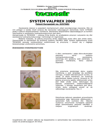 TECNOSIR S.r.l. Via Asiago, 5 Castello di Godego (Italy) , Biuro w Polsce: F.A. POLSKA SP. Z O.O. 81-531 GDYNIA, WIELPOPOLSKA 371 TEL. 58 350 54 10 FAX 58 351 16 06 www.fapolska.pl SYSTEM VALPREX 2000 Patent Europejski no. 0257682 Zawieszenie stanowi w pojazdach mechanicznych układ newralgicznego znaczenia. Móc na nim polegać w każdej chwili oznacza dla kierowców nabywających samochody marki CITROEN jazdę w pełnym bezpieczeństwie i komforcie. Elementem bezpośrednio odpowiadającym za komfort resorowania w zawieszeniu hydropneumatycznym jest sfera. Zainspirowało to TECNOSIR – czołową firmę branży do przebadania przyczyn zużywania się sfer zawieszenia hydropneumatycznego i technologii ich regeneracji. Badania wykazały, że jedyną przyczyną utraty właściwości przez sfery jest utrata azotu. Zaowocowało to wdrożeniem do produkcji systemu VALPREX 2000. System opatentowany przez TECNOSIR pozwala użytkownikowi wyeliminować tę przyczynę i cieszyć się z ciągłego bezawaryjnego użytkowania samochodu. ZAWIESZENIE HYDROPNEUMATYCZNE 4 sfery zawieszenia i piąta sfera-akumulator stanowią serce systemu hydropneumatycznego zawieszenia. Zawierają one sprężony azot zamknięty w gumowej membranie, która stanowi separator. Siła przeciwna sprężonego płynu wygina membranę a azot sprężając się pochłania wstrząsy. Z badań laboratoryjnych wynika, że nawet 10 letnie membrany nie wykazują jakichkolwiek śladów zużycia. Oznacza to, że jedyną przyczyną spadku efektywności pracy jest stała utrata azotu dokonująca się poprzez przestrzenie międzymolekularne materiału, z którego zbudowana jest sfera. Utrata azotu postępuje powoli aż do całkowitego wyczerpania. Rys. 2 Dotychczas jedynym sposobem przywrócenia zawieszeniu jego fabrycznej efektywności i sprawności była wymiana sfer. Obecnie wystarczy utrzymywać wymagane ciśnienie dzięki zamontowaniu zaworów VALPREX w miejsce oryginalnych zamknięć. Uzupełnienie sfer azotem odbywa się bezpośrednio w samochodzie bez wymontowywania sfer w czasie nie przekraczającym 30 minut. TECNOSIR S.r.l. Via Asiago, 5 Castello di Godego (Italy) , Biuro w Polsce: F.A. POLSKA SP. Z O.O. 81-531 GDYNIA, WIELPOPOLSKA 371 TEL. 58 350 54 10 FAX 58 351 16 06 www.fapolska.pl PORADA Zaleca się założenie zestawu VALPREX 2000 począwszy od drugiego roku użytkowania samochodu, a następnie coroczną kontrolę ciśnienia każdej sfery nawet, gdy nie wydaje się to konieczne. ZALETY - szybka obsługa i łatwe operowanie możliwość pozyskania nowych klientów niskie nakłady dodatkowe dochody zaufanie klientów C720 NEW - REGENERATOR SFER ZAWIESZENIA HYDRAULICZNEGO Urządzenie C720 NEW służy do napełniania azotem sfer hydropneumatycznych montowanych w CITROENACH, w których uprzednio zastosowano zawory z zestawu „VALPREX 2000”. C720 NEW składa się z: - jednostki sprężonego gazu - miernika wysokiego ciśnienia w butli - miernika napełnienia sfery gazem - zaworu ładującego - specjalnego łącznika do zaworów z zestawu VALPREX 2000 Cena brutto 999 zł. TECNOSIR S.r.l. Via Asiago, 5 Castello di Godego (Italy) , Biuro w Polsce: F.A. POLSKA SP. Z O.O. 81-531 GDYNIA, WIELPOPOLSKA 371 TEL. 58 350 54 10 FAX 58 351 16 06 www.fapolska.pl C850 - KLUCZ DO ZAWORÓW VALPREX 2000 Specjalistyczny klucz do odkręcania oryginalnych zaślepek ze sfer zawieszenia hydropneumatycznego. Jest zbudowany ze stali utwardzanej powierzchniowo. Dopasowany jest do klucza 17. C850 - cena brutto – 310 zł *************************************************************** VALPREX 2000 – ZESTAW ZAWORÓW Zestaw 5 zaworów i O-ringów do zastosowania w sferach zawieszenia hydropneumatycznego w Citroenach. Kluch o indeksie C850 został zaprojektowany specjalnie do odkręcania oryginalnych zamknięć, podczas gdy dystrybutor C720 służy do ponownego napełnienia sfer do uzyskania ciśnienia wymaganego przez producenta samochodu. VALPREX 2000 to zestaw naprawczy występujący w 3 wersjach odpowiednich dla następujących samochodów: - Średnica 7DS – tylko do samochodów, których występują sfery złożone z pół-sfer - Średnica 7 – do wszystkich samochodów wyprodukowanych do roku 1979 (kapsel sfery o średnicy 14mm) - Średnica 9 - do wszystkich samochodów wyprodukowanych po roku 1979 - Średnica 7 – do C5 VALPREX 2000 kit cena brutto 196 zł * cena dla użytkowników C720 TECNOSIR S.r.l. Via Asiago, 5 Castello di Godego (Italy) , Biuro w Polsce: F.A. POLSKA SP. Z O.O. 81-531 GDYNIA, WIELPOPOLSKA 371 TEL. 58 350 54 10 FAX 58 351 16 06 www.fapolska.pl C800 - KONTROLER SFER ZAWIESZENIA Urządzenie do kontroli sfer zawieszenia hydropneumatycznego do samochodów marki CITROEN – pomiaru ciśnienia azotu. Łatwe w użyciu, zbudowane w całości z metalu. C800 cena brutto 1.300 zł