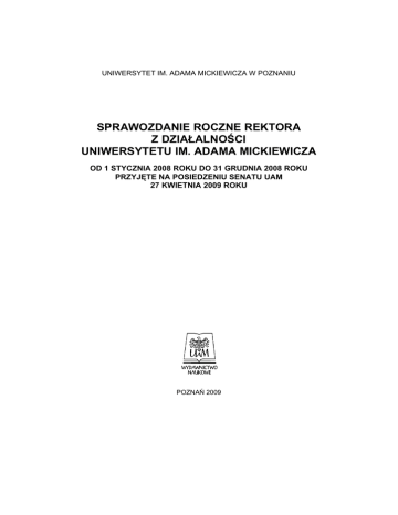 UNIWERSYTET IM. ADAMA MICKIEWICZA W POZNANIU SPRAWOZDANIE ROCZNE REKTORA Z DZIAŁALNOŚCI UNIWERSYTETU IM. ADAMA MICKIEWICZA OD 1 STYCZNIA 2008 ROKU DO 31 GRUDNIA 2008 ROKU PRZYJĘTE NA POSIEDZENIU SENATU UAM 27 KWIETNIA 2009 ROKU POZNAŃ 2009 1 Przygotowano na podstawie materiałów dostarczonych przez jednostki organizacyjne UAM Redakcja: Natalia Chromińska Edycja tabel: Natalia Ratajczak © Uniwersytet im. Adama Mickiewicza, Poznań 2009 Fotografie: Maciej Męczyński „Życie Uniwersyteckie” Korektor: Andrzej Pietrzak Łamanie komputerowe: Eugeniusz Strykowski WYDAWNICTWO NAUKOWE UNIWERSYTETU IM. ADAMA MICKIEWICZA W POZNANIU 61-734 Poznań, ul. F. Nowowiejskiego 55 tel. 061 829 39 85, fax 061 829 39 80 e-mail: [email protected] www.press.amu.edu.pl ZAKŁAD GRAFICZNY UAM POZNAŃ, UL. H. WIENIAWSKIEGO 1 2 Spis treści WPROWADZENIE . . . . . . . . . . . . . . . . . . . . . . . . . . . . . . . . . . . . . . . . . . . . . . . . . . . . . . . . 5 1. ISTOTNE ZADANIA I WYDARZENIA UCZELNIANE . . . . . . . . . . . . . . . . . . . . . . . . 7 2. ORGANA UCZELNI . . . . . . . . . . . . . . . . . . . . . . . . . . . . . . . . . . . . . . . . . . . . . . . . . . . . 16 3. STUDENCI . . . . . . . . . . . . . . . . . . . . . . . . . . . . . . . . . . . . . . . . . . . . . . . . . . . . . . . . . . . . 25 3.1. Formy studiów, poziomy kształcenia, rekrutacja, liczba studentów . . . . . . . . 3.2. Nowe kierunki/specjalności studiów . . . . . . . . . . . . . . . . . . . . . . . . . . . . . . . . . . . 3.3. Zamiejscowe ośrodki dydaktyczne oraz jednostka wspólna UAM . . . . . . . . . 3.4. Jakość nauczania, indywidualizacja studiów . . . . . . . . . . . . . . . . . . . . . . . . . . . . 3.5. Internacjonalizacja studiów . . . . . . . . . . . . . . . . . . . . . . . . . . . . . . . . . . . . . . . . . . . 3.6. Sprawy bytowe studentów i doktorantów . . . . . . . . . . . . . . . . . . . . . . . . . . . . . . . 3.7. Studenci niepełnosprawni . . . . . . . . . . . . . . . . . . . . . . . . . . . . . . . . . . . . . . . . . . . . 3.8. Działalność naukowa, kulturalna, sportowa i organizacyjna . . . . . . . . . . . . . . 3.8.1. Działalność naukowa . . . . . . . . . . . . . . . . . . . . . . . . . . . . . . . . . . . . . . . . . . 3.8.2. Działalność kulturalna . . . . . . . . . . . . . . . . . . . . . . . . . . . . . . . . . . . . . . . . . . 3.8.3. Działalność sportowa . . . . . . . . . . . . . . . . . . . . . . . . . . . . . . . . . . . . . . . . . . 3.8.4. Działalność organizacyjna . . . . . . . . . . . . . . . . . . . . . . . . . . . . . . . . . . . . . . 3.9. Biuro Promocji Zawodowej Studentów i Absolwentów UAM . . . . . . . . . . . . . . 25 27 29 31 33 35 37 41 41 44 46 47 49 4. PRACOWNICY . . . . . . . . . . . . . . . . . . . . . . . . . . . . . . . . . . . . . . . . . . . . . . . . . . . . . . . . 51 4.1. Nauczyciele akademiccy . . . . . . . . . . . . . . . . . . . . . . . . . . . . . . . . . . . . . . . . . . . . . 4.2. Pracownicy niebędący nauczycielami akademickimi . . . . . . . . . . . . . . . . . . . . . 4.3. Rozwój naukowy . . . . . . . . . . . . . . . . . . . . . . . . . . . . . . . . . . . . . . . . . . . . . . . . . . . . 4.4. Sprawy socjalne . . . . . . . . . . . . . . . . . . . . . . . . . . . . . . . . . . . . . . . . . . . . . . . . . . . . 51 52 52 53 5. BADANIA NAUKOWE I WSPÓŁPRACA Z ZAGRANICĄ . . . . . . . . . . . . . . . . . . . . 54 6. INWESTYCJE BUDOWLANE I REMONTY . . . . . . . . . . . . . . . . . . . . . . . . . . . . . . . . 58 7. ZMIANY ORGANIZACYJNE . . . . . . . . . . . . . . . . . . . . . . . . . . . . . . . . . . . . . . . . . . . . . 61 8. INNE OBSZARY DZIAŁALNOŚCI . . . . . . . . . . . . . . . . . . . . . . . . . . . . . . . . . . . . . . . . 64 8.1. Jednostka międzyuczelniana . . . . . . . . . . . . . . . . . . . . . . . . . . . . . . . . . . . . . . . . . 8.2. Ogólnouczelniane jednostki organizacyjne . . . . . . . . . . . . . . . . . . . . . . . . . . . . . 8.2.1. Biblioteka Uniwersytecka . . . . . . . . . . . . . . . . . . . . . . . . . . . . . . . . . . . . . . . 8.2.2. Wydawnictwo Naukowe . . . . . . . . . . . . . . . . . . . . . . . . . . . . . . . . . . . . . . . . 64 65 65 71 3 8.2.3. Archiwum UAM . . . . . . . . . . . . . . . . . . . . . . . . . . . . . . . . . . . . . . . . . . . . . . . 8.2.4. Ogród Botaniczny . . . . . . . . . . . . . . . . . . . . . . . . . . . . . . . . . . . . . . . . . . . . . 8.2.5. Szkoła Tłumaczy i Języków Obcych . . . . . . . . . . . . . . . . . . . . . . . . . . . . . . 8.2.6. Kolegium Języków Obcych . . . . . . . . . . . . . . . . . . . . . . . . . . . . . . . . . . . . . 8.2.7. Centrum Zarządzania Infrastrukturą i Projektami Informatycznymi UAM . 8.2.8. Centrum Zaawansowanych Technologii UAM . . . . . . . . . . . . . . . . . . . . . 8.2.9. Uczelniane Centrum Innowacji i Transferu Technologii UAM . . . . . . . . 8.3. Międzywydziałowe jednostki organizacyjne . . . . . . . . . . . . . . . . . . . . . . . . . . . . . 8.3.1. Studium Nauczania Języków Obcych . . . . . . . . . . . . . . . . . . . . . . . . . . . . 8.3.2. Studium Wychowania Fizycznego i Sportu . . . . . . . . . . . . . . . . . . . . . . . . 8.3.3. Pracownia Pytań Granicznych . . . . . . . . . . . . . . . . . . . . . . . . . . . . . . . . . . . 8.4. Ośrodki uniwersyteckie . . . . . . . . . . . . . . . . . . . . . . . . . . . . . . . . . . . . . . . . . . . . . . 8.4.1. Austriacki Ośrodek Kultury. Centrum Egzaminacyjne ÖSD . . . . . . . . . . 8.4.2. Biblioteka i Czytelnia Brytyjska . . . . . . . . . . . . . . . . . . . . . . . . . . . . . . . . . . 8.4.3. Ośrodek Alliance Française UAM . . . . . . . . . . . . . . . . . . . . . . . . . . . . . . . . 8.4.4. Instytut Konfucjusza . . . . . . . . . . . . . . . . . . . . . . . . . . . . . . . . . . . . . . . . . . . 8.5. Centra uniwersyteckie . . . . . . . . . . . . . . . . . . . . . . . . . . . . . . . . . . . . . . . . . . . . . . . 8.5.1. Centrum Badań im. Edyty Stein . . . . 