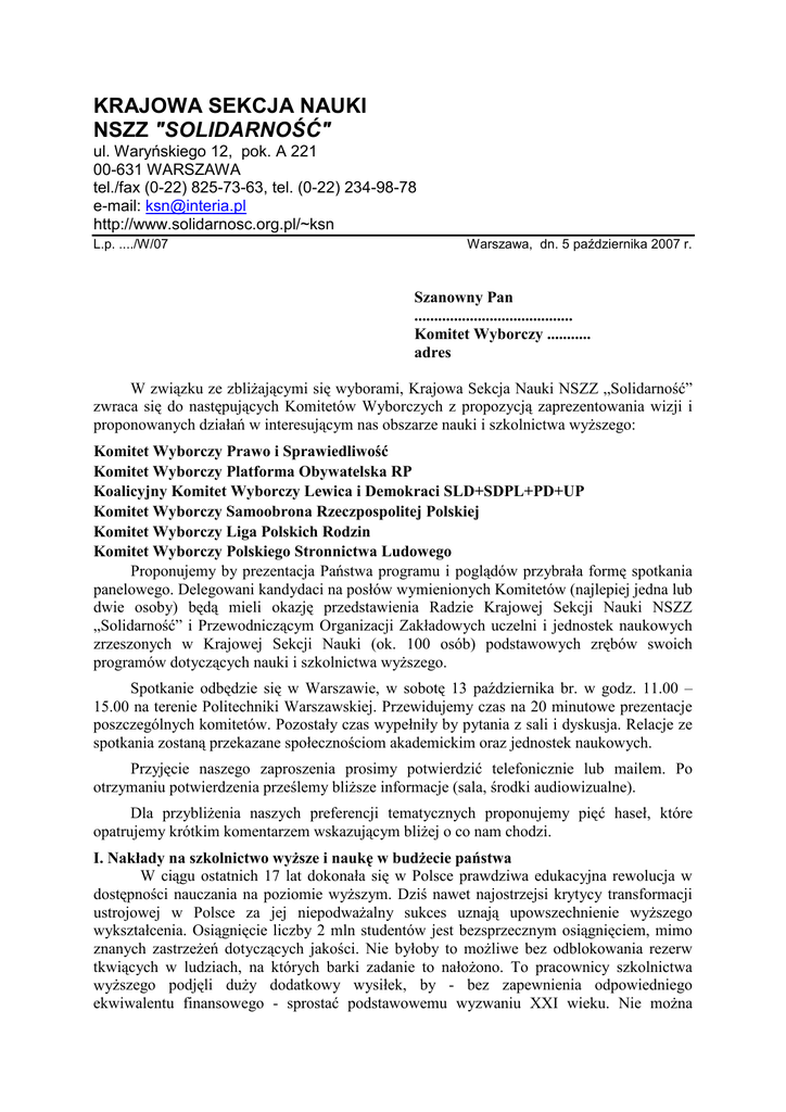KRAJOWA SEKCJA NAUKI NSZZ "SOLIDARNOŚĆ" ul. Waryńskiego 12, pok. A 221 00-631 WARSZAWA tel./fax (0-22) 825-73-63, tel. (0-22) 234-98-78 e-mail: [email protected] http://www.solidarnosc.org.pl/~ksn L.p. ..../W/07 Warszawa, dn. 5 października 2007 r. Szanowny Pan ........................................ Komitet Wyborczy ........... adres W związku ze zbliŜającymi się wyborami, Krajowa Sekcja Nauki NSZZ „Solidarność” zwraca się do następujących Komitetów Wyborczych z propozycją zaprezentowania wizji i proponowanych działań w interesującym nas obszarze nauki i szkolnictwa wyŜszego: Komitet Wyborczy Prawo i Sprawiedliwość Komitet Wyborczy Platforma Obywatelska RP Koalicyjny Komitet Wyborczy Lewica i Demokraci SLD+SDPL+PD+UP Komitet Wyborczy Samoobrona Rzeczpospolitej Polskiej Komitet Wyborczy Liga Polskich Rodzin Komitet Wyborczy Polskiego Stronnictwa Ludowego Proponujemy by prezentacja Państwa programu i poglądów przybrała formę spotkania panelowego. Delegowani kandydaci na posłów wymienionych Komitetów (najlepiej jedna lub dwie osoby) będą mieli okazję przedstawienia Radzie Krajowej Sekcji Nauki NSZZ „Solidarność” i Przewodniczącym Organizacji Zakładowych uczelni i jednostek naukowych zrzeszonych w Krajowej Sekcji Nauki (ok. 100 osób) podstawowych zrębów swoich programów dotyczących nauki i szkolnictwa wyŜszego. Spotkanie odbędzie się w Warszawie, w sobotę 13 października br. w godz. 11.00 – 15.00 na terenie Politechniki Warszawskiej. Przewidujemy czas na 20 minutowe prezentacje poszczególnych komitetów. Pozostały czas wypełniły by pytania z sali i dyskusja. Relacje ze spotkania zostaną przekazane społecznościom akademickim oraz jednostek naukowych. Przyjęcie naszego zaproszenia prosimy potwierdzić telefonicznie lub mailem. Po otrzymaniu potwierdzenia prześlemy bliŜsze informacje (sala, środki audiowizualne). Dla przybliŜenia naszych preferencji tematycznych proponujemy pięć haseł, które opatrujemy krótkim komentarzem wskazującym bliŜej o co nam chodzi. I. Nakłady na szkolnictwo wyŜsze i naukę w budŜecie państwa W ciągu ostatnich 17 lat dokonała się w Polsce prawdziwa edukacyjna rewolucja w dostępności nauczania na poziomie wyŜszym. Dziś nawet najostrzejsi krytycy transformacji ustrojowej w Polsce za jej niepodwaŜalny sukces uznają upowszechnienie wyŜszego wykształcenia. Osiągnięcie liczby 2 mln studentów jest bezsprzecznym osiągnięciem, mimo znanych zastrzeŜeń dotyczących jakości. Nie byłoby to moŜliwe bez odblokowania rezerw tkwiących w ludziach, na których barki zadanie to nałoŜono. To pracownicy szkolnictwa wyŜszego podjęli duŜy dodatkowy wysiłek, by - bez zapewnienia odpowiedniego ekwiwalentu finansowego - sprostać podstawowemu wyzwaniu XXI wieku. Nie moŜna 2 jednak zbyt długo eksploatować entuzjazmu towarzyszącego transformacji. Ten czas juŜ się skończył. Od lat róŜne wskaźniki charakteryzujące nakłady finansowe z budŜetu państwa na naukę i na szkolnictwo wyŜsze lokują nas na końcowych pozycjach wśród państw europejskich. Trudno zasłaniać się tu naszą przeszłością, bo wskaźniki te odnoszone są do Produktu Krajowego Brutto. RównieŜ poziom płac nauczycieli i naukowców lokuje nas na ostatnim miejscu wśród krajów OECD. Te porównania, z kolei, prowadzone są przy uwzględnieniu parytetu siły nabywczej pieniądza krajowego (tj. według przeliczenia PPP – Purchasing Power Parity). Obserwując posunięcia i wysiłki podejmowane przez kraje znajdujące się poniŜej średniej europejskiej, uwaŜamy, Ŝe obserwowany stan naszego systemu edukacji i nauki powinien być powodem powaŜnego zmartwienia parlamentarzystów i władzy wykonawczej, a przede wszystkim powodem podjęcia odwaŜnych i zdecydowanych kroków zaradczych. II. Polityka pro-innowacyjna W raporcie Unii Europejskiej (UE) (dokument IP/06/21, Bruksela, 12.01.2006) klasyfikującego 25 członków UE pod względem innowacyjności, Komisja Europejska zaliczyła Polskę do krajów „tracących grunt pod nogami”. W ocenie Krajowej Sekcji Nauki istnieją dwie główne przyczyny takiego stanu. Pierwsza, to przeznaczanie zbyt małych środków na badania i rozwój. Drugą przyczyną jest tzw. „czynnik ludzki”. Ma on wpływ na: liczbę patentów, liczbę wytworów innowacyjnych na rynku, skłonność do korzystania z nowych technologii, kształcenie ustawiczne. Kontynuowany z PRL system organizacyjny nauki wprost wymusza brak działań innowacyjnych. Priorytetem w nauce jest zdobycie tytułu i uzyskanie wysokiego stanowiska, takŜe w strukturach „około-naukowych”, nieprzydatnych w działaniach innowacyjnych. Blokuje to inicjatywy i prowadzi do eliminacji jednostek i osób zaangaŜowanych we wdroŜenia, traktowanych często jako konkurencja w pozyskiwaniu środków finansowych. Przykładem moŜe być działalność Ministerstwa Gospodarki, dąŜącego głównie do likwidacji jednostek badawczo-rozwojowych, zamiast ich reorganizacji i wzmocnienia. III. Prawo pracy w uczelniach UwaŜamy, Ŝe przyjęta w ustawie „Prawo o szkolnictwie wyŜszym” interpretacja autonomii uczelni w odniesieniu do regulacji dotyczących prawa pracy, kierująca waŜne rozstrzygnięcia do statutów uczelni – jest niewłaściwa. Stosunki pracy powinny być regulowane przez przepisy prawa powszechnie obowiązującego, a regulacje statutowe do takich nie naleŜą. Scedowanie na senaty i rektorów stanowienia o części regulacji dotyczących zatrudniania i warunków pracy sytuuje pracowników publicznego szkolnictwa wyŜszego poza rozwiązaniami prawnymi stosowanymi wobec większości zatrudnionych w Polsce. IV. Podział studiów na stacjonarne i niestacjonarne Wyprowadzone z tego podziału dopuszczenie pobierania opłat przez uczelnie publiczne za studia niestacjonarne według definicji ustawowej prowokuje rozwój wszelkiego rodzaju patologii. Współczesne metody kształcenia wykorzystują w coraz więks