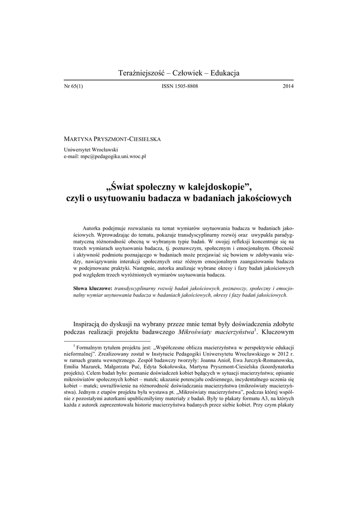 Teraźniejszość – Człowiek – Edukacja Nr 65(1) ISSN 1505-8808 2014 MARTYNA PRYSZMONT-CIESIELSKA Uniwersytet Wrocławski e-mail: [email protected] „Świat społeczny w kalejdoskopie”, czyli o usytuowaniu badacza w badaniach jakościowych Autorka podejmuje rozważania na temat wymiarów usytuowania badacza w badaniach jakościowych. Wprowadzając do tematu, pokazuje transdyscyplinarny rozwój oraz uwypukla paradygmatyczną różnorodność obecną w wybranym typie badań. W swojej refleksji koncentruje się na trzech wymiarach usytuowania badacza, tj. poznawczym, społecznym i emocjonalnym. Obecność i aktywność podmiotu poznającego w badaniach może przejawiać się bowiem w zdobywaniu wiedzy, nawiązywaniu interakcji społecznych oraz różnym emocjonalnym zaangażowaniu badacza w podejmowane praktyki. Następnie, autorka analizuje wybrane okresy i fazy badań jakościowych pod względem trzech wyróżnionych wymiarów usytuowania badacza. Słowa kluczowe: transdyscyplinarny rozwój badań jakościowych, poznawczy, społeczny i emocjonalny wymiar usytuowania badacza w badaniach jakościowych, okresy i fazy badań jakościowych. Inspiracją do dyskusji na wybrany przeze mnie temat były doświadczenia zdobyte podczas realizacji projektu badawczego Mikroświaty macierzyństwa1. Kluczowym 1 Formalnym tytułem projektu jest: „Współczesne oblicza macierzyństwa w perspektywie edukacji nieformalnej”. Zrealizowany został w Instytucie Pedagogiki Uniwersytetu Wrocławskiego w 2012 r. w ramach grantu wewnętrznego. Zespół badawczy tworzyły: Joanna Anioł, Ewa Jurczyk-Romanowska, Emilia Mazurek, Małgorzata Puć, Edyta Sokołowska, Martyna Pryszmont-Ciesielska (koordynatorka projektu). Celem badań było: poznanie doświadczeń kobiet będących w sytuacji macierzyństwa; opisanie mikroświatów społecznych kobiet – matek; ukazanie potencjału codziennego, incydentalnego uczenia się kobiet – matek; uwrażliwienie na różnorodność doświadczania macierzyństwa (mikroświaty macierzyństwa). Jednym z etapów projektu była wystawa pt. „Mikroświaty macierzyństwa”, podczas której wspólnie z pozostałymi autorkami upubliczniłyśmy materiały z badań. Były to plakaty formatu A3, na których każda z autorek zaprezentowała historie macierzyństwa badanych przez siebie kobiet. Przy czym plakaty 26 Martyna PRYSZMONT-CIESIELSKA podejściem badawczym zastosowanym w tym przedsięwzięciu badawczym była perspektywa auto/biograficzna2 (zob.: Miller 2003; Kafar 2011; Jakubowska-Malicka 2011; Pryszmont-Ciesielska 2009). Dwie badaczki biorące udział w projekcie poddały analizie i interpretacji swoje osobiste historie macierzyństwa, równolegle do historii macierzyństwa innych badanych przez siebie kobiet-matek. Materiały zgromadzone zostały przy pomocy wywiadów, eseju autobiograficznego oraz analizy fotografii jako materiałów zastanych. Trzecia badaczka zanalizowała wyłącznie własne doświadczenia macierzyństwa, zapisane przy pomocy eseju autobiograficznego, pamiętnika oraz fotobloga. Pozostałe trzy badaczki, posługując się m.in. metodą wywiadu oraz strategiami badawczymi z użyciem fotografii, zgromadziły i poddały analizie materiał skoncentrowany na biografii niepełnej – zogniskowanej na doświadczeniu macierzyństwa wybranych przez siebie kobiet-matek. W trakcie prowadzenia badań pojawiło się szereg istotnych trudności i pytań związanych z zaangażowanym uczestnictwem badaczek w opisywany projekt. Ważnym pytaniem było to, jaką rolę dla prowadzonych badań odgrywa fakt odmiennych perspektyw badawczych, mimo wspólnego przedmiotu badań tj. doświadczania macierzyństwa przez kobiety-matki? W projekcie brały udział bowiem badaczki posiadające własne doświadczenia macierzyństwa oraz te, które ich nie miały. Zatem, jakie znaczenie dla badań miała sytuacja zapośredniczenia doświadczenia osób badanych, tj. kobiet-matek przez biorące udział w projekcie badaczki? W jaki sposób sytuacja ta kreowała proces analizy i interpretacji badań? Po drugie, jakie znaczenie dla badań miał fakt, iż trzy spośród badaczek ujawniły własną perspektywę badawczą, poprzez włączenie własnych historii macierzyństwa do realizowanych badań? Warto zauważyć, iż zabieg ten uwypuklił ich wiedzę oraz wartości, jakie wiążą one z przedmiotem badań. Takie podejście sprzyjało naświetleniu światopoglądu badaczek, a także oddzieleniu ich osobistej wiedzy od tej zdobytej podczas prowadzonych badań. Opisywany zabieg z pewnością różnicował perspektywy i postawy wszystkich badaczek biorących udział w projekcie wobec przedmiotu badań. Niemniej, pierwotnym elementem różnicującym owe punkty widzenia były ich indywidualne doświadczenia i wiedza pochodząca spoza badań, lecz związana z badanym przedmiotem oraz podjętą problematyką. te zawierały oryginalne wypowiedzi kobiet-matek (bez interpretacji) oraz ich osobiste fotografie zogniskowane na tym doświadczeniu. Efektem zrealizowanego projektu jest publikacja Macierzyństwo w relacjach auto/biograficznych i fotografiach kobiet pod red. M. Pryszmont-Ciesielskiej (w druku). 2 Podejście auto/biograficzne oznacza, iż badacz może potraktować swoją biografię jako jedno ze źródeł wiedzy o interesujących go zjawiskach i prócz tego włączyć do badań biografie (pełne, niepełne) innych badanych. Wówczas, te różnorodne wobec siebie biografie (bądź ich fragmenty) podmiotów badania, stają się równymi wobec siebie i istotnymi źródłami wiedzy wyznaczając granice perspektywy badawczej. Badacz prowadząc badania (re)konstruuje zarówno własną biografię, jak i biografie osób badanych i w tym sensie stanowią one dla niego źródła wiedzy na temat świata społecznego (Pryszmont-Ciesielska 2009, 38-39). „Świat społeczny w kalejdoskopie”, czyli o usytuowaniu badacza w badaniach jakościowych 27 Sformułowane wyżej uwagi – na marginesie zreali