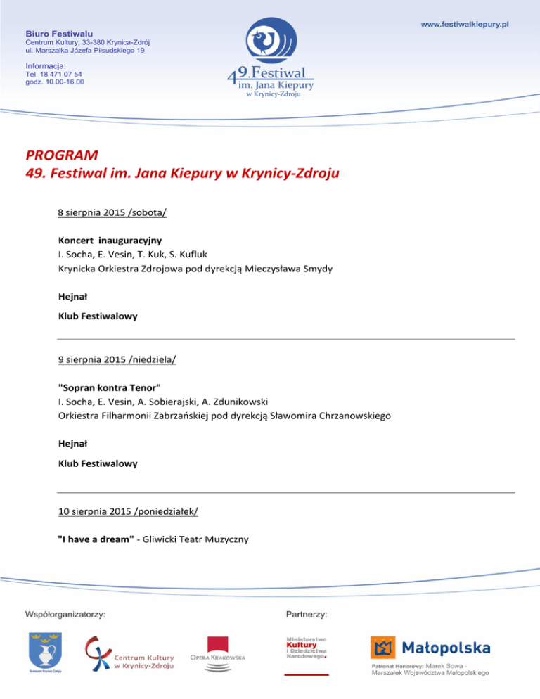Biuro Festiwalu Centrum Kultury, 33-380 Krynica-Zdrój ul. Marszałka Józefa Piłsudskiego 19 Informacja: Tel. 18 471 07 54 godz. 10.00-16.00 PROGRAM 49. Festiwal im. Jana Kiepury w Krynicy-Zdroju 8 sierpnia 2015 /sobota/ Koncert inauguracyjny I. Socha, E. Vesin, T. Kuk, S. Kufluk Krynicka Orkiestra Zdrojowa pod dyrekcją Mieczysława Smydy Hejnał Klub Festiwalowy 9 sierpnia 2015 /niedziela/ "Sopran kontra Tenor" I. Socha, E. Vesin, A. Sobierajski, A. Zdunikowski Orkiestra Filharmonii Zabrzańskiej pod dyrekcją Sławomira Chrzanowskiego Hejnał Klub Festiwalowy 10 sierpnia 2015 /poniedziałek/ "I have a dream" - Gliwicki Teatr Muzyczny Biuro Festiwalu Centrum Kultury, 33-380 Krynica-Zdrój ul. Marszałka Józefa Piłsudskiego 19 Informacja: Tel. 18 471 07 54 godz. 10.00-16.00 Koncert w kościele / Cerkiew grekokatolicka p.w. św. Apostołów Piotra i Pawła – ul. Kraszewskiego / 16:00 – I. Socha, A. Sobierajski oraz K. Kutnik (akompaniament) Hejnał Klub Festiwalowy Projekcja - Film z Kiepurą 11 sierpnia 2015 /wtorek/ Nadzwyczajny Koncert Festiwalowy Małgorzata Walewska i Motion Trio Hejnał Koncert w kościele, godz. 16:00 – Kościół p.w. Wniebowzięcia NMP („Zdrojowy”) ul. Kościelna B. Zawiślak-Dolny, B. Walczyk-Skrzypczak, M. Kutnik oraz K. Kutnik (organy) Klub Festiwalowy Projekcja - Film z Kiepurą 12 sierpnia 2015 /środa/ "/Nie tylko/ w starym kinie ..." B. Rybotycka, B. Zawiślak-Dolny, M. Kutnik, F. Makuch, J. Wójcicki Orkiestra Młoda Filharmonia pod dyrekcją Tomasza Chmiela Biuro Festiwalu Centrum Kultury, 33-380 Krynica-Zdrój ul. Marszałka Józefa Piłsudskiego 19 Informacja: Tel. 18 471 07 54 godz. 10.00-16.00 Koncert w kościele p.w. św. Antoniego Padewskiego /ul. Kraszewskiego/ godz. 16:00 Hejnał Projekcja - Film z Kiepurą 13 sierpnia 2015 /czwartek/ „Belcanto, Musical i …?!” M. Korybalska, K. Oleś-Blacha, M. Walewska, J. Woś, P. Firek , S. Kufluk Orkiestra i Chór Opery Krakowskiej pod dyrekcją Tomasza Tokarczyka Hejnał Klub Festiwalowy Projekcja: Film z Kiepurą 14 sierpnia 2015 /piątek/ Baron cygański J. Gzella, K. Oleś-Blacha, I. Socha, B. Zawiślak-Dolny , A. Lampert, M. Kotarba, S. Kufluk, M. Kutnik Orkiestra, Chór i Balet Opery Krakowskiej pod dyrekcją Tomasza Tokarczyka Koncert w kościele p.w. Matki Bożej Nieustającej Pomocy /ul. Czarny Potok/ godz. 15:30 Kwartet P. Wójtowicz , M. Korybalska, K. Kozarek Hejnał Klub Festiwalowy Biuro Festiwalu Centrum Kultury, 33-380 Krynica-Zdrój ul. Marszałka Józefa Piłsudskiego 19 Informacja: Tel. 18 471 07 54 godz. 10.00-16.00 15 sierpnia 2015 /sobota/ „Dla Ciebie śpiewam - Marta Eggerth” Koncert Finałowy /plener/ K. Oleś–Blacha, E. Piasecka, J. Woś, T. Kuk, A. Lampert, D. Sutowicz, Balet Opery Krakowskiej Orkiestra Opery Krakowskiej pod dyrekcją Tomasza Tokarczyka Hejnał Klub Festiwalowy ____________________________________________________________________________________ Wydarzenia towarzyszące: 8 sierpnia /sobota/ Koncert dla dzieci „Jaś i Małgosia” – hotel Czarny Potok Resort&SPA Organizator: Scena Gwiazd z Warszawy 15 sierpnia /sobota/ Koncert dla dzieci „Baśń w Operze” – hotel Czarny Potok Resort&SPA Organizator: Scena Gwiazd z Warszawy