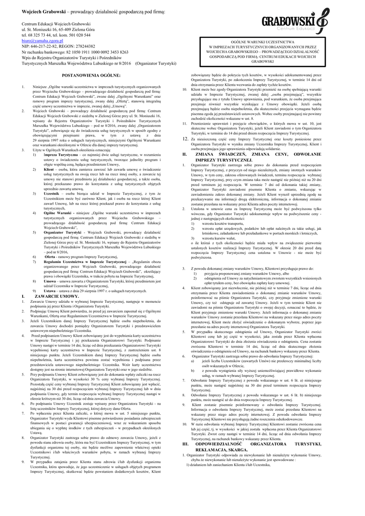 Wojciech Grabowski – prowadzący działalność gospodarczą pod firmą: Centrum Edukacji Wojciech Grabowski ul. St. Moniuszki 16, 65-409 Zielona Góra tel. 68 325 73 44, tel. kom. 501 020 544 [email protected] NIP: 646-217-22-82, REGON: 278244382 Nr rachunku bankowego: 82 1050 1911 1000 0092 3453 8263 Wpis do Rejestru Organizatorów Turystyki i Pośredników Turystycznych Marszałka Województwa Lubuskiego nr 8/2016 OGÓLNE WARUNKI UCZESTNICTWA W IMPREZACH TURYSTYCZNYCH ORGANIZOWANYCH PRZEZ WOJCIECHA GRABOWSKIEGO – PROWADZĄCEGO DZIAŁALNOŚĆ GOSPODARCZĄ POD FIRMĄ: CENTRUM EDUKACJI WOJCIECH GRABOWSKI (Organizator Turystyki) POSTANOWIENIA OGÓLNE: 1. 2. 3. I. 1. 2. 3. 4. 5. 6. 7. 8. 9. Niniejsze „Ogólne warunki uczestnictwa w imprezach turystycznych organizowanych przez Wojciecha Grabowskiego – prowadzącego działalność gospodarczą pod firmą: Centrum Edukacji Wojciech Grabowski”, zwane dalej „Ogólnymi Warunkami” oraz ramowy program imprezy turystycznej, zwany dalej „Ofertą”, stanowią integralną część umowy uczestnictwa w imprezie, zwanej dalej „Umową”. Wojciech Grabowski – prowadzący działalność gospodarczą pod firmą: Centrum Edukacji Wojciech Grabowski z siedzibą w Zielonej Górze przy ul. St. Moniuszki 16, wpisany do Rejestru Organizatorów Turystyki i Pośredników Turystycznych Marszałka Województwa Lubuskiego – pod nr 8/2016, zwany dalej „Organizatorem Turystyki”, zobowiązuje się do świadczenia usług turystycznych w sposób zgodny z obowiązującymi przepisami prawa, w tym z ustawą z dnia 29 sierpnia 1997 roku o usługach turystycznych, niniejszymi Ogólnymi Warunkami oraz warunkami określonymi w Ofercie dla danej imprezy turystycznej. Użyte w Ogólnych Warunkach określenia oznaczają: 1) Impreza Turystyczna – co najmniej dwie usługi turystyczne, w rozumieniu ustawy o świadczeniu usług turystycznych, tworzące jednolity program i objęte wspólną ceną, będąca przedmiotem Umowy, 2) Klient – osoba, która zamierza zawrzeć lub zawarła umowę o świadczenie usług turystycznych na swoją rzecz lub na rzecz innej osoby, a zawarcie tej umowy nie stanowi przedmiotu jej działalności gospodarczej, a także osoba, której przekazano prawo do korzystania z usług turystycznych objętych uprzednio zawartą umową, 3) Uczestnik – osoba biorąca udział w Imprezie Turystycznej, z tym że Uczestnikiem może być zarówno Klient, jak i osoba na rzecz której Klient zawarł Umowę, lub na rzecz której przekazał prawo do korzystania z usług turystycznych, 4) Ogólne Warunki - niniejsze „Ogólne warunki uczestnictwa w imprezach turystycznych organizowanych przez Wojciecha Grabowskiego – prowadzącego działalność gospodarczą pod firmą: Centrum Edukacji Wojciech Grabowski”, 5) Organizator Turystyki - Wojciech Grabowski, prowadzący działalność gospodarczą pod firmą: Centrum Edukacji Wojciech Grabowski z siedzibą w Zielonej Górze przy ul. St. Moniuszki 16, wpisany do Rejestru Organizatorów Turystyki i Pośredników Turystycznych Marszałka Województwa Lubuskiego – pod nr 8/2016, 6) Oferta - ramowy program Imprezy Turystycznej, 7) Regulamin Uczestnictwa w Imprezie Turystycznej – „Regulamin obozu organizowanego przez Wojciech Grabowski, prowadzącego działalność gospodarczą pod firmą: Centrum Edukacji Wojciech Grabowski”, określający prawa i obowiązki Uczestnika, w trakcie pobytu na Imprezie Turystycznej, 8) Umowa – umowa zawarta z Organizatorem Turystyki, której przedmiotem jest udział Uczestnika w Imprezie Turystycznej, 9) Ustawa – ustawa z dnia 29 sierpnia 1997 r. o usługach turystycznych. 10. 11. 12. II. 1. 2. 3. 4. ZAWARCIE UMOWY. Zawarcie Umowy udziału w wybranej Imprezie Turystycznej, następuje w momencie podpisania jej przez Klienta i Organizatora Turystyki. Podpisując Umowę Klient potwierdza, że przed jej zawarciem zapoznał się z Ogólnymi Warunkami, Ofertą oraz Regulaminem Uczestnictwa w Imprezie Turystycznej. Jeżeli Uczestnikiem danej Imprezy Turystycznej będzie osoba niepełnoletnia, do zawarcia Umowy dochodzi pomiędzy Organizatorem Turystyki i przedstawicielem ustawowym niepełnoletniego Uczestnika. Przed podpisaniem Umowy Klient zobowiązany jest do wypełnienia karty uczestnictwa w Imprezie Turystycznej i jej przekazania Organizatorowi Turystyki. Podpisanie Umowy nastąpi w terminie 14 dni, licząc od dnia przekazania Organizatorowi Turystyki wypełnionej karty uczestnictwa w Imprezie Turystycznej, z zastrzeżeniem ust. 8 niniejszego punktu. Jeżeli Uczestnikiem danej Imprezy Turystycznej będzie osoba niepełnoletnia, karta uczestnictwa powinna zostać wypełniona i podpisana przez przedstawiciela ustawowego niepełnoletniego Uczestnika. Wzór karty uczestnictwa dostępny jest na stronie internetowej Organizatora Turystyki oraz w jego siedzibie. Przy podpisaniu Umowy Klient zobowiązany jest do dokonania wpłaty zaliczki na rzecz Organizatora Turystyki, w wysokości 30 % ceny wybranej Imprezy Turystycznej. Pozostałą część ceny wybranej Imprezy Turystycznej Klient zobowiązany jest wpłacić, najpóźniej na 30 dni przed rozpoczęciem wybranej Imprezy Turystycznej lub w dniu podpisania Umowy, gdy termin rozpoczęcia wybranej Imprezy Turystycznej nastąpi w okresie krótszym niż 30 dni, licząc od dnia zawarcia Umowy. Po podpisaniu Umowy Uczestnik zostaje wpisany przez Organizatora Turystyki - na listę uczestników Imprezy Turystycznej, której dotyczy dana Oferta. Po wpłaceniu przez Klienta zaliczki, o której mowa w ust. 5 niniejszego punktu, Organizator Turystyki wyda Klientowi pisemne potwierdzenie posiadania zabezpieczeń finansowych w postaci gwarancji ubezpieczeniowej, wraz ze wskazaniem sposobu ubiegania się o wypłatę środków z tych zabezpieczeń - w przypadkach określonych Ustawą. Organizator Turystyki zastrzega sobie prawo do odmowy zawarcia Umowy, jeżeli z powodu stanu zdrowia osoby, która ma być Uczestnikiem Imprezy Turystyczne