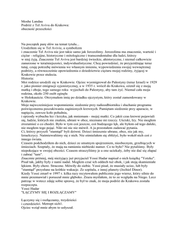 Moshe Landau Podróż z Tel Avivu do Krakowa: obecność przeszłości Na początek parę słów na temat tytułu... Urodziłem się w Tel Avivie, a symbolizm i znaczenie Tel Avivu nie jest takie samo jak Jerozolimy. Jerozolima ma znaczenie, wartość i ciężar - religijne, historyczne i mitologiczne i transcendentalne dla ludzi, którzy w niej żyją. Znaczenie Tel Avivu jest bardziej świeckie, ahistoryczne, i niemal całkowicie zanurzone w teraźniejszości, indywidualistyczne. Chcę powiedzieć, że przyjeżdżając teraz tutaj, czuję potrzebę mówienia we własnym imieniu, wypowiedzenia swojej wewnętrznej podróży, a równocześnie opowiedzenia o dziedzictwie ciężaru mojej rodziny, żyjącej w Krakowie przez stulecia. Historia: Moi rodzice urodzili się w Krakowie. Ojciec wyemigrował do Palestyny (teraz Izrael) w 1929 r. jako pionier emigracji syjonistycznej, a w 1935 r. wrócił do Krakowa, ożenił się z moją matką i oboje, tego samego roku wyjechali do Palestyny, aby tam żyć. Niemal cała moja rodzina, około 250 osób zginęła w Holokauście. Otrzymałem imię po dziadku ojczystym, który został zamordowany w Krakowie. Moje najwcześniejsze wspomnienia: siedzenie przy radioodbiorniku i słuchanie programu poświęconemu poszukiwaniu zaginionych krewnych. Pamiętam siedzenie przy aparacie, w napięciu, zawsze koło południa, i epizody wybuchu łez i krzyku, jak mniemam - mojej matki. Co jakiś czas krewni pojawiali się, ludzie, których nie znałem, ubrani w obce, nieznane mi rzeczy. Uściski, łzy. Nie mogłem zrozumieć o co chodzi. Było w tym coś jeszcze, coś budzącego lęk, ale byłem od tego daleki, nie mogłem tego pojąć. Nikt mi nic nie mówił. A ja przestałem zadawać pytania. Ci, którzy przyszli "stamtąd" byli dziwni. Dzieci śmiesznie ubrane, obce, nie jak my, Izraelczycy. Naśmiewaliśmy się z nich. Nie ośmielałem się zbliżyć, było wokół nich coś z innego świata. Czasem podchodziłem do nich, dzieci ze smutnym spojrzeniem, nieobecnym, grzebiących w śmieciach. Szeptały, że mają na ramieniu niebieski numer. Co to było? Nie pytaliśmy. Były niepokojące w swojej obcości. Czasem straszyliśmy je a one uciekały, żeby nie dać się złapać i zabrać "tam". Znacznie później, mój nieżyjący już przyjaciel Yossi Hadar napisał o nich książkę "Yotzke". Pisał tak, jakby były z nami nadal. Mogłem czuć ich oddech tuż obok, i jak stoją skamieniałe lękiem. Były chore. Stracone. Mówiły do siebie. Yossi pisał, że musiały uciec, lub były "stamtąd" przysłane na krótkie wakacje. Ze szpitala, z innej planety (Jechiel Dinor). Kiedy Yossi zmarł w 1997 r. kilka razy recytowałem publicznie jego wiersz, który silnie do mnie przemawiał i poruszał mnie głęboko. Zrazu myślałem, że to ze względu na Niego. Lecz patrząc w wstecz zdaję sobie sprawę, że był to znak, że moja podróż do Krakowa została rozpoczęta. Yossi Hadar "ŁĄCZYMY SIĘ I ROZŁĄCZAMY" Łączymy się i rozłączamy, trzydzieści i czterdzieści. Metrept sich1. Ojciec wziął mnie abym to usłyszał. Kantor recytował krótką modlitwę, ludzie żegnali się, brali pamiętniki i płakali w domach. To było bardzo trudne. Dlaczego odchodzimy, ponieważ musimy. Trudna pamięć wybucha. Przebija się. Dziura. Wszystko łączy się z rzeczami cielesnymi. Melebt2. Danke gut. Zdają się uśmiechać, tylko zdają się. Ale Theresienstadt to nie Jerusalem. Nie możesz śpiewać pieśni tęsknoty. W dzieciństwie "przyjąłem" emocjonalny punkt widzenia, że musimy być inni. Silni. Nikt nie powiedzie nas na rzeź. Nie będą dość dobrzy w walce. Moi bohaterowie i bohaterowie mojego pokolenia byli bohaterami Powstania w Getcie Warszawskim - Mordechai Anielewicz, Edelman, inni. Ale oni byli tam. My byliśmy odmienni, my mieliśmy bohaterów Ziemi Izraela - Palmach3, Jigal Alon4, Icchak Sadeh5, bohaterów Wojny o Niepodległość, bohaterów którzy walczyli z Brytyjczykami itd. Oni byli ukochanymi modelami, naśladowani, utożsamialiśmy się z nimi, nowi Żydzi, Izraelczycy. Nie mogłeś myśleć o "tam" jak o czymś ludzkim, czymś co wywołuje współczucie. Nie można było o nich w ogóle myśleć. Oni, jakby, nie istnieli. To co się z nimi stało było niepojęte. Tak przerażające, że nie istnieli. Czułem, że moi rodzice także przybyli stamtąd. Byłem dumny z ojca, bo był pionierem syjonizmu, bo walczył w Haganie6, ale nie mogłem znieść, że matka i ojciec rozmawiali ze sobą po polsku lub w jidysz, że należeli do Galut, Uchodźców. Izrael mówił po hebrajsku. Czułem do pewnego stopnia pogardę dla matki czytającej gazety polskie, i wstyd, że nie umiała czytać hebrajskiego. Wewnętrzny opór wobec ich języka, języka uchodźców spowodował, że nie nauczyłem się polskiego ani jidysz, ani słowa. Kiedy nadchodziły główne święta żydowskie garstka ocalałych członków rodziny zbierała się razem a czasem byliśmy tylko my. Pamiętam, że jako chłopiec modliłem się, żeby odnalazł się jakiś krewny, którego nie spotkałem, żeby mógł z nami zasiąść. Żebyśmy byli większą rodziną. Z latami wiele podróżowałem po Europie, także wschodniej Europie i Niemczech. Podróż do Niemiec wywołuje w mojej pamięci bolesne doświadczenie, i nigdy tam nie wróciłem. Polska była jednak "poza biegunem". Mogła nie istnieć. Bezimienny kraj, odmienna planeta. Miejsce, gdzie wydarzyło się niemożliwe. To, co wzbudzało przerażenie, wściekłość i nienawiść. Jako chłopiec słyszałem opowieść ciotki, która po wojnie wróciła do Polski z Rosji i nieomal nie została zamordowana przez Polaków. Nie mogłem tego znieść. Dla mnie Polska została wymazana z mapy. Świadomie połączyłem utratę i brak rodziny, z tęsknotą za rodziną "stamtąd", kiedy mój syn się żenił. Ślub odbywał się w ogrodzie domu mojej córki; była już matką dwojga dzieci, moich wnuków. Rankiem w dniu ślubu zdałem