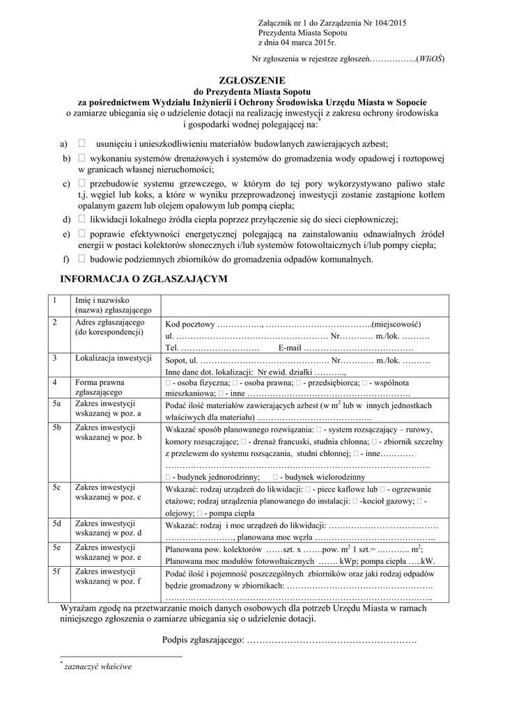 Załącznik nr 1 do Zarządzenia Nr 104/2015 Prezydenta Miasta Sopotu z dnia 04 marca 2015r. Nr zgłoszenia w rejestrze zgłoszeń……………..(WIiOŚ) ZGŁOSZENIE do Prezydenta Miasta Sopotu za pośrednictwem Wydziału Inżynierii i Ochrony Środowiska Urzędu Miasta w Sopocie o zamiarze ubiegania się o udzielenie dotacji na realizację inwestycji z zakresu ochrony środowiska i gospodarki wodnej polegającej na:* b) e) f) a) usunięciu i unieszkodliwieniu materiałów budowlanych zawierających azbest; wykonaniu systemów drenażowych i systemów do gromadzenia wody opadowej i roztopowej w granicach własnej nieruchomości; c) przebudowie systemu grzewczego, w którym do tej pory wykorzystywano paliwo stałe t.j. węgiel lub koks, a które w wyniku przeprowadzonej inwestycji zostanie zastąpione kotłem opalanym gazem lub olejem opałowym lub pompą ciepła; d) likwidacji lokalnego źródła ciepła poprzez przyłączenie się do sieci ciepłowniczej; poprawie efektywności energetycznej polegającą na zainstalowaniu odnawialnych źródeł energii w postaci kolektorów słonecznych i/lub systemów fotowoltaicznych i/lub pompy ciepła; budowie podziemnych zbiorników do gromadzenia odpadów komunalnych. INFORMACJA O ZGŁASZAJĄCYM Imię i nazwisko (nazwa) zgłaszającego Adres zgłaszającego (do korespondencji) 1 2 3 Lokalizacja inwestycji 4 Forma prawna zgłaszającego Zakres inwestycji wskazanej w poz. a 5a 5b Zakres inwestycji wskazanej w poz. b 5c Zakres inwestycji wskazanej w poz. c 5d Zakres inwestycji wskazanej w poz. d 5e Zakres inwestycji wskazanej w poz. e 5f Zakres inwestycji wskazanej w poz. f Kod pocztowy ……………., ………………………………..(miejscowość) ul. ……………………………………………… Nr………… m./lok. ………. Tel. ………………………. E-mail ………………………………… Sopot, ul. ………………………………………. Nr………… m./lok. ………. Inne dane dot. lokalizacji: Nr ewid. działki ……….., - osoba fizyczna; - osoba prawna; - przedsiębiorca; - wspólnota mieszkaniowa; - inne …………………………………………………. Podać ilość materiałów zawierających azbest (w m2 lub w innych jednostkach właściwych dla materiału) ………………………………….. Wskazać sposób planowanego rozwiązania: - system rozsączający – rurowy, komory rozsączające; - drenaż francuski, studnia chłonna; - zbiornik szczelny z przelewem do systemu rozsączania, studni chłonnej; - inne………… …………………………………………………………………………………. - budynek jednorodzinny; - budynek wielorodzinny Wskazać: rodzaj urządzeń do likwidacji: - piece kaflowe lub - ogrzewanie etażowe; rodzaj urządzenia planowanego do instalacji: -kocioł gazowy; olejowy; - pompa ciepła Wskazać: rodzaj i moc urządzeń do likwidacji: ………………………………… ……………………, planowana moc węzła ……………………………………. Planowana pow. kolektorów ……szt. x …….pow. m2 1 szt.= .……….. m2; Planowana moc modułów fotowoltaicznych ……. kWp; pompa ciepła …..kW. Podać ilość i pojemność poszczególnych zbiorników oraz jaki rodzaj odpadów będzie gromadzony w zbiornikach: ……………………………………………. ………………………………………………………………………………….. Wyrażam zgodę na przetwarzanie moich danych osobowych dla potrzeb Urzędu Miasta w ramach niniejszego zgłoszenia o zamiarze ubiegania się o udzielenie dotacji. Podpis zgłaszającego: ………………………………………………. * zaznaczyć właściwe
