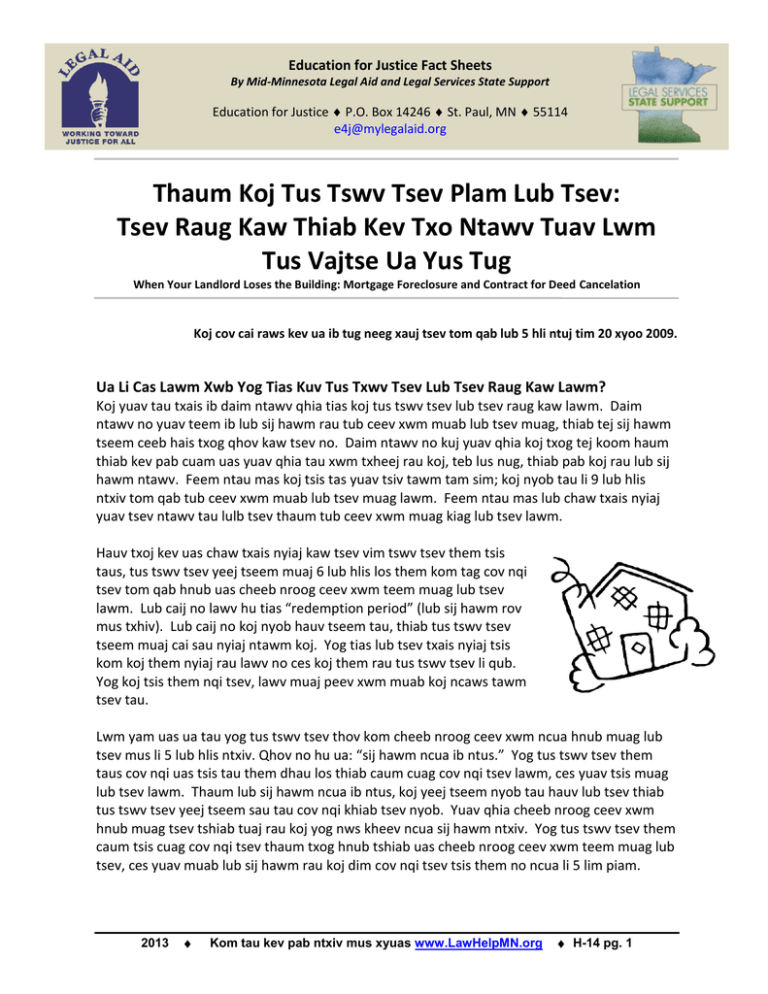 Education for Justice Fact Sheets By Mid-Minnesota Legal Aid and Legal Services State Support Education for Justice P.O. Box 14246 St. Paul, MN 55114 [email protected] Thaum Koj Tus Tswv Tsev Plam Lub Tsev: Tsev Raug Kaw Thiab Kev Txo Ntawv Tuav Lwm Tus Vajtse Ua Yus Tug When Your Landlord Loses the Building: Mortgage Foreclosure and Contract for Deed Cancelation Koj cov cai raws kev ua ib tug neeg xauj tsev tom qab lub 5 hli ntuj tim 20 xyoo 2009. Ua Li Cas Lawm Xwb Yog Tias Kuv Tus Txwv Tsev Lub Tsev Raug Kaw Lawm? Koj yuav tau txais ib daim ntawv qhia tias koj tus tswv tsev lub tsev raug kaw lawm. Daim ntawv no yuav teem ib lub sij hawm rau tub ceev xwm muab lub tsev muag, thiab tej sij hawm tseem ceeb hais txog qhov kaw tsev no. Daim ntawv no kuj yuav qhia koj txog tej koom haum thiab kev pab cuam uas yuav qhia tau xwm txheej rau koj, teb lus nug, thiab pab koj rau lub sij hawm ntawv. Feem ntau mas koj tsis tas yuav tsiv tawm tam sim; koj nyob tau li 9 lub hlis ntxiv tom qab tub ceev xwm muab lub tsev muag lawm. Feem ntau mas lub chaw txais nyiaj yuav tsev ntawv tau lulb tsev thaum tub ceev xwm muag kiag lub tsev lawm. Hauv txoj kev uas chaw txais nyiaj kaw tsev vim tswv tsev them tsis taus, tus tswv tsev yeej tseem muaj 6 lub hlis los them kom tag cov nqi tsev tom qab hnub uas cheeb nroog ceev xwm teem muag lub tsev lawm. Lub caij no lawv hu tias “redemption period” (lub sij hawm rov mus txhiv). Lub caij no koj nyob hauv tseem tau, thiab tus tswv tsev tseem muaj cai sau nyiaj ntawm koj. Yog tias lub tsev txais nyiaj tsis kom koj them nyiaj rau lawv no ces koj them rau tus tswv tsev li qub. Yog koj tsis them nqi tsev, lawv muaj peev xwm muab koj ncaws tawm tsev tau. Lwm yam uas ua tau yog tus tswv tsev thov kom cheeb nroog ceev xwm ncua hnub muag lub tsev mus li 5 lub hlis ntxiv. Qhov no hu ua: “sij hawm ncua ib ntus.” Yog tus tswv tsev them taus cov nqi uas tsis tau them dhau los thiab caum cuag cov nqi tsev lawm, ces yuav tsis muag lub tsev lawm. Thaum lub sij hawm ncua ib ntus, koj yeej tseem nyob tau hauv lub tsev thiab tus tswv tsev yeej tseem sau tau cov nqi khiab tsev nyob. Yuav qhia cheeb nroog ceev xwm hnub muag tsev tshiab tuaj rau koj yog nws kheev ncua sij hawm ntxiv. Yog tus tswv tsev them caum tsis cuag cov nqi tsev thaum txog hnub tshiab uas cheeb nroog ceev xwm teem muag lub tsev, ces yuav muab lub sij hawm rau koj dim cov nqi tsev tsis them no ncua li 5 lim piam. 2013 Kom tau kev pab ntxiv mus xyuas www.LawHelpMN.org H-14 pg. 1 Ua Li Cas Xwb Yog Tias Kuv Tus Tswv Tsev Daim Ntawv Tuav Lwm Tus Vajtse Ua Nws Tug Raug Txo Lawm? Nyob hauv daim ntawv tuav lwm tus vajtse ua yus tug mas koj tus tswv tsev them nqi rau tus neeg uas muag lub tsev ntawv. Tus neeg ntawv hu ua tus “seller” los yog “vendor” (tus muag los yog lub tus muag khoom). Kev txo daim ntawv tuav lwm tus vajtse ua yus tug no sai tshaj qhov uas chaw txais nyiaj yuav tsev kaw yus lub tsev. Feem ntau tsuas yog 60 hnub xwb txo tau lawm. Koj tsis tas yuav tsis tawm li yog koj tus tswv tsev daim ntawv tuav lwm tus vajtse ua yus tug raug txo lawm. Qee zaum tus muag tsev yuav xauj tsev rau koj thiab. Hu kiag mus cuag tus tswv tsev kom neb sib yeem tau rau ib yam. Saib xyuas kom qhov kev sib yeem ntawv muab sau ua ntawv tsev, thiab kom koj thiab tus muag tsev ntawv ob leeg xee tib si. Tus Tswv Tsev Puas Muaj Cai Yuam Kom Kuv Xee Ib Daim Ntawv Xauj Tsev Rau Nws Lub Tsev Raug Kaw Los Yog Thaum Nws Daim Ntawv Tuav Lwm Tus Vajtse Ua Tug Raug Txo? Ua ntej tus tswv tsev muaj cai kom koj xee ib daim ntawv xauj tsev los yog sau nyiaj ntawm koj los yog txais nyiaj cas tsev ntawm koj mas nws yuav tsum muab ib daim ntawv sau qhia koj tias lub tsev yeej tab tom raug kaw thiab nws yuav tsum qhia rau koj tias koj yuav nyob tau ntev npaum li cas ntawm ntawv xwb. Nyob rau qee cov zos, xws li hauv Minneapolis thiab St. Paul, nws yog ib txoj kev txhaum cai yog tus tswv tsev tsis qhia rau cov neeg khiab tsev nyob tam sim no los yog cov yuav los khiab tsev nyob yav tom ntej paub hais tias lub tsev twb raug chaw txais nyiaj kaw vim them tsis taus lawm. Hos yog tias lub tsev txais nyiaj rau tus tswv tsev ntawv ho sau ntawv cog lus rau tus tswv tsev tias lub tsev txais nyiaj yuav cia koj xauj ntxiv mus no ces tus tswv tsev tsis tas yuav sau ntawv qhia koj tias lub yuav raug kaw no los tau thiab. Tus tswv tsev muaj cai xauj tsev rau koj li 2 lub hlis ntxiv los yog kom dhau lub caij txhiv (redemption period) los yog kom daim ntawv txo cai tuav lwm tus vajtse ua tug dhau tso, seb qhov twg yog qhov luv dua. Kuv Yuav Paub Ntev Npaum Cas Ua Ntej Kuv Tawm? Ntu Caij Nyoog Cog Khiab Tsev Nyob: Yog koj muaj lus sib cog khiab tsev nyob mus ib lub caij nyoog (hu ua ntu caij nyoog khiab tsev nyob) thiab lub caij nyoog khiab tsev nyob xub pib ua ntej xa tsab ntawv kaw tsev rau koj lawm, tus tswv tsev tshiab yuav yog tus sau cov nqi khiab tsev nyob mus. Qhov no muaj tseeb txawm hais tias tus tswv tsev tshiab yuav yog lub txhab txais nyiaj los yog ib tug tib neeg. Tsuav koj ua raws li cov lus cog khiab tsev nyob no xwb ces koj yeej tseem nyob tau hauv lub tsev kom txog thaum lub caij nyoog khiab tsev xaus. TIAM SIS, yog tus tswv tsev tshiab muab lub tsev muag rau lwm tus neeg uas yuav los nyob rau hauv lawm (ua kiag lawv lub tsev nyob tseem), lawv yuav xaus tau koj lub caij nyoog cog khiab H-14 pg. 2 tsev kom ntxov dua. Lawv yuav tsum sau ntawv qhia rau koj 90 hnub ua ntej yuav kom koj tawm tsev. Khiab Tsev Nyob Ib Hlis Rau Ib Hlis: Yog koj khiab tsev nyob ib hlis rau ib hlis, tus tswv tsev tshiab yuav yog tus sau cov nqi khiab tsev nyob mus. Tsuav koj ua raws li cov lus cog khiab tsev nyob no xwb ces koj yeej tseem nyob tau hauv lub tsev kom txog thaum tus tswv tsev tshiab sau ntawv qhia rau koj 90 hnub ua ntej yuav kom koj tawm tsev. Txawm hais tias koj tsis muaj tsab ntawv cog lus khiab tsev nyob los koj yeej muaj cai tau tsab ntawv qhia rau koj 90 hnub ua ntej yuav kom koj tawm tsev. Koj kuj xaiv tau los xaus koj kev khiab tsev ib hlis 