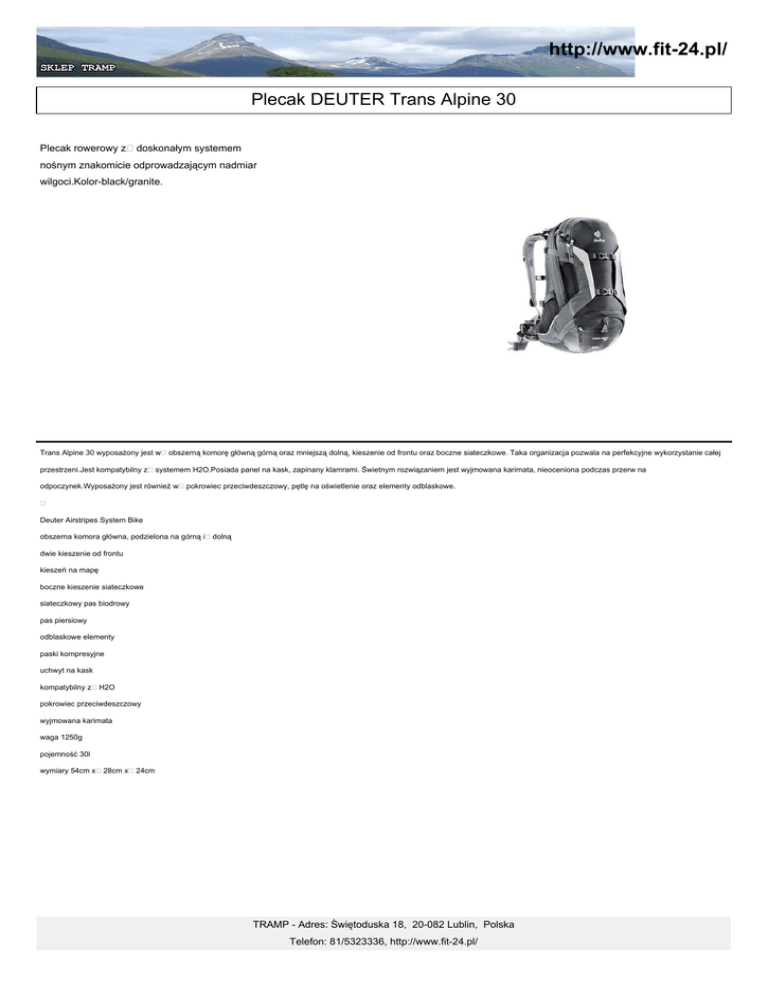 http://www.fit-24.pl/ Plecak DEUTER Trans Alpine 30 Plecak rowerowy z doskonałym systemem nośnym znakomicie odprowadzającym nadmiar wilgoci.Kolor-black/granite. Trans Alpine 30 wyposażony jest w obszerną komorę główną górną oraz mniejszą dolną, kieszenie od frontu oraz boczne siateczkowe. Taka organizacja pozwala na perfekcyjne wykorzystanie całej przestrzeni.Jest kompatybilny z systemem H2O.Posiada panel na kask, zapinany klamrami. Świetnym rozwiązaniem jest wyjmowana karimata, nieoceniona podczas przerw na odpoczynek.Wyposażony jest również w pokrowiec przeciwdeszczowy, pętlę na oświetlenie oraz elementy odblaskowe. Deuter Airstripes System Bike obszerna komora główna, podzielona na górną i dolną dwie kieszenie od frontu kieszeń na mapę boczne kieszenie siateczkowe siateczkowy pas biodrowy pas piersiowy odblaskowe elementy paski kompresyjne uchwyt na kask kompatybilny z H2O pokrowiec przeciwdeszczowy wyjmowana karimata waga 1250g pojemność 30l wymiary 54cm x 28cm x 24cm TRAMP - Adres: Świętoduska 18, 20-082 Lublin, Polska Telefon: 81/5323336, http://www.fit-24.pl/