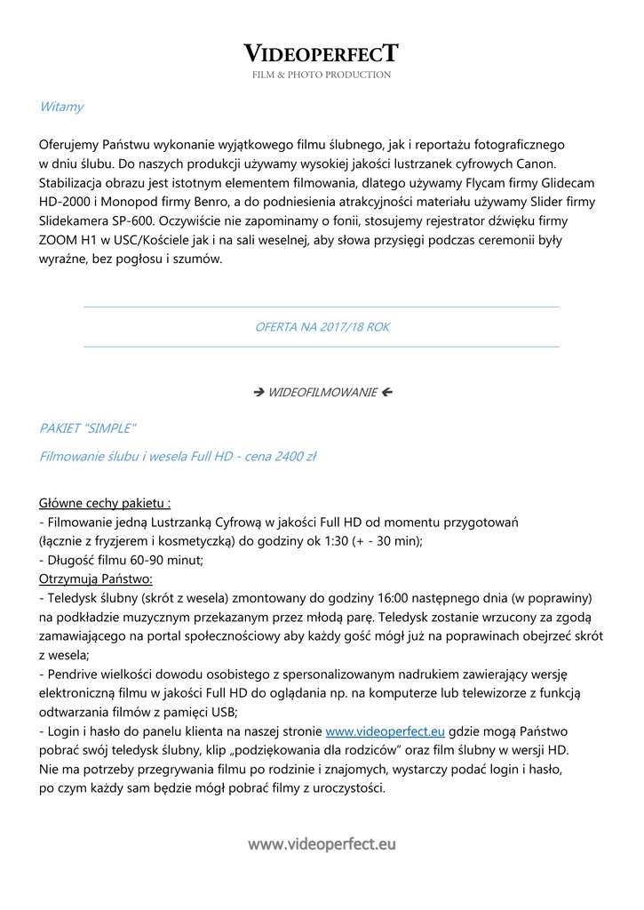 VIDEOPERFECT FILM & PHOTO PRODUCTION Witamy Oferujemy Państwu wykonanie wyjątkowego filmu ślubnego, jak i reportażu fotograficznego w dniu ślubu. Do naszych produkcji używamy wysokiej jakości lustrzanek cyfrowych Canon. Stabilizacja obrazu jest istotnym elementem filmowania, dlatego używamy Flycam firmy Glidecam HD-2000 i Monopod firmy Benro, a do podniesienia atrakcyjności materiału używamy Slider firmy Slidekamera SP-600. Oczywiście nie zapominamy o fonii, stosujemy rejestrator dźwięku firmy ZOOM H1 w USC/Kościele jak i na sali weselnej, aby słowa przysięgi podczas ceremonii były wyraźne, bez pogłosu i szumów. OFERTA NA 2017/18 ROK WIDEOFILMOWANIE PAKIET "SIMPLE" Filmowanie ślubu i wesela Full HD - cena 2400 zł Główne cechy pakietu : - Filmowanie jedną Lustrzanką Cyfrową w jakości Full HD od momentu przygotowań (łącznie z fryzjerem i kosmetyczką) do godziny ok 1:30 (+ - 30 min); - Długość filmu 60-90 minut; Otrzymują Państwo: - Teledysk ślubny (skrót z wesela) zmontowany do godziny 16:00 następnego dnia (w poprawiny) na podkładzie muzycznym przekazanym przez młodą parę. Teledysk zostanie wrzucony za zgodą zamawiającego na portal społecznościowy aby każdy gość mógł już na poprawinach obejrzeć skrót z wesela; - Pendrive wielkości dowodu osobistego z spersonalizowanym nadrukiem zawierający wersję elektroniczną filmu w jakości Full HD do oglądania np. na komputerze lub telewizorze z funkcją odtwarzania filmów z pamięci USB; - Login i hasło do panelu klienta na naszej stronie www.videoperfect.eu gdzie mogą Państwo pobrać swój teledysk ślubny, klip „podziękowania dla rodziców” oraz film ślubny w wersji HD. Nie ma potrzeby przegrywania filmu po rodzinie i znajomych, wystarczy podać login i hasło, po czym każdy sam będzie mógł pobrać filmy z uroczystości. www.videoperfect.eu VIDEOPERFECT FILM & PHOTO PRODUCTION PAKIET "ALL-IN" Filmowanie ślubu i wesela Full HD - 2 operatorów - cena 3000 zł Główne cechy pakietu : - Filmowanie dwiema Lustrzankami Cyfrowymi (dwóch operatorów) w jakości Full HD od momentu przygotowań (łącznie z fryzjerem i kosmetyczką) do godziny ok 1:30 (+ - 30 min); - Długość filmu 60-90 minut; Otrzymują Państwo: - Teledysk ślubny (skrót z wesela) zmontowany do godziny 16:00 następnego dnia (w poprawiny) na podkładzie muzycznym przekazanym przez młodą parę. Teledysk zostanie wrzucony za zgodą zamawiającego na portal społecznościowy aby każdy gość mógł już na poprawinach obejrzeć skrót z wesela; - Pendrive wielkości dowodu osobistego z spersonalizowanym nadrukiem zawierający wersję elektroniczną filmu w jakości Full HD do oglądania np. na komputerze lub telewizorze z funkcją odtwarzania filmów z pamięci USB; - Trzy płyty DVD z filmem w pudełkach ze specjalnie spersonalizowaną okładką; - Login i hasło do panelu klienta na naszej stronie www.videoperfect.eu gdzie mogą Państwo pobrać swój teledysk ślubny, klip „podziękowania dla rodziców” oraz film ślubny w wersji HD. Nie ma potrzeby przegrywania filmu po rodzinie i znajomych, wystarczy podać login i hasło, po czym każdy sam będzie mógł pobrać filmy z uroczystości. Proponujemy również wykonanie: - Kilku minutowego klipu “Podziękowania dla rodziców” – Koszt 600 zł. Filmik zostanie sfilmowany i zmontowany kilka tygodni przed ceremonią ślubu. W dniu wesela zostanie wyświetlony przez rzutnik aby rodzice mogli go obejrzeć w ramach podziękowań. Jeżeli sala weselna nie posiada rzutnika, zapewniamy dowieść nasz rzutnik gratis. www.videoperfect.eu VIDEOPERFECT FILM & PHOTO PRODUCTION FOTOGRAFIA PAKIET "STANDARD" Reportaż fotograficzny ślubu i wesela - cena 1600 zł Główne cechy pakietu : - Reportaż fotograficzny w dniu ślubu od momentu przygotowań (łącznie z fryzjerem i kosmetyczką) do godziny ok 1:30 (+ - 30 min); - Minimum 350 zdjęć w pełnej rozdzielczości poddanych obróbce graficznej; - Zdjęcia zostaną przygotowane do druku w wymiarze 30 x 20 cm i rozdzielczości 300 dpi; - Fotografie dostosowane do publikacji w sieci Internet (długi bok 800px); Otrzymują Państwo: - Pendrive wielkości dowodu osobistego z spersonalizowanym nadrukiem; PAKIET "ALL-IN" Reportaż fotograficzny ślubu i wesela oraz sesja plenerowa - cena 2400 zł Główne cechy pakietu : - Reportaż fotograficzny w dniu ślubu od momentu przygotowań (łącznie z fryzjerem i kosmetyczką) do godziny ok 1:30 (+ - 30 min); - Sesja plenerowa w innym dniu niż dzień ślubu; - Minimum 500 zdjęć w pełnej rozdzielczości poddanych obróbce graficznej; - Zdjęcia zostaną przygotowane do druku w wymiarze 30 x 20 cm i rozdzielczości 300 dpi; - Fotografie dostosowane do publikacji w sieci Internet (długi bok 800px); Otrzymują Państwo: - Pendrive wielkości dowodu osobistego z spersonalizowanym nadrukiem; - Foto książkę lub Album zdjęciowy do wyboru; - Galerię internetową zdjęć na okres 3 miesięcy zabezpieczoną hasłem. Po zalogowaniu można obejrzeć zdjęcia oraz jednym kliknięciem pobrać wszystkie na swój komputer. Nie ma potrzeby przegrywania zdjęć po rodzinie i znajomych, wystarczy podać login i hasło, po czym każdy sam będzie mógł pobrać zdjęcia z uroczystości. Dodatkowe informacje znajdą Państwo na naszej stronie: www.videoperfect.eu ZAPRASZAMY DO NIEZOBOWIĄZUJĄCEGO SPOTKANIA, GDZIE ZOBACZĄ PAŃSTWO WIĘCEJ MATERIAŁÓW Z ZREALIZOWANYCH ZLECEŃ !!! www.videoperfect.eu