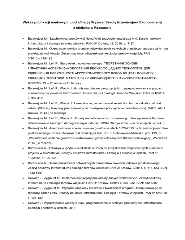 Wykaz publikacji naukowych pod afiliacją Wyższej Szkoły Inżynieryjno- Ekonomicznej z siedzibą w Rzeszowie Balawejder M.: Szachownica gruntów wsi Nowa Wieś przeciętej autostradą A-4. Zeszyt naukowy Infrastruktura i ekologia terenów wiejskich PAN O/ Kraków, 12. 2010, s.17-27 Balawejder M.: Ocena szachownicy gruntów indywidualnych we wsiach przeciętych autostradą A4 na przykładzie wsi Mrowla. Zeszyt naukowy Infrastruktura i ekologia terenów wiejskich, PAN 3/2010,s.115-125 Balawejder M., Leń P.: Stary obiekt, nowa technologia. ТЕОРЕТИЧНІ ОСНОВИ І ПРАКТИЧНІ АСПЕКТИ ВИКОРИСТАННЯ РЕСУРСООЩАДНИХ ТЕХНОЛОГІЙ ДЛЯ ПІДВИЩЕННЯ ЕФЕКТИВНОСТІ АГРОПРОМИСЛОВОГО ВИРОБНИЦТВА І РОЗВИТКУ СІЛЬСЬКИХ ТЕРИТОРІЙ МАТЕРІАЛИ ХV МІЖНАРОДНОГО НАУКОВО-ПРАКТИЧНОГО ФОРУМУ 24 – 26 вересня 2014 року Balawejder M., Leń P., Wójcik J.: Grunty marginalne, propozycje ich zagospodarowania w pracach scaleniowych w powiecie brzozowskim. Infrastruktura i Ekologia Terenów Wiejskich PAN. nr II/2014, s. 399-410 Balawejder M., Leń P., Wójcik J.: Laser skaning as an innovative solution for the valuation of real estate. (Skaning laserowy jako innowacyjne rozwiązanie przy wycenie nieruchomości). GAEE, AGH Kraków, 2014 ( do recenzji) Balawejder M., Leń P., Wójcik J. : Grunty rozdrobnienie i rozproszenie gruntów wpowiecie Brzozów determinowane rozwojem demograficznym ludności. UWM Olsztyn 2014.- (po recenzjach, w druku) Balawejder M.: Analiza rozwoju scaleń i wymian gruntów w latach 1923-2013 na terenie województwa podkarpackiego., Praca zbiorowa pod redakcją dr hab. inż. K. Sobolewska-Mikulska, prof. PW, nt: „Współczesne scalenia gruntów w kształtowaniu granic rolniczej przestrzeni produkcyjnej”, Warszawa 2014 ( w recenzji) Borowiecki A.: Aplikacja w języku Visual Basic służąca do pozyskiwania współrzędnych punktów z projektu w Microstation, Zeszyty naukowe Infrastruktura i Ekologia Terenów Wiejskich, PAN nr 1/II/2012, s. 129-135 Borowiecki A.: Ocena dokładności odtworzonych parametrów równania odcinka prostoliniowego, Zeszyt naukowy Infrastruktura i ekologia terenów wiejskich PAN O/ Kraków, 3/2011, s. 115-123 ISSN 1732-5587 Derwisz J., Zygmunt M.: Implementacja algorytmu korekty danych wektorowych. Zeszyt naukowy Infrastruktura i ekologia terenów wiejskich PAN O/ Kraków, 4/2011 s. 227-232 ISSN1732-5587 Derwisz J., Zygmunt M.: Wybrane problemy związane z tworzeniem programu komputerowego do realizacji zadań LPIS. Zeszyty naukowe Infrastruktura i Ekologia Terenów Wiejskich, PAN nr 12/2010 s. 125-130 Derwisz J.: Wykorzystanie wiedzy z kursu programowania w praktyce produkcyjnej, Infrastruktura i Ekologia Terenów Wiejskich, 2013 Dvulit P., Tretyak K.: O dokładności interpolacji wysokości geoidy (quasi-geoidy) z wykorzystaniem nowoczesnych modeli geopotencjału. Zeszyt naukowy Infrastruktura i ekologia terenów wiejskich PAN O/ Kraków, 12 2010 s. 45-50 Krupiński W.: Metody statystyczne jako ocena poprawności pomiarów geodezyjnych. AGH: Geomatics and Environmental Engineering, Kraków 2014, vol. 8, No. 1, str. 21-32 Lech-Turaj B., Noga K.: Zmiany w krajobrazie bieszczadzkich wsi na przykładzie gminy Baligród. Infrastruktura i ekologia terenów wiejskich PAN, Oddział w Krakowie, nr 3/2011, s.227–234. Leń P., Noga K.,: Analiza rozdrobnienia gruntów na przykładzie powiatu Brzozów, Zeszyty naukowe Infrastruktura i Ekologia Terenów Wiejskich PAN,3/2010, s.55-64 Leń P.: Analiza rozdrobnienia gruntów na przykładzie powiatu Brzozów. Zeszyty naukowe Infrastruktura i Ekologia Terenów Wiejskich PAN, 1/2010, s.65-74 Leń P.: Kierunki zmian w strukturze użytków gruntowych w latach 1872-2008 w powiecie Brzozów. Zeszyty naukowe Infrastruktura i Ekologia Terenów Wiejskich PAN, 4/2009, s.167-176 Leń P.: Określenie pilności potrzeb prac scalania i wymiany gruntów we wsiach powiatu Brzozów, Zeszyty naukowe Infrastruktura i Ekologia Terenów Wiejskich PAN 3/2011, s.7-16 Leń P.: Podział przestrzeni rolniczej powiatu brzozowskiego pod względem wartości produkcyjnej gruntów ornych oraz użytków zielonych, Zeszyty naukowe Infrastruktura i Ekologia Terenów Wiejskich PAN, 12/2010, s.37-44 Leń P.: Rozmiary gruntów różniczan i możliwości ich likwidacji (na przykładzie wsi w powiecie Brzozów, województwo Podkarpackie). Materiały XVII Ogólnopolskiej Konferencji na temat Rozwój obszarów wiejskich – stan obecny i perspektywy, 2009,Puławy, s. 73-78 Lisak A., Sablik M. :Trapezoidal rule revisited, Bull. Inst. Math. Acad. Sinica (N.S.), Vol. 6 (2011), No.3,s.347-360 Lisak A.: Matematyka dla geodetów, Wydawnictwo WSI-E, Rzeszów, 2014 ISBN 978-83-60507-9 Noga K., Błaż K.: Sposób oceny szachownicy gruntów w wybranych wsiach powiatu brzozowskiego. Zeszyty naukowe Infrastruktura i ekologia terenów wiejskich, Polska Akademia Nauk, Oddział w Krakowie, 3/2011, s.217–226 Noga K., Modernizacja ewidencji gruntów i budynków w Polsce, ТЕОРЕТИЧНІ ОСНОВИ І ПРАКТИЧНІ АСПЕКТИ ВИКОРИСТАННЯ РЕСУРСООЩАДНИХ ТЕХНОЛОГІЙ ДЛЯ ПІДВИЩЕННЯ ЕФЕКТИВНОСТІ АГРОПРОМИСЛОВОГО ВИРОБНИЦТВА І РОЗВИТКУ СІЛЬСЬКИХ ТЕРИТОРІЙ МАТЕРІАЛИ ХV МІЖНАРОДНОГО НАУКОВО-ПРАКТИЧНОГО ФОРУМУ 24 – 26 вересня 2014 року, s. 161-167 Plewako M.: Badanie dynamiki osuwisk metodami geodezyjnymi. Zeszyty naukowe Infrastruktura i Ekologia Terenów Wiejskich PAN, Oddz. w Krakowie nr 3/2011, s. 259-264 Plewako M.: Badania dokładności ręcznych odbiorników GPS. Zeszyty naukowe Infrastruktura i Ekologia Terenów Wiejskich PAN, Oddz. w Krakowie nr 12/2010 s.103-106 Sanek A.: Ocena stanu uzbrojenia technicznego tere
