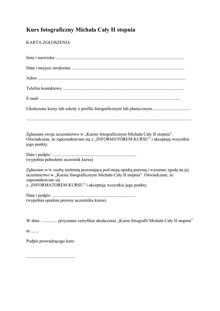 Kurs fotograficzny Michała Cały II stopnia KARTA ZGŁOSZENIA Imię i nazwisko .................................................................................................................... Data i miejsce urodzenia ...................................................................................................... Adres ..................................................................................................................................... Telefon kontaktowy ............................................................................................................. E-mail ............................................................................................................................... Ukończone kursy lub szkoły o profilu fotograficznym lub plastycznym................................... ..................................................................................................................................................... Zgłaszam swoje uczestnictwo w „Kursie fotograficznym Michała Cały II stopnia”. Oświadczam, że zapoznałem/am się z „INFORMATOREM KURSU” i akceptuję wszystkie jego punkty. Data i podpis: ............................................................................ (wypełnia pełnoletni uczestnik kursu) Zgłaszam w/w osobę nieletnią pozostającą pod moją opieką prawną i wyrażam zgodę na jej uczestnictwo w „Kursie fotograficznym Michała Cały II stopnia”. Oświadczam, że zapoznałem/am się z „INFORMATOREM KURSU” i akceptuję wszystkie jego punkty. Data i podpis: ........................................................................... (wypełnia opiekun prawny uczestnika kursu) W dniu ............... przyznano certyfikat ukończenia „Kursu fotografii Michała Cały II stopnia” nr ....... Podpis prowadzącego kurs: ............................................