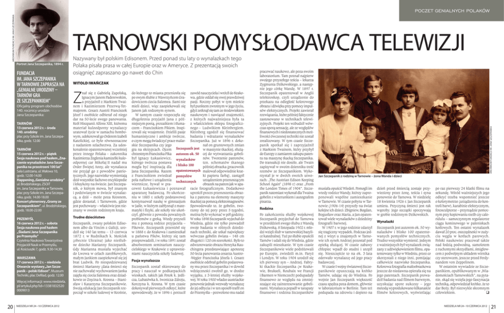 Archiwum fundacji im. Jana Szczepanika poczet genialnych polaków Portret Jana Szczepanika, 1894 r. Fundacja im. Jana Szczepanika w Tarnowie zaprasza na „Genialne Urodziny – Tarnów gra ze Szczepanikiem” Oficjalny program obchodów 140. rocznicy urodzin Jana Szczepanika: Tarnów 13 czerwca 2012 r. – środa 140. urodziny plac przy Szkole im. Jana Szczepanika, godz. 12.00 Tarnów 15 czerwca 2012 r. – piątek Sesja naukowa pod hasłem „Znaczenie wynalazków Jana Szczepanika na przestrzeni 100 lat” Sala Lustrzana, ul. Wałowa 10, godz. 12.00-14.00 Happening „Genialne urodziny” ul. Brodzińskiego, ZSOiT im. Jana Szczepanika w Tarnowie, plac przy Szkole im. Jana Szczepanika, godz. 14.00-18.00 Koncert plenerowy „Gramy ze Szczepanikiem”, ul. Brodzińskiego, godz. 18.00-22.00 Przemyśl 16 czerwca 2012 r. – sobota Sesja naukowa pod hasłem „Śladami Jana Szczepanika po Przemyślu” Czytelnia Naukowa Towarzystwa Przyjaciół Nauk w Przemyślu, ul. Kościuszki 7, godz. 9.30-14.30 Warszawa 17 czerwca 2012 r. – niedziela Otwarcie wystawy „Jan Szczepanik – polski Edison”, Muzeum Techniki, plac Defilad, godz. 12.00 Więcej informacji: www.niedziela. pl/artykul.php?id=13381832520 0009013 20 NIEDZIELA NR 24 • 10 czerwca 2012 Nazywany był polskim Edisonem. Przed ponad stu laty o wynalazkach tego Polaka pisała prasa w całej Europie oraz w Ameryce. Z prezentacją swoich osiągnięć zapraszano go nawet do Chin Witold Iwańczak Z nał się z Gabrielą Zapolską, Ignacym Janem Paderewskim, a przyjaźnił z Markiem Twainem i Kazimierzem Przerwą-Tetmajerem. Cesarz Austrii Franciszek Józef I osobiście odbierał od niego dar na 50-lecie swego panowania. Król Hiszpanii Alfons XIII, któremu materiał kuloodporny wynalazcy uratował życie w zamachu bombowym, udekorował go Orderem Izabeli Katolickiej, co było równoznaczne z nadaniem szlachectwa. Za udoskonalenie opatentowanej wcześniej przez innego Polaka – zakonnika Kazimierza Żeglenia kamizelki kuloodpornej car Mikołaj II nadał mu Order Świętej Anny, ale wynalazca nie przyjął go z powodów patriotycznych. Jego nazwisko wymieniają dziś wszystkie fachowe encyklopedie i leksykony na świecie. Jan Szczepanik, o którym mowa, był znanym i podziwianym w świecie wynalazcą, a dziś – może poza Krosnem, gdzie dorastał, i Tarnowem, gdzie jest pochowany – właściwie jest nieznany w swoim rodzinnym kraju. Trudne dzieciństwo Szczepanik, zwany polskim Edisonem albo da Vincim z Galicji, urodził się 140 lat temu – 13 czerwca 1872 r. w Rudnikach k. Mościsk (obecnie Ukraina) jako nieślubne dziecko Marianny Szczepanik. Gdy Marianna musiała wyjechać do Lwowa w celach zarobkowych, małym Jankiem zaopiekował się jej brat Ludwik. Po niespodziewanej śmierci Marianny (data śmierci się nie zachowała) wychowaniem Janka zajęła się ciocia Salomea oraz dziadkowie ze Zręcina k. Krosna – Stanisław i Katarzyna Szczepanikowie. Swoją edukację Jan Szczepanik rozpoczął w szkole ludowej w Krośnie, do którego to miasta przeniosła się zawód nauczyciela i wrócił do Krakopo swym ślubie z Wawrzyńcem Gra- wa, gdzie oddał się swej prawdziwej dowiczem ciocia Salomea. Sami nie pasji. Roczny pobyt w tym mieście mieli dzieci, więc zaopiekowali się był punktem zwrotnym w jego życiu, Janem jak rodzonym synem. gdyż zetknął się tam ze środowiskiem W tamtym czasie rozpoczęła się naukowym i nawiązał znajomości, długoletnia przyjaźń Jana z póź- z których najważniejsza była ta niejszym poetą, prozaikiem i tłuma- z właścicielem sklepu fotograficzczem – Franciszkiem Pikiem. Inspi- nego – Ludwikiem Kleinbergiem. rowali się wzajemnie. Dzielili pasje Kleinberg zgodził się finansować humanistyczne i ambicje twórcze, badania i wdrażanie wynalazków o czym mogą świadczyć prace malar- Szczepanika. Już w 1896 r. dokoskie Szczepanika czy jego nał on gruntownych zmian gra na skrzypcach. Ojcem Szczepanik jest w maszynie tkackiej, służąchrzestnym Franciszka Pika autorem ok. 50 cej do wytwarzania gobelibył Ignacy Łukasiewicz, wynalazków nów. Tworzenie patronów, którego twórcza postawa tzn. schematów tkanego i blisko 100 mogła być inspiracją dla później obrazka (pracownik Jana Szczepanika. Razem opatentowanych malował odpowiednie kratz Franciszkiem zwiedzał pomysłów ki papieru farbą), zastąpił pola naftowe i urządzenia technicznych urządzeniem przenoszącym wiertnicze, bywał w praobrazek na patron jak w apacowni Łukasiewicza i poznawał racie fotograficznym. Dodatkowo aparaturę badawczą. Po ukończe- uprościł proces przenoszenia obrazniu w 1885 r. szkoły podstawowej ka z patronu na elementy maszyny kontynuował naukę w gimnazjum tkackiej za pomocą elektromagnesów. w Jaśle, w którym zabłysnął z mate- Spowodowało to, że gobelin, twomatyki i fizyki, ale szkoły nie ukoń- rzony do tej pory przez 5 tygodni, czył, głównie z powodu poważnych można było wykonać w pół godziny. problemów z greką. Wtedy przyszli W roku 1898 Szczepanik wyjechał do mu z pomocą rodzice przyjaciela – Wiednia, gdzie nie tylko prowadził Pikowie. Szczepanik przeniósł się swoje badania w różnych dziedziw 1888 r. do Krakowa i zamieszkał nach techniki, ale utkał największy u państwa Pików, którzy się tam wówczas gobelin świata – 148 cm przeprowadzili, i w roku 1891 został długości i 120 cm szerokości. Było to absolwentem seminarium nauczy- odwzorowanie obrazu Henryka Raucielskiego w Krakowie z uprawnie- chingera przedstawiające apoteozę niami nauczyciela szkoły ludowej. 50-lecia panowania cesarza Austro-Węgier Franciszka Józefa I. Cesarz Pasja wynalazcza osobiście odebrał gobelin podarowaSzczepanik został skierowany do ny mu przez Szczepanika i w dowód pracy i nauczał w podkarpackich wdzięczności zwolnił go, w drodze wioskach, takich jak Potok k. Jedli- wyjątku, z 3-letniej służby wojskocza, Lubatówka k. Iwonicza-Zdroju, wej. W rok