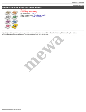Informacje o produkcie Utworzono 04-03-2017 Papier ksero A3 Maestro a'500 niebieski Cena : Chwilowy brak ceny Nr katalogowy : 1016 Stan magazynowy : bardzo wysoki Średnia ocena : brak recenzji m ew a Najwyższej jakości papier biurowy barwiony w masie celulozowej. Polecany do wydruków w drukarkach laserowych i atramentowych, a także w wysokonakładowych urządzeniach kopiujących. Zachowuje odporność barw na starzenie. Wygenerowano w programie www.oscGold.com