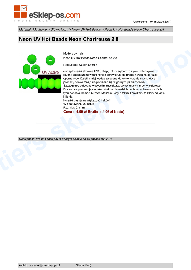 Utworzono : 04 marzec 2017 Materiały Muchowe > Główki Oczy > Neon UV Hot Beads > Neon UV Hot Beads Neon Chartreuse 2.8 Neon UV Hot Beads Neon Chartreuse 2.8 o h c u Model : uvh_ch Neon UV Hot Beads Neon Chartreuse 2.8 Producent : Czech Nymph  Koraliki aktywne UV!  Kolory są bardzo żywe i intensywne . Muchy zaopatrzone w taki koralik sprowokują do brania nawet najbardziej oporne ryby. Dzięki malej wadze zalecane do wykonywania much, które powinny powoli tonąć lub poruszać się w górnych partiach wody. Szczególnie polecane wszystkim muszkarzą wykonującym muchy jeziorowe. Doskonale prezentują się jako gówki w niewielkich puchowcach oraz nimfach typu ochotka, komar,-buzzer. Mokre muchy z takimi koralikami to kilery na jazie i klenie. Koraliki pasują na większość haków! W opakowaniu 20 sztuk Rozmiar: 2.8mm m p e l k s Cena : 4,99 zł Brutto ( 4,06 zł Netto) s r ie Dostępność: Produkt dostępny w naszym sklepie od 19 październik 2016 t y kontakt : - [email protected] Strona 1/{nb}