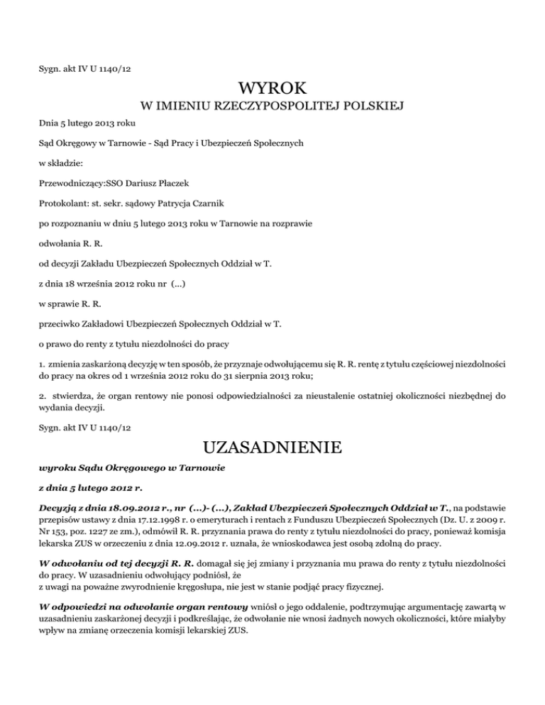 Sygn. akt IV U 1140/12 WYROK W IMIENIU RZECZYPOSPOLITEJ POLSKIEJ Dnia 5 lutego 2013 roku Sąd Okręgowy w Tarnowie - Sąd Pracy i Ubezpieczeń Społecznych w składzie: Przewodniczący:SSO Dariusz Płaczek Protokolant: st. sekr. sądowy Patrycja Czarnik po rozpoznaniu w dniu 5 lutego 2013 roku w Tarnowie na rozprawie odwołania R. R. od decyzji Zakładu Ubezpieczeń Społecznych Oddział w T. z dnia 18 września 2012 roku nr (...) w sprawie R. R. przeciwko Zakładowi Ubezpieczeń Społecznych Oddział w T. o prawo do renty z tytułu niezdolności do pracy 1. zmienia zaskarżoną decyzję w ten sposób, że przyznaje odwołującemu się R. R. rentę z tytułu częściowej niezdolności do pracy na okres od 1 września 2012 roku do 31 sierpnia 2013 roku; 2. stwierdza, że organ rentowy nie ponosi odpowiedzialności za nieustalenie ostatniej okoliczności niezbędnej do wydania decyzji. Sygn. akt IV U 1140/12 UZASADNIENIE wyroku Sądu Okręgowego w Tarnowie z dnia 5 lutego 2012 r. Decyzją z dnia 18.09.2012 r., nr (...)- (...), Zakład Ubezpieczeń Społecznych Oddział w T., na podstawie przepisów ustawy z dnia 17.12.1998 r. o emeryturach i rentach z Funduszu Ubezpieczeń Społecznych (Dz. U. z 2009 r. Nr 153, poz. 1227 ze zm.), odmówił R. R. przyznania prawa do renty z tytułu niezdolności do pracy, ponieważ komisja lekarska ZUS w orzeczeniu z dnia 12.09.2012 r. uznała, że wnioskodawca jest osobą zdolną do pracy. W odwołaniu od tej decyzji R. R. domagał się jej zmiany i przyznania mu prawa do renty z tytułu niezdolności do pracy. W uzasadnieniu odwołujący podniósł, że z uwagi na poważne zwyrodnienie kręgosłupa, nie jest w stanie podjąć pracy fizycznej. W odpowiedzi na odwołanie organ rentowy wniósł o jego oddalenie, podtrzymując argumentację zawartą w uzasadnieniu zaskarżonej decyzji i podkreślając, że odwołanie nie wnosi żadnych nowych okoliczności, które miałyby wpływ na zmianę orzeczenia komisji lekarskiej ZUS. Bezsporne w niniejszej sprawie było, że R. R., urodzony (...), z zawodu jest murarzem - tynkarzem i w zawodzie tym ostatnio pracował. Od 14.01.2009 r. do 31.08.2012 r. ubezpieczony pobierał rentę z tytułu częściowej niezdolności do pracy. W dniu 26.07.2012 r. odwołujący wystąpił do organu rentowego z wnioskiem o ponowne przyznanie mu prawa do renty z tytułu niezdolności do pracy. W orzeczeniu z dnia 16.08.2012 r. lekarz orzecznik ZUS uznał wnioskodawcę za osobę częściowo niezdolnego do pracy na okres do 28.02.2013 r. Na skutek zarzutu wadliwości, sprawa skierowana została do komisji lekarskiej ZUS, która w orzeczeniu z dnia 12.09.2012 r. stwierdziła, że wnioskodawca nie jest osobą niezdolną do pracy. Na tej podstawie, zaskarżoną decyzją z dnia 18.09.2012 r. (...) Oddział w T. odmówił R. R. przyznania prawa do renty z tytułu niezdolności do pracy. (okoliczności bezsporne) Sąd ustalił ponadto następujący stan faktyczny sprawy: W opinii sądowo- lekarskiej z dnia 04.12.2012 r. biegli sądowi neurolog i chirurg ortopeda- traumatolog stwierdzili u odwołującego: • zmiany zwyrodnieniowe kręgosłupa lędźwiowego z wielopoziomowymi dyskopatiami, • przewlekły zespół bólowy grzbietu, • przewlekłe zapalenie jelit, • stan po operacji żylaków odbytu w 2008 r., • stan po operacji niedrożności mechanicznej jelit w 2007 r., • stan po złamaniu przedramienia lewego w 2007 r., • stan po operacji wyrostka robaczkowego w 1998 r., • stan po operacji przepukliny pachwinowej lewostronnej w 1983 r. Odwołujący jest osobą częściowo niezdolną do pracy od 01.09.2012 r. na okres jednego roku. U badanego nie nastąpiła poprawa stanu zdrowia. Obserwuje się progresję skutków choroby układu ruchu. Stwierdza się ograniczenie ruchomości kręgosłupa, uszkodzenie odruchów skokowych i obecność objawów rozciągowych. Objawy te i dolegliwości bólowe znajdują uzasadnienie w obrazach kanału kręgowego z wielopoziomowymi dyskopatiami z kompresją korzeni i worka oponowego. Aktualny stan kliniczny nie pozwala badanemu na wykonywanie pracy wymagającej ogólnej dobrej sprawności fizycznej, w tym pracy w zawodzie murarza- tynkarza. Z powodu uporczywych dolegliwości bólowych odwołujący poddał się kilkakrotnie ostrzykiwaniu korzeni rdzeniowych środkiem znieczulającym. Na leczenie operacyjne dyskopatii nie wyraził zgody. Podjęcie takiego leczenia daje jedynie teoretycznie szansę na uzyskania znacznej poprawy klinicznej. dowód: • opinia sądowo- lekarska z dnia 04.12.2012 r.- k. 8-12 akt ZUS, Sąd, ustalając stan faktyczny w niniejszej sprawie, podzielił wnioski płynące z opinii biegłych sądowych neurologa i chirurga ortopedy- traumatologa, albowiem opinia ta sporządzona została w sposób rzetelny, po osobistym przebadaniu ubezpieczonego oraz bardzo szczegółowej i wszechstronnej analizie dokumentacji zgromadzonej w aktach rentowych, przy czym biegli legitymowali się fachową wiedzą oraz odpowiednim doświadczeniem zawodowym. W ocenie Sądu wnioski płynące z opinii korespondują ze zgromadzoną dokumentacją medyczną oraz bazują na wynikach przeprowadzonego badania, co czyni opinię wewnętrznie spójną, logiczną i kompletną. Opinia w sposób jednoznaczny i przejrzysty obrazuje stan zdrowia ubezpieczonego i w oparciu o aktualne wskazania wiedzy medycznej kategorycznie rozstrzyga kwestię wpływu stwierdzonych u niego schorzeń na zdolność do pracy. Z tych też powodów, Sąd w pełni podzielił wnioski wynikające z opinii sądowo - lekarskiej z dnia 04.12.2012 r. odnośnie częściowej niezdolności badanego do pracy od 01.09.2012 r. na okres jednego roku. W piśmie procesowym z dnia 24.01.2013 r., zawierającym zarzuty do opinii sądowo - lekarskiej z dnia 04.12.2012 r., organ rentowy podniósł, że opinia ta jest wewnętrznie sprzeczna, ponieważ w zakresie narządu ruchu i układu nerwowego, poza słabszym prawym odruchem skokowym oraz zniekształceniem obrysu