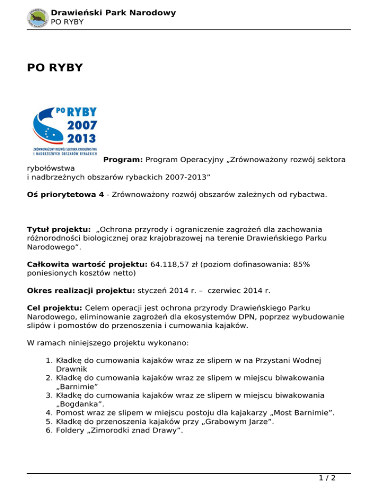 Drawieński Park Narodowy PO RYBY PO RYBY Program: Program Operacyjny „Zrównoważony rozwój sektora rybołówstwa i nadbrzeżnych obszarów rybackich 2007-2013” Oś priorytetowa 4 - Zrównoważony rozwój obszarów zależnych od rybactwa. Tytuł projektu: „Ochrona przyrody i ograniczenie zagrożeń dla zachowania różnorodności biologicznej oraz krajobrazowej na terenie Drawieńskiego Parku Narodowego”. Całkowita wartość projektu: 64.118,57 zł (poziom dofinasowania: 85% poniesionych kosztów netto) Okres realizacji projektu: styczeń 2014 r. – czerwiec 2014 r. Cel projektu: Celem operacji jest ochrona przyrody Drawieńskiego Parku Narodowego, eliminowanie zagrożeń dla ekosystemów DPN, poprzez wybudowanie slipów i pomostów do przenoszenia i cumowania kajaków. W ramach niniejszego projektu wykonano: 1. Kładkę do cumowania kajaków wraz ze slipem w na Przystani Wodnej Drawnik 2. Kładkę do cumowania kajaków wraz ze slipem w miejscu biwakowania „Barnimie” 3. Kładkę do cumowania kajaków wraz ze slipem w miejscu biwakowania „Bogdanka”. 4. Pomost wraz ze slipem w miejscu postoju dla kajakarzy „Most Barnimie”. 5. Kładkę do przenoszenia kajaków przy „Grabowym Jarze”. 6. Foldery „Zimorodki znad Drawy”. 1/2 Drawieński Park Narodowy PO RYBY Data wydruku: 04.03.2017 02:46:52 Adres URL: http://dpn.pl/po-ryby 2/2 Powered by TCPDF (www.tcpdf.org)