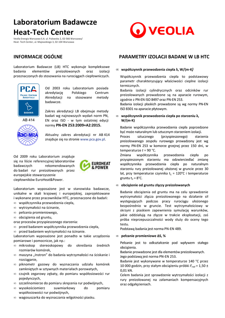 Laboratorium Badawcze Heat-Tech Center Veolia Energia Warszawa S.A. ul. Puławska 2, 02-566 Warszawa/ Heat- Tech Center, ul. Majewskiego 3, 02-104 Warszawa INFORMACJE OGÓLNE Laboratorium Badawcze (LB) HTC wykonuje kompleksowe badania elementów preizolowanych oraz izolacji przeznaczonych do stosowania na rurociągach ciepłowniczych. Od 2003 roku Laboratorium posiada akredytację Polskiego Centrum Akredytacji na stosowane metody badawcze. Zakres akredytacji LB obejmuje metody badań wg najnowszych wydań norm PN, EN oraz ISO - w tym ostatniej edycji normy PN-EN 253:2009+A2:2015. Aktualny zakres akredytacji nr AB 414 znajduje się na stronie www.pca.gov.pl. Od 2009 roku Laboratorium znajduje się na liście referencyjnej laboratoriów badawczych rekomendowanych do badań rur preizolowanych przez europejskie stowarzyszenie ciepłowników EuroHeat&Power. Laboratorium wyposażone jest w stanowiska badawcze, unikalne w skali krajowej i europejskiej, zaprojektowane i wykonane przez pracowników HTC, przeznaczone do badań: • współczynnika przewodzenia ciepła, • wytrzymałości na ścinanie, • pełzania promieniowego, • obciążenia od gruntu, oraz procesów przyspieszonego starzenia: • przed badanem współczynnika przewodzenia ciepła, • przed badaniem wytrzymałości na ścinanie. Laboratorium wyposażone jest ponadto w takie urządzenia pomiarowe i pomocnicze, jak np.: • mikroskop stereoskopowy do określania średnich rozmiarów komórek, • maszyna „Instron” do badania wytrzymałości na ściskanie i rozciąganie, • piknometr gazowy do wyznaczania udziału komórek zamkniętych w sztywnych materiałach porowatych, • czujnik zegarowy zębaty, do pomiaru współosiowości rur pojedynczych, • szczelinomierze do pomiaru skręcenia rur podwójnych, • wysokościomierz suwmiarkowy do pomiaru współosiowości rur podwójnych, • wagosuszarka do wyznaczania wilgotności piasku. PARAMETRY IZOLACJI BADANE W LB HTC • współczynnik przewodzenia ciepła λ, W/(m·K) Współczynnik przewodzenia ciepła to podstawowy parametr charakteryzujący właściwości cieplne izolacji termicznych. Badania izolacji cylindrycznych oraz odcinków rur preizolowanych prowadzone są na aparacie rurowym, zgodnie z PN-EN ISO 8497 oraz PN-EN 253. Badania izolacji płaskich prowadzone są wg normy PN-EN ISO 8301 na aparacie płytowym. • współczynnik przewodzenia ciepła po starzeniu λ, W/(m·K) Badanie współczynnika przewodzenia ciepła poprzedzone być może naturalnym lub sztucznym starzeniem izolacji. Proces sztucznego (przyspieszonego) starzenia preizolowanego zespołu rurowego prowadzony jest wg normy PN-EN 253 w komorze grzejnej przez 150 dni, w temperaturze t = 90 °C. Zmiana współczynnika przewodzenia ciepła po przyspieszonym starzeniu ma odzwierciedlać zmianę współczynnika przewodzenia ciepła po naturalnym starzeniu rury preizolowanej ułożonej w gruncie przez 30 lat, przy temperaturze czynnika t1 = 120°C i temperaturze gruntu t2 = 8°C. • obciążenie od gruntu złączy preizolowanych Badanie obciążenia od gruntu ma na celu sprawdzenie wytrzymałości złącza preizolowanego na działanie sił występujących podczas pracy rurociągu ułożonego bezpośrednio w gruncie. Test wytrzymałościowy w skrzyni z piaskiem zapewnienia symulację warunków, jakie oddziałują na złącze w trakcie eksploatacji, zaś próba nieprzepuszczalności wody służy do oceny tego testu. Podstawą badania jest norma PN-EN 489. • pełzanie promieniowe ΔS, % Pełzanie jest to odkształcenie pod wpływem stałego obciążenia. Badanie prowadzone jest dla elementów preizolowanych. Jego podstawą jest norma PN-EN 253. Badanie jest wykonywane w temperaturze 140 °C przez 10 000 godzin, przy stałym obciążeniu próbki Frad = 1,50 ± 0,01 kN. Celem badania jest sprawdzenie wytrzymałości izolacji z rury preizolowanej na załamaniach kompensacyjnych oraz odgałęzieniach. • wytrzymałość na ścinanie w kierunku osiowym i stycznym τ, MPa Badanie to ma na celu sprawdzenie zdolności systemu zespolonych rur preizolowanych do przenoszenia sił tarcia od gruntu. Podstawą badania jest norma PN-EN 253. • wytrzymałość na ścinanie po starzeniu τ, MPa Proces przyspieszonego starzenia realizowany jest przy temperaturze rury przewodowej znacznie przekraczającej rzeczywistą temperaturę pracy ciągłej pianki PUR. Zespół rurowy, którego przewidywana trwałość przy ciągłej temperaturze pracy t = 120 °C wynosi 30 lat, starzony jest w temperaturze t1 = 160 °C przez 3600 godzin lub w temperaturze t2 = 170 °C przez 1450 godzin. Podstawą badania jest norma PN-EN 253. • chłonność wody przez zanurzenie WAV, % Podstawa badania – PN-C-89084. Badanie ma na celu sprawdzenie nasiąkliwości tworzywa izolacji porowatej poprzez pomiar zmiany wyporu hydrostatycznego próbki zanurzonej w zimnej wodzie. • odchylenie od współosiowości e, mm Podstawa badania – PN-EN 253. Badanie ma na celu sprawdzenie współosiowości rury osłonowej w stosunku do rury stalowej. Odchylenie od współosiowości oznacza, że grubość izolacji w przekroju rury nie jest równomierna, a to wiąże się z utrudnieniem prawidłowego wykonania zespołu złącza. • badania rur preizolowanych podwójnych (poza zakresem akredytacji) Podstawa badania – PN-EN 253, PN-EN 826, PN-C-89071. W przypadku izolacji cylindrycznych badanie polega na określeniu wytrzymałości na ściskanie w kierunku promieniowym, przy 10% odkształceniu względnym. Podstawa badań – PN-EN 15698-1. Badania mają na celu sprawdzenie: - położenia względem siebie końców rur przewodowych, - odległości między rurami przewodowymi, - skręcenia rur przewodowych, - współosiowości rur. • wydłużenie przy zerwaniu A, % • odporność termiczna izolacji cylindrycznych Podstawa badania – PN-EN 253. Badanie poddaje się płaszcz osłonowy HDPE rur preizolowanych. Podstawa badania – procedura własna PB-01. Badanie