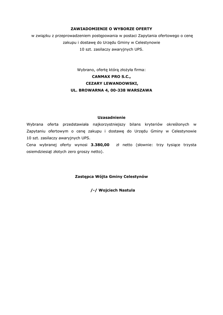 ZAWIADOMIENIE O WYBORZE OFERTY w związku z przeprowadzeniem postępowania w postaci Zapytania ofertowego o cenę zakupu i dostawę do Urzędu Gminy w Celestynowie 10 szt. zasilaczy awaryjnych UPS. Wybrano, ofertę którą złoŜyła firma: CANMAX PRO S.C., CEZARY LEWANDOWSKI, UL. BROWARNA 4, 00-338 WARSZAWA Uzasadnienie Wybrana oferta przedstawiała najkorzystniejszy bilans kryteriów określonych w Zapytaniu ofertowym o cenę zakupu i dostawę do Urzędu Gminy w Celestynowie 10 szt. zasilaczy awaryjnych UPS. Cena wybranej oferty wynosi 3.380,00 zł netto (słownie: trzy tysiące trzysta osiemdziesiąt złotych zero groszy netto). Zastępca Wójta Gminy Celestynów /-/ Wojciech Nastula