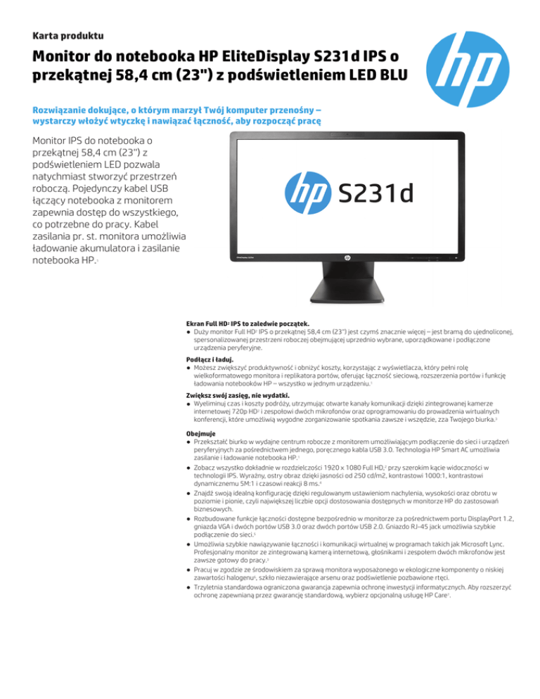 Karta produktu Monitor do notebooka HP EliteDisplay S231d IPS o przekątnej 58,4 cm (23") z podświetleniem LED BLU Rozwiązanie dokujące, o którym marzył Twój komputer przenośny – wystarczy włożyć wtyczkę i nawiązać łączność, aby rozpocząć pracę Monitor IPS do notebooka o przekątnej 58,4 cm (23'') z podświetleniem LED pozwala natychmiast stworzyć przestrzeń roboczą. Pojedynczy kabel USB łączący notebooka z monitorem zapewnia dostęp do wszystkiego, co potrzebne do pracy. Kabel zasilania pr. st. monitora umożliwia ładowanie akumulatora i zasilanie notebooka HP. 1 Ekran Full HD2 IPS to zaledwie początek. ● Duży monitor Full HD2 IPS o przekątnej 58,4 cm (23'') jest czymś znacznie więcej – jest bramą do ujednoliconej, spersonalizowanej przestrzeni roboczej obejmującej uprzednio wybrane, uporządkowane i podłączone urządzenia peryferyjne. Podłącz i ładuj. ● Możesz zwiększyć produktywność i obniżyć koszty, korzystając z wyświetlacza, który pełni rolę wielkoformatowego monitora i replikatora portów, oferując łączność sieciową, rozszerzenia portów i funkcję ładowania notebooków HP – wszystko w jednym urządzeniu.1 Zwiększ swój zasięg, nie wydatki. ● Wyeliminuj czas i koszty podróży, utrzymując otwarte kanały komunikacji dzięki zintegrowanej kamerze internetowej 720p HD2 i zespołowi dwóch mikrofonów oraz oprogramowaniu do prowadzenia wirtualnych konferencji, które umożliwią wygodne zorganizowanie spotkania zawsze i wszędzie, zza Twojego biurka.3 Obejmuje ● Przekształć biurko w wydajne centrum robocze z monitorem umożliwiającym podłączenie do sieci i urządzeń peryferyjnych za pośrednictwem jednego, poręcznego kabla USB 3.0. Technologia HP Smart AC umożliwia zasilanie i ładowanie notebooka HP.1 ● Zobacz wszystko dokładnie w rozdzielczości 1920 x 1080 Full HD,2 przy szerokim kącie widoczności w technologii IPS. Wyraźny, ostry obraz dzięki jasności od 250 cd/m2, kontrastowi 1000:1, kontrastowi dynamicznemu 5M:1 i czasowi reakcji 8 ms.4 ● Znajdź swoją idealną konfigurację dzięki regulowanym ustawieniom nachylenia, wysokości oraz obrotu w poziomie i pionie, czyli największej liczbie opcji dostosowania dostępnych w monitorze HP do zastosowań biznesowych. ● Rozbudowane funkcje łączności dostępne bezpośrednio w monitorze za pośrednictwem portu DisplayPort 1.2, gniazda VGA i dwóch portów USB 3.0 oraz dwóch portów USB 2.0. Gniazdo RJ-45 jack umożliwia szybkie podłączenie do sieci.5 ● Umożliwia szybkie nawiązywanie łączności i komunikacji wirtualnej w programach takich jak Microsoft Lync. Profesjonalny monitor ze zintegrowaną kamerą internetową, głośnikami i zespołem dwóch mikrofonów jest zawsze gotowy do pracy.3 ● Pracuj w zgodzie ze środowiskiem za sprawą monitora wyposażonego w ekologiczne komponenty o niskiej zawartości halogenu6, szkło niezawierające arsenu oraz podświetlenie pozbawione rtęci. ● Trzyletnia standardowa ograniczona gwarancja zapewnia ochronę inwestycji informatycznych. Aby rozszerzyć ochronę zapewnianą przez gwarancję standardową, wybierz opcjonalną usługę HP Care7. Karta produktu Monitor do notebooka HP EliteDisplay S231d IPS o przekątnej 58,4 cm (23") z podświetleniem LED BLU Tabela specyfikacji Oznaczenie produktu F3J72AA; F3J72AT Kolor produktu Czarny Rozmiar wyświetlacza (przekątna) 58,4 cm (23") Kąt podglądu 178° w poziomie; 178° w pionie Jasność 250 cd/m²1 Współczynnik kontrastu 1000:1 statyczny; 5000000:1 dynamiczny1 Wskaźnik odpowiedzi 7 ms (od szarości do szarości)1 Współczynnik kształtu 16:9 Rozdzielczość własna 1920 x 1080 Obsługiwane rozdzielczości 1920 x 1080; 1680 x 1050; 1600 x 900; 1440 x 900; 1280 x 1024; 1280 x 720; 1024 x 768; 800 x 600; 720 x 400; 640 x 480 Funkcje wyświetlacza Plug and Play; Powłoka antyrefleksyjna; Konfiguracja przez użytkownika; Wybór języka; Menu ekranowe; Podświetlenie LED; Obrót w pionie; Przełączanie w płaszczyźnie (IPS) Sygnał wejściowy 1 port VGA; 1 złącze DisplayPort 1.2 (z obsługą HDCP) Porty i złącza 2 porty USB 2.0; 2 porty USB 3.0; 1 gniazdo audio Moc wyjściowa Napięcie wejściowe: 100–240 V Zużycie energii Opis poboru energii elektrycznej: 60 W (maks.); 38 W (normalna praca); 2,2 W (tryb gotowości) (wyświetlacz); Rozdzielczość ekranu: 1920 x 1080 Wymiary ze stojakiem (szer. x 54,4 x 24,24 x 46,99 cm głęb. x wys.) Wymiary bez stojaka (szer. x głęb. x wys.) 54,4 x 5,1 x 32,9 cm Waga 6,12 kg Ergonomia Nachylenie: od -5 do +30°; Obrót o 360°; Wysokość: od 0 do 150 mm Certyfikaty i zgodność z przepisami CB; CE; TUV-S; EAC; CUL; FCC; CSA; NOM; S-mark; VCCI; PSB; ISC; CCC; BSMI; C-Tick; E-Standy; KC; CECP Ochrona środowiska Panel wyświetlacza niezawierający arsenu; Podświetlenie niezawierające rtęci; Niska zawartość halogenu2 Zawartość opakowania Monitor; Zasilacz zewnętrzny (150 W); Przewód USB; Kabel zasilający pr. st.; Kabel VGA; Kabel DisplayPort; Kabel pr. st. jack i gumowy pierścień; Gumowa osłona kamery internetowej; Drukowana dokumentacja i płyta CD; Oprogramowanie HP Display Assistant; Dodatkowe przewody sygnałowe (tylko w wybranych modelach, przewody różnią się w zależności od regionu) Gwarancja 3-letnia ograniczona gwarancja obejmująca 3 lata gwarancji na części i robociznę. Obowiązują pewne ograniczenia i wyłączenia. Karta produktu Monitor do notebooka HP EliteDisplay S231d IPS o przekątnej 58,4 cm (23") z podświetleniem LED BLU Akcesoria i usługi (nie wchodzą w skład zestawu) Wysięgnik do pojedynczego monitora HP Pojedyncze ramię monitora HP to doskonałe akcesorium biurkowe do przestrzeni roboczej. Eleganckie i smukłe pojedyncze ramię monitora HP zaprojektowano z myślą o uzupełnieniu stylu pracy użytkownika. Karta graficzna HP Dual Output USB Większa powierzchnia ekranu i większa wydajność pracy w konfiguracji z dwoma monitorami – dzięki 2-por