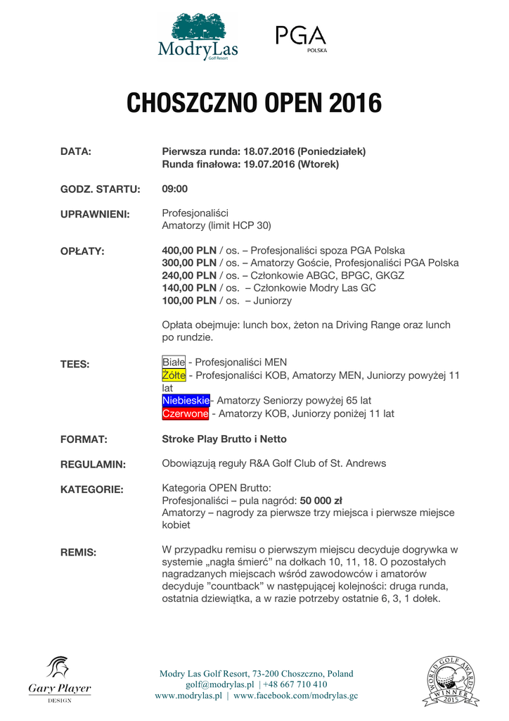 CHOSZCZNO OPEN 2016 DATA: Pierwsza runda: 18.07.2016 (Poniedziałek) Runda finałowa: 19.07.2016 (Wtorek) GODZ. STARTU: 09:00 UPRAWNIENI: Profesjonaliści Amatorzy (limit HCP 30) OPŁATY: 400,00 PLN / os. – Profesjonaliści spoza PGA Polska 300,00 PLN / os. – Amatorzy Goście, Profesjonaliści PGA Polska 240,00 PLN / os. – Członkowie ABGC, BPGC, GKGZ 140,00 PLN / os. – Członkowie Modry Las GC 100,00 PLN / os. – Juniorzy Opłata obejmuje: lunch box, żeton na Driving Range oraz lunch po rundzie. TEES: Białe - Profesjonaliści MEN Żółte - Profesjonaliści KOB, Amatorzy MEN, Juniorzy powyżej 11 lat Niebieskie- Amatorzy Seniorzy powyżej 65 lat Czerwone - Amatorzy KOB, Juniorzy poniżej 11 lat FORMAT: Stroke Play Brutto i Netto REGULAMIN: Obowiązują reguły R&A Golf Club of St. Andrews KATEGORIE: Kategoria OPEN Brutto: Profesjonaliści – pula nagród: 50 000 zł Amatorzy – nagrody za pierwsze trzy miejsca i pierwsze miejsce kobiet REMIS: W przypadku remisu o pierwszym miejscu decyduje dogrywka w systemie „nagła śmierć” na dołkach 10, 11, 18. O pozostałych nagradzanych miejscach wśród zawodowców i amatorów decyduje ”countback” w następującej kolejności: druga runda, ostatnia dziewiątka, a w razie potrzeby ostatnie 6, 3, 1 dołek. Modry Las Golf Resort, 73-200 Choszczno, Poland [email protected] | +48 667 710 410 www.modrylas.pl | www.facebook.com/modrylas.gc