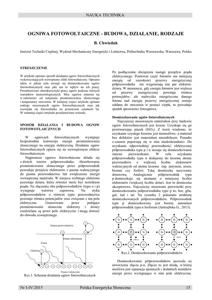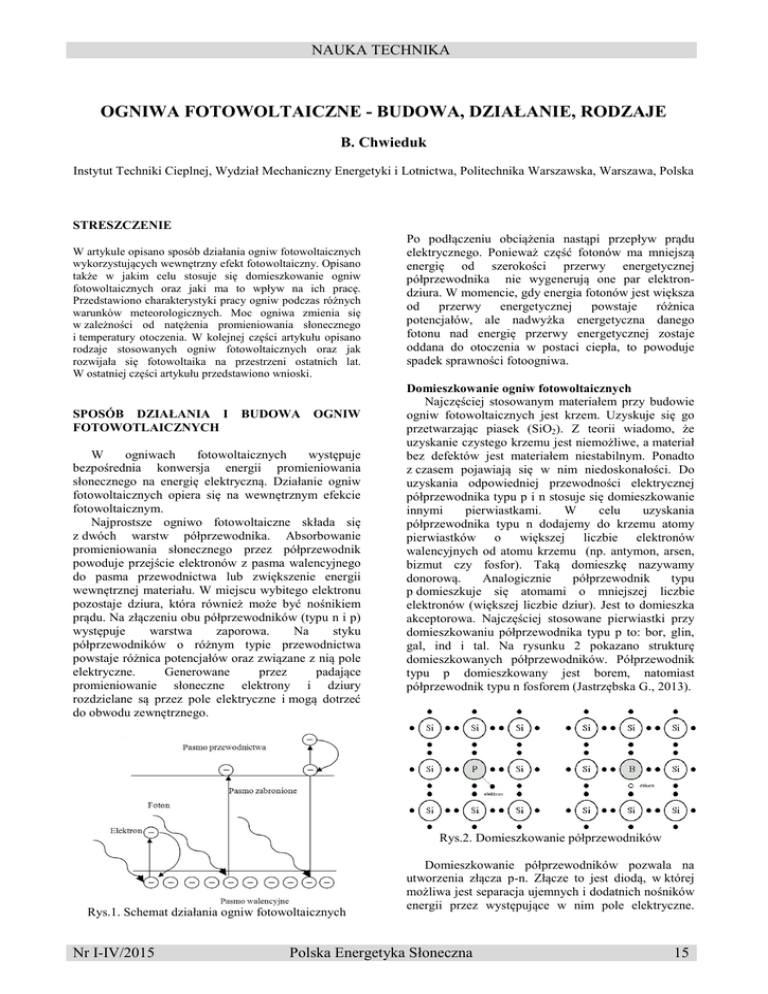NAUKA TECHNIKA OGNIWA FOTOWOLTAICZNE - BUDOWA, DZIAŁANIE, RODZAJE B. Chwieduk Instytut Techniki Cieplnej, Wydział Mechaniczny Energetyki i Lotnictwa, Politechnika Warszawska, Warszawa, Polska STRESZCZENIE W artykule opisano sposób działania ogniw fotowoltaicznych wykorzystujących wewnętrzny efekt fotowoltaiczny. Opisano także w jakim celu stosuje się domieszkowanie ogniw fotowoltaicznych oraz jaki ma to wpływ na ich pracę. Przedstawiono charakterystyki pracy ogniw podczas różnych warunków meteorologicznych. Moc ogniwa zmienia się w zależności od natężenia promieniowania słonecznego i temperatury otoczenia. W kolejnej części artykułu opisano rodzaje stosowanych ogniw fotowoltaicznych oraz jak rozwijała się fotowoltaika na przestrzeni ostatnich lat. W ostatniej części artykułu przedstawiono wnioski. SPOSÓB DZIAŁANIA I FOTOWOTLAICZNYCH BUDOWA OGNIW W ogniwach fotowoltaicznych występuje bezpośrednia konwersja energii promieniowania słonecznego na energię elektryczną. Działanie ogniw fotowoltaicznych opiera się na wewnętrznym efekcie fotowoltaicznym. Najprostsze ogniwo fotowoltaiczne składa się z dwóch warstw półprzewodnika. Absorbowanie promieniowania słonecznego przez półprzewodnik powoduje przejście elektronów z pasma walencyjnego do pasma przewodnictwa lub zwiększenie energii wewnętrznej materiału. W miejscu wybitego elektronu pozostaje dziura, która również może być nośnikiem prądu. Na złączeniu obu półprzewodników (typu n i p) występuje warstwa zaporowa. Na styku półprzewodników o różnym typie przewodnictwa powstaje różnica potencjałów oraz związane z nią pole elektryczne. Generowane przez padające promieniowanie słoneczne elektrony i dziury rozdzielane są przez pole elektryczne i mogą dotrzeć do obwodu zewnętrznego. Po podłączeniu obciążenia nastąpi przepływ prądu elektrycznego. Ponieważ część fotonów ma mniejszą energię od szerokości przerwy energetycznej półprzewodnika nie wygenerują one par elektrondziura. W momencie, gdy energia fotonów jest większa od przerwy energetycznej powstaje różnica potencjałów, ale nadwyżka energetyczna danego fotonu nad energię przerwy energetycznej zostaje oddana do otoczenia w postaci ciepła, to powoduje spadek sprawności fotoogniwa. Domieszkowanie ogniw fotowoltaicznych Najczęściej stosowanym materiałem przy budowie ogniw fotowoltaicznych jest krzem. Uzyskuje się go przetwarzając piasek (SiO2). Z teorii wiadomo, że uzyskanie czystego krzemu jest niemożliwe, a materiał bez defektów jest materiałem niestabilnym. Ponadto z czasem pojawiają się w nim niedoskonałości. Do uzyskania odpowiedniej przewodności elektrycznej półprzewodnika typu p i n stosuje się domieszkowanie innymi pierwiastkami. W celu uzyskania półprzewodnika typu n dodajemy do krzemu atomy pierwiastków o większej liczbie elektronów walencyjnych od atomu krzemu (np. antymon, arsen, bizmut czy fosfor). Taką domieszkę nazywamy donorową. Analogicznie półprzewodnik typu p domieszkuje się atomami o mniejszej liczbie elektronów (większej liczbie dziur). Jest to domieszka akceptorowa. Najczęściej stosowane pierwiastki przy domieszkowaniu półprzewodnika typu p to: bor, glin, gal, ind i tal. Na rysunku 2 pokazano strukturę domieszkowanych półprzewodników. Półprzewodnik typu p domieszkowany jest borem, natomiast półprzewodnik typu n fosforem (Jastrzębska G., 2013). Rys.2. Domieszkowanie półprzewodników Rys.1. Schemat działania ogniw fotowoltaicznych Nr I-IV/2015 Domieszkowanie półprzewodników pozwala na utworzenia złącza p-n. Złącze to jest diodą, w której możliwa jest separacja ujemnych i dodatnich nośników energii przez występujące w nim pole elektryczne. Polska Energetyka Słoneczna 15 NAUKA TECHNIKA W przypadku braku złącza nośniki nie docierałyby do obwodu zewnętrznego, a jedynie rekombinowały. OKREŚLANIE MOCY ORAZ SPRAWNOŚCI OGNIW Aby umożliwić producentom i konsumentom porównywanie poszczególnych modułów fotowoltaicznych badania ich mocy i sprawności przeprowadza się w ściśle określonych warunkach. Jednocześnie przy określaniu mocy i sprawności tworzy się wykresy zależności napięcia od prądu tzw. charakterystyki napięciowo-prądowe oraz napięcia od mocy. Warunki STC (Standard Test Conditions) w jakich bada się ogniwa fotowoltaiczne są następujące (Szymański B., 2013): • natężenie promieniowania słonecznego podczas badania ogniw wynosi 1000 W/m2, • temperatura otoczenia wynosi 25oC, • masa optyczna atmosfery wynosi AM 1,5. Producenci modułów fotowoltaicznych często podają sprawność i moc modułów także w warunkach NOCT (Normal Operating Cell Temperature). Moc ogniwa fotowoltaicznego wyznaczana w warunkach NOCT jest niższa od mocy tego samego ogniwa badanego w warunkach STC. W przypadku badania ogniw fotowoltaicznych w warunkach NOCT wyznaczana jest temperatura modułu przy następujących warunkach atmosferycznych: • natężenie promieniowania słonecznego podczas badania ogniw wynosi 800 W/m2, • temperatura otoczenia wynosi 20oC, • masa optyczna wynosi AM 1,5, • prędkość wiatru 1 m/s. Parametry modułów wyznaczone w warunkach NOCT są bliższe rzeczywistym, osiąganym podczas normalnego użytkowania. Współczynnik optycznej masy atmosfery (powietrza) (Air Mass) jest miarą długości drogi przebytej przez promieniowanie słoneczne w atmosferze. Natężenie promieniowania słonecznego słabnie w atmosferze, ponieważ podczas przechodzenia przez atmosferę ulega rozproszeniu, odbiciu oraz pochłonięciu. Im dłuższa droga promieniowania słonecznego docierającego do poziomu morza tym niższe jest jego natężenie. AM 0 dotyczy promieniowania poza atmosferą, AM równe jest 1 dla Słońca w zenicie, a AM równe 1,5 odpowiada kątowi wzniesienia Słońca równemu 48,2°, przy kącie azymutalnym równym 0°. Na rysunku 3 przedstawiono wartości współczynnika optyczn