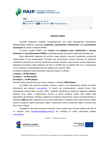 PROJEKT INNEO Poznański Akademicki Inkubator Przedsiębiorczości oraz Urząd Marszałkowski Województwa Wielkopolskiego serdecznie zapraszają studentów, absolwentów, doktorantów oraz pracowników naukowych do udziału w projekcie INNEO. W ramach projektu INNEO rusza konkurs na najlepsze prace akademickie z zakresu innowacji oraz gra internetowa INNEO, przybliżającą zasady prowadzenia działalności gospodarczej. Prace akademickie zgłaszane do konkursu mogą dotyczyć innowacji produktowej, procesowej, organizacyjnej czy też marketingowej. Tematyka prac konkursowych powinna cechować się praktyczną możliwością wdrożenia na rynek lub/i wyróżniać się wysokim stopniem innowacyjności samego zagadnienia. Zgłoszenie do konkursu należy dostarczyć do dnia 31.10.2009 roku do siedziby PAIP przy ul. Słowackiego 17/12 w Poznaniu. Rozstrzygnięcie konkursu odbędzie się w grudniu 2009r. Dla autorów najlepszych prac przewidziano nagrody pieniężne o wartości: I miejsce – 20 000 złotych II miejsce – 15 000 złotych III miejsce – 10 000 złotych Promotor każdej nagrodzonej pracy otrzyma nagrodę w wysokości 5000 złotych. Gra INNEO, jako drugi filar projektu, startuje w maju br. Gra zamieszczona zostanie na stronie internetowej pod adresem www.inneo.pl. W ramach gry przeprowadzony zostanie turniej, który rozstrzygnięty zostanie także w grudniu 2009r. Zadaniem Uczestnika gry będzie jak najlepsze zarządzanie wirtualną firmą. Każdy z Użytkowników otrzyma na starcie określony kapitał, który będzie mógł odpowiednio zainwestować. Dziesięciu najlepszych wirtualnych biznesmenów, otrzyma nagrodę pieniężną w wysokości 2000 zł każdy. Zgłoszenie do gry można dokonywać w wybranym przez siebie terminie, jednak szansę na wygranie nagród pieniężnych mają ci Użytkownicy, którzy uczestniczyć będą w turnieju przez okres trzech miesięcy. Szczegółowe informacje dotyczące konkursów można uzyskać pod numerem telefonu 061 665 76 74, adresem email [email protected] lub wchodząc na stronę internetową projektu www.inneo.pl. Człowiek – najlepsza inwestycja Projekt współfinansowany ze środków Unii Europejskiej w ramach Europejskiego Funduszu Społecznego