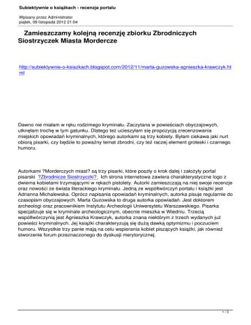 Subiektywnie o książkach - recenzja portalu Wpisany przez Administrator piątek, 09 listopada 2012 21:04 Zamieszczamy kolejną recenzję zbiorku Zbrodniczych Siostrzyczek Miasta Mordercze http://subiektywnie-o-ksiazkach.blogspot.com/2012/11/marta-guzowska-agnieszka-krawczyk.ht ml Dawno nie miałam w ręku rodzimego kryminału. Zaczytana w powieściach obyczajowych, utknęłam trochę w tym gatunku. Dlatego też ucieszyłam się propozycją zrecenzowania miejskich opowiadań kryminalnych, którego autorkami są trzy kobiety. Byłam ciekawa jaki nurt obiorą pisarki, czy będzie to poważny temat zbrodni, czy też raczej element groteski i czarnego humoru. Autorkami ?Morderczych miast? są trzy pisarki, które poszły o krok dalej i założyły portal pisarski ?Zbrodnicze Siostrzyczki?. Ich strona internetowa zawiera charakterystyczne logo z dwiema kobietami trzymającymi w rękach pistolety. Autorki zamieszczają na niej swoje recenzje oraz nowości ze świata literackiego kryminału. Jedną ze współtwórczyń portalu i książki jest Adrianna Michalewska. Oprócz napisania opowiadań kryminalnych, autorka pisuje regularnie do czasopism obyczajowych. Marta Guzowska to druga autorka opowiadań. Jest doktorem archeologi oraz pracownikiem Instytutu Archeologii Uniwersytetu Warszawskiego. Pisarka specjalizuje się w kryminale archeologicznym, obecnie mieszka w Wiedniu. Trzecią współtwórczynią jest Agnieszka Krawczyk, autorka znana niektórym z trzech wydanych już powieści kryminalnych. Jej książki charakteryzują się dużą dawką optymizmu i poczuciem humoru. Wszystkie trzy panie mają na celu wspierania kobiet piszących książki, jak również stworzenie forum przeznaczonego do dyskusji merytorycznej. 1/3 Subiektywnie o książkach - recenzja portalu Wpisany przez Administrator piątek, 09 listopada 2012 21:04 Warszawa, Kraków i Wrocław, trzy najpiękniejsze i najbardziej reprezentacyjne miasta Polski zostały wybrane przez autorki jako tło ich opowiadań nieprzypadkowo. Piękne, zabytkowe kamienice i parki kryją w sobie grozę i zbrodnię. Nawet w tak cudownych miejscach nikt nie jest bezpieczny. Marta Guzowska otwiera antologię trzema opowiadaniami dotyczącymi Warszawy. Przejedziecie się pociągiem podmiejskim, w którym pasażerowie nie są tymi na których wyglądają, znajdziecie garaż w którym dokonano morderstwa oraz przekonacie się, że segregacja śmieci nie zawsze jest bezpieczna. Kolejne trzy opowiadania to morderczy Kraków ukazany przez Agnieszkę Krawczyk. Znajdziecie w nich zbrodnie inspirowane sztukami Szekspira, morderstwo związane z nocną linią autobusową, którą rozgryza emerytowany policjant z psem o imieniu Arszenik oraz przestrogę dotycząca zapisywanie się na wycieczki z nieznajomymi sobie ludźmi. Tomik zamyka Adrianna Michalewska i jej morderczy Wrocław. Poznacie w tej części detektywa Karola Nemeca, który próbuje rozwikłać zagadkę altarzysty sprzed pięciuset laty. Jego zadaniem będzie również śledztwo dotyczące starego, neobarokowego hotelu w którym podobno straszy oraz sprawa tajemniczych zabójstw franciszkanów w postaci podpalenia. Jak widać każde opowiadanie wyróżnia się czymś innym. Marta Guzowska w przemyślany sposób dociera do czytelnika poprzez ujęcie tematu zbrodni w sposób troszkę prześmiewczy, troszkę groteskowy. Jej opowiadanie pt. ?Śmieci? jest genialne. Postacie: ucznia Komara i mordercy młodziutkiej dziewczyny są banalne, ale zarazem przyciągają uwagę czytelnika. A zakończenie tego utworu to mistrzostwo. Przy okazji tej historii przypomniały mi się odcinki kiedyś popularnego filmu odcinkowego pt.: ?Opowieści z krypty?. Ten sam klimat zawierają utwory napisane przez Martę Guzowską, zapadają w pamięć. Agnieszka Krawczyk stwarzając postać emerytowanego policjanta, który pisze kryminały i przy okazji pomaga policji rozwikłać zagadkę tajemniczych morderstw, nasunęła mi skojarzenie z typowymi kryminałami z epoki lat PRL-u. Powrót do tego specyficznego klimatu był bardzo przyjemny. Dzięki niej postanowiłam powrócić do zaczytywanych kiedyś przeze mnie nałogowo kryminałów z serii z Jamnikiem. Z trzech opowiadań zaprezentowanych przez autorkę polecam ?Nocną linię?. Dlaczego akurat ten utwór? Miejskie klimaty w połączeniu z nadkomisarzem Wroną to świetna hybryda. Morderczy Wrocław jaki przedstawiła Adrianna Michalewska ujął mnie połączeniem zbrodni z dawną historią. Okazuje się, że nie zawsze przeszłość to zapomniana historia, czasami stare dzieje dopadają teraźniejszość. W tym przypadku giną niewinni ludzie, których tajemnicze śmierci stara się wyjaśnić prywatny detektyw. Opowiadanie pt.: ?Monopol? dotyczące starego hotelu, czytane wieczorem, będąc samemu w domu, może przyprawić o gęsią skórkę. Od teraz inaczej będę patrzeć na kelnerów w zabytkowych restauracjach. I to opowiadanie wam najbardziej polecam. 2/3 Subiektywnie o książkach - recenzja portalu Wpisany przez Administrator piątek, 09 listopada 2012 21:04 Bardzo ciekawą inicjatywą jest połączenie trzech miast naszego kraju, dziewięciu opowiadań kryminalnych, tak różnych pod wieloma względami z trzema różnymi autorkami, z których każda reprezentuje inny styl pisania. Myślę, że każdy znajdzie w tych utworach coś dla siebie. A sympatycy kryminałów, tacy jak ja docenią fantazję autorek. Wiem, że nie wszyscy lubią czytać krótkie formy jakimi są opowiadania, ja też w niektórych utworach napisałabym więcej, dodała parę faktów, ubarwiła fabułę, ale czasami poznając kilka ujęć i kontekstów, łatwiej nam ocenić warsztat pisarski autora. Tak też było w przypadku tej antologii. Cieszę się, że powstała taka książka, że miejski kryminał ma jeszcze na naszym rynku wierne grono czytelników. Tym bardziej, że autorkami są kobiety. Nie będę szukać na siłę minusów, gdyż generalnie styl wszystkich trzech Pań mi w zupe