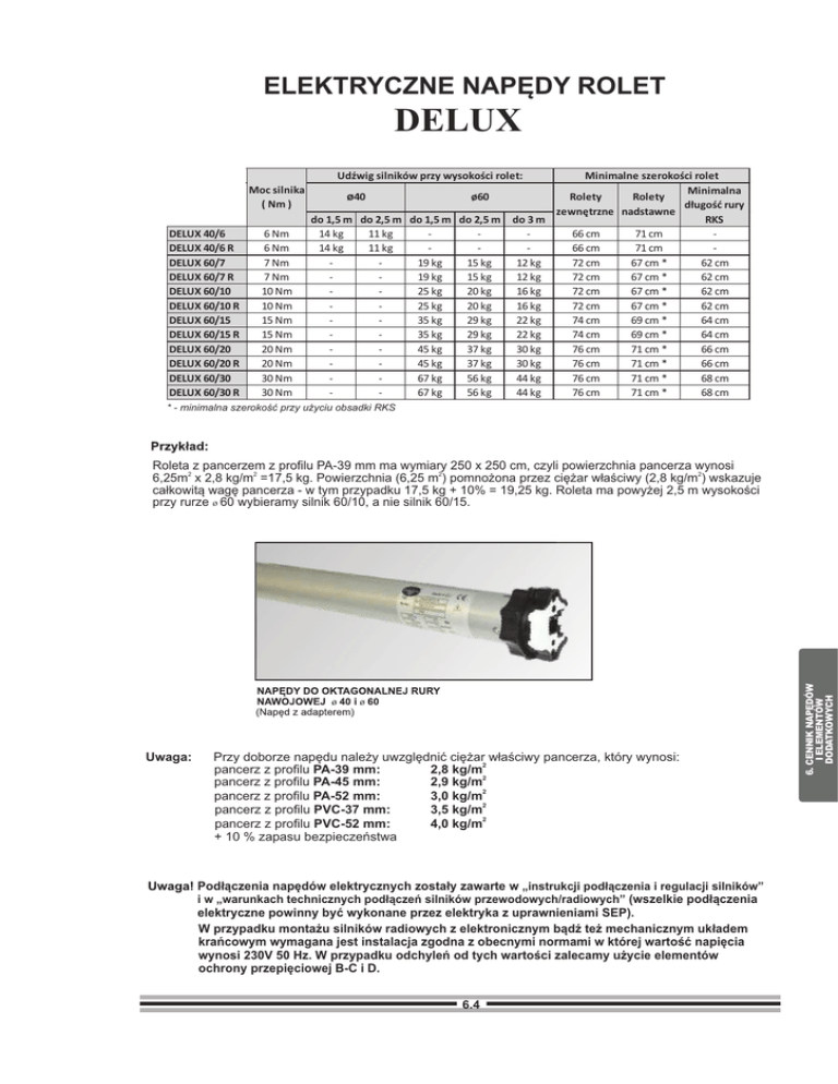 ELEKTRYCZNE NAPĘDY ROLET DELUX Moc silnika ( Nm ) DELUX 40/6 DELUX 40/6 R DELUX 60/7 DELUX 60/7 R DELUX 60/10 DELUX 60/10 R DELUX 60/15 DELUX 60/15 R DELUX 60/20 DELUX 60/20 R DELUX 60/30 DELUX 60/30 R 6 Nm 6 Nm 7 Nm 7 Nm 10 Nm 10 Nm 15 Nm 15 Nm 20 Nm 20 Nm 30 Nm 30 Nm Udźwig silników przy wysokości rolet: ø40 ø60 do 1,5 m do 2,5 m do 1,5 m do 2,5 m 14 kg 11 kg 14 kg 11 kg 19 kg 15 kg 19 kg 15 kg 25 kg 20 kg 25 kg 20 kg 35 kg 29 kg 35 kg 29 kg 45 kg 37 kg 45 kg 37 kg 67 kg 56 kg 67 kg 56 kg Minimalne szerokości rolet Minimalna Rolety Rolety długość rury zewnętrzne nadstawne do 3 m RKS 66 cm 71 cm 66 cm 71 cm 12 kg 72 cm 67 cm * 62 cm 12 kg 72 cm 67 cm * 62 cm 16 kg 72 cm 67 cm * 62 cm 16 kg 72 cm 67 cm * 62 cm 22 kg 74 cm 69 cm * 64 cm 22 kg 74 cm 69 cm * 64 cm 30 kg 76 cm 71 cm * 66 cm 30 kg 76 cm 71 cm * 66 cm 44 kg 76 cm 71 cm * 68 cm 44 kg 76 cm 71 cm * 68 cm * - minimalna szerokość przy użyciu obsadki RKS Uwaga: Przy doborze napędu należy uwzględnić ciężar właściwy pancerza, który wynosi: pancerz z profilu PA-39 mm: 2,8 kg/m2 pancerz z profilu PA-45 mm: 2,9 kg/m2 pancerz z profilu PA-52 mm: 3,0 kg/m2 pancerz z profilu PVC-37 mm: 3,5 kg/m2 2 pancerz z profilu PVC-52 mm: 4,0 kg/m + 10 % zapasu bezpieczeństwa Podłączenia napędów elektrycznych zostały zawarte w „instrukcji podłączenia i regulacji silników” i w „warunkach technicznych podłączeń silników przewodowych/radiowych” (wszelkie podłączenia elektryczne powinny być wykonane przez elektryka z uprawnieniami SEP). W przypadku montażu silników radiowych z elektronicznym bądź też mechanicznym układem krańcowym wymagana jest instalacja zgodna z obecnymi normami w której wartość napięcia wynosi 230V 50 Hz. W przypadku odchyleń od tych wartości zalecamy użycie elementów ochrony przepięciowej B-C i D. 6.4 6. CENNIK NAPĘDÓW I ELEMENTÓW DODATKOWYCH Roleta z pancerzem z profilu PA-39 mm ma wymiary 250 x 250 cm, czyli powierzchnia pancerza wynosi 6,25m2 x 2,8 kg/m2 =17,5 kg. Powierzchnia (6,25 m2) pomnożona przez ciężar właściwy (2,8 kg/m2) wskazuje całkowitą wagę pancerza - w tym przypadku 17,5 kg + 10% = 19,25 kg. Roleta ma powyżej 2,5 m wysokości przy rurze ø 60 wybieramy silnik 60/10, a nie silnik 60/15.