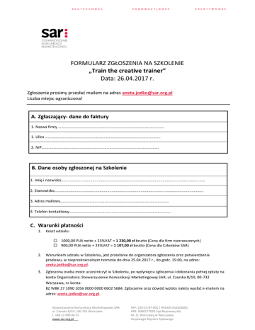 FORMULARZ ZGŁOSZENIA NA SZKOLENIE „Train the creative trainer” Data: 26.04.2017 r. Zgłoszenie prosimy przesłać mailem na adres [email protected] Liczba miejsc ograniczona! A. Zgłaszający- dane do faktury 1. Nazwa firmy …………………………………………………………………………………………….. 1. Ulica ……………………………………………………………………………………………………... 2. NIP……………………………………………………………………………………………………….. B. Dane osoby zgłoszonej na Szkolenie 1. Imię i nazwisko..................................................................................................................................... 2. Stanowisko.......................................................................................................................................... 3. Adres mailowy……………………………………………………………………………………………….. 4. Telefon kontaktowy…………………………………………………………………………………………. C. Warunki płatności 1. Koszt udziału: 1000,00 PLN netto + 23%VAT = 1 230,00 zł brutto (Cena dla firm niezrzeszonych) 900,00 PLN netto + 23%VAT = 1 107,00 zł brutto (Cena dla Członków SAR) 2. Warunkiem udziału w Szkoleniu, jest przesłanie do organizatora zgłoszenia oraz potwierdzenia przelewu, w nieprzekraczalnym terminie do dnia 25.04.2017 r., do godz. 15:00, na adres: [email protected]. 3. Zgłoszona osoba może uczestniczyć w Szkoleniu, po wpłynięciu zgłoszenia i dokonaniu pełnej opłaty na konto Organizatora: Stowarzyszenie Komunikacji Marketingowej SAR, ul. Czerska 8/10, 00-732 Warszawa, nr konta: BZ WBK 27 1090 1056 0000 0000 0602 5684. Zgłoszenie oraz dowód wpłaty należy wysłać e-mailem na adres: [email protected]. Stowarzyszenie Komunikacji Marketingowej SAR ul. Czerska 8/10 | 00-732 Warszawa t. +48 22 898 84 25 www.sar.org.pl NIP: 526-23-97-001 | REGON 016102001 KRS: 0000177032 Sąd Rejonowy dla M. St. Warszawy w Warszawie, Krajowego Rejestru Sądowego 4. Osoby i firmy obowiązane są dopełniać we własnym zakresie wszelkiego obiegu dokumentów, potrzebnych do uiszczenia płatności za szkolenie. Organizator nie ponosi odpowiedzialności za niedopełnienie przez pracowników firm procedur zamówień ( purchase order). Jednoznacznym zgłoszeniem udziału w szkoleniu, jest podpisanie formularza zgłoszeniowego. W związku z powyższym, na formularzach zgłoszeniowych wymagany jest podpis osoby odpowiedzialnej za zgłoszenie, oraz osoby odpowiedzialnej za kwestie finansowe firmy. UWAGA! 1. 2. W przypadku, gdy zgłoszenie następuje na mniej niż 3 dni przed szkoleniem, należy opłacić jak najszybciej udział oraz przesłać do organizatora potwierdzenie przelewu na adres: [email protected] REZYGNACJA: W przypadku rezygnacji z udziału w szkoleniu do dnia 24.04.2017r. organizator pobierze 50% opłaty za dotychczasowe usługi przygotowawcze do szkolenia; w przypadku rezygnacji w dniach 25-26.04.2017 r. organizator pobierze od Zgłaszającego pełną opłatę za dotychczasowe usługi przygotowawcze do szkolenia. Uczestnik szkolenia zgadza się niniejszym na umieszczenie swoich danych osobowych w bazie danych Stowarzyszenia Komunikacji Marketingowej SAR, z siedzibą w Warszawie, w celu realizacji zamówienia oraz ich przetwarzanie dla potrzeb informacyjnych i marketingowych związanych z działalnością SAR ( zgodnie z ustawą z dnia 29.08.1997 r. o ochronie danych osobowych Dz. U. Nr 133, POZ. 883). W imieniu Zgłaszającego oświadczam, że nasza firma jest płatnikiem podatku od towarów i usług VAT. W imieniu Zgłaszającego upoważniam: Stowarzyszenie Komunikacji Marketingowej SAR, ul. Czerska 8/10, 00-732 Warszawa, NIP: 526-23-97-001 do wystawienia faktury VAT. W imieniu Zgłaszającego i jako Uczestnik przyjmuję warunki zgłoszenia na Szkolenie i zobowiązujemy się do terminowej zapłaty. Zgadzam się na umieszczenie moich danych osobowych w bazie danych SAR oraz ich wykorzystywanie w celach marketingowych i promocyjnych. Informujemy, że przysługuje Państwu prawo do wglądu i poprawiania zgromadzonych danych zgodnie z ustawą z dnia 29.08.1997 r. o ochronie danych osobowych Dz. U. Nr 133, poz. 883). Jednocześnie zgadzam się na otrzymywanie informacji handlowych od SAR droga elektroniczną. ..................................... Data Pieczęć firmowa Zgłaszającego Stowarzyszenie Komunikacji Marketingowej SAR ul. Czerska 8/10 | 00-732 Warszawa t. +48 22 898 84 25 www.sar.org.pl Podpis osoby upoważnionej NIP: 526-23-97-001 | REGON 016102001 KRS: 0000177032 Sąd Rejonowy dla M. St. Warszawy w Warszawie, Krajowego Rejestru Sądowego