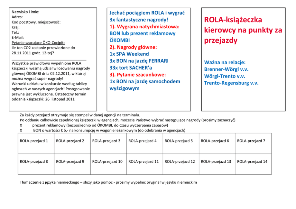 Nazwisko i imie: Adres: Kod pocztowy, miejscowość: Kraj: Ö Tel.: E-Mail: Pytanie szacujące ÖKO-Cocjpit: Ile ton CO2 zostanie przewiezione do 28.11.2011 godz. 12-tej? Wszystkie prawidłowo wypełnione ROLA książeczki wezmą udział w losowaniu nagrody głównej ÖKOMBI dnia 02.12.2011, w której można wygrać super nagrody! Warunki udziału w konkursie według tablicy ogłoszeń w naszych agencjach! Postępowanie prawne jest wykluczone. Ostateczny termin oddania książeczki: 26 listopad 2011 Jechać pociągiem ROLA i wygrać 3x fantastyczne nagrody! 1). Wygrana natychmiastowa: BON lub prezent reklamowy ÖKOMBI 2). Nagrody główne: 1x SPA Weekend 3x BON na jazdę FERRARI 33x tort SACHER’a 3). Pytanie szacunkowe: 1x BON na jazdę samochodem wyścigowym ROLA-książeczka kierowcy na punkty za przejazdy Ważna na relacje: Brenner-Wörgl v.v. Wörgl-Trento v.v. Trento-Regensburg v.v. Za każdy przejazd otrzymuje się stempel w danej agencji na terminalu. Po oddaniu całkowicie zapełnionej książeczki w agencjach, możecie Państwo wybrać następujące nagrody (prosimy zaznaczyć) X prezent reklamowy (bezpośrednio od ÖKOMBI, do czasu wyczerpania zapasów) X BON o wartości € 5,- na konsumpcję w wagonie leżankowym (do odebrania w agencjach) ROLA-przejazd 1 ROLA-przejazd 2 ROLA-przejazd 3 ROLA-przejazd 4 ROLA-przejazd 5 ROLA-przejazd 6 ROLA-przejazd 7 ROLA-przejazd 8 ROLA-przejazd 9 ROLA-przejazd 10 ROLA-przejazd 11 ROLA-przejazd 12 ROLA-przejazd 13 ROLA-przejazd 14 Tłumaczenie z języka niemieckiego – służy jako pomoc - prosimy wypelnic oryginał w języku niemieckim