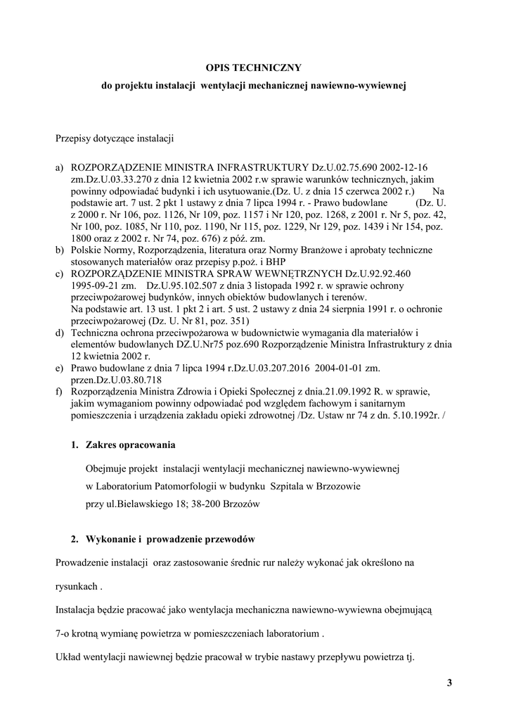 OPIS TECHNICZNY do projektu instalacji wentylacji mechanicznej nawiewno-wywiewnej Przepisy dotyczące instalacji a) ROZPORZĄDZENIE MINISTRA INFRASTRUKTURY Dz.U.02.75.690 2002-12-16 zm.Dz.U.03.33.270 z dnia 12 kwietnia 2002 r.w sprawie warunków technicznych, jakim powinny odpowiadać budynki i ich usytuowanie.(Dz. U. z dnia 15 czerwca 2002 r.) Na podstawie art. 7 ust. 2 pkt 1 ustawy z dnia 7 lipca 1994 r. - Prawo budowlane (Dz. U. z 2000 r. Nr 106, poz. 1126, Nr 109, poz. 1157 i Nr 120, poz. 1268, z 2001 r. Nr 5, poz. 42, Nr 100, poz. 1085, Nr 110, poz. 1190, Nr 115, poz. 1229, Nr 129, poz. 1439 i Nr 154, poz. 1800 oraz z 2002 r. Nr 74, poz. 676) z póź. zm. b) Polskie Normy, Rozporządzenia, literatura oraz Normy Branżowe i aprobaty techniczne stosowanych materiałów oraz przepisy p.poż. i BHP c) ROZPORZĄDZENIE MINISTRA SPRAW WEWNĘTRZNYCH Dz.U.92.92.460 1995-09-21 zm. Dz.U.95.102.507 z dnia 3 listopada 1992 r. w sprawie ochrony przeciwpożarowej budynków, innych obiektów budowlanych i terenów. Na podstawie art. 13 ust. 1 pkt 2 i art. 5 ust. 2 ustawy z dnia 24 sierpnia 1991 r. o ochronie przeciwpożarowej (Dz. U. Nr 81, poz. 351) d) Techniczna ochrona przeciwpożarowa w budownictwie wymagania dla materiałów i elementów budowlanych DZ.U.Nr75 poz.690 Rozporządzenie Ministra Infrastruktury z dnia 12 kwietnia 2002 r. e) Prawo budowlane z dnia 7 lipca 1994 r.Dz.U.03.207.2016 2004-01-01 zm. przen.Dz.U.03.80.718 f) Rozporządzenia Ministra Zdrowia i Opieki Społecznej z dnia.21.09.1992 R. w sprawie, jakim wymaganiom powinny odpowiadać pod względem fachowym i sanitarnym pomieszczenia i urządzenia zakładu opieki zdrowotnej /Dz. Ustaw nr 74 z dn. 5.10.1992r. / 1. Zakres opracowania Obejmuje projekt instalacji wentylacji mechanicznej nawiewno-wywiewnej w Laboratorium Patomorfologii w budynku Szpitala w Brzozowie przy ul.Bielawskiego 18; 38-200 Brzozów 2. Wykonanie i prowadzenie przewodów Prowadzenie instalacji oraz zastosowanie średnic rur należy wykonać jak określono na rysunkach . Instalacja będzie pracować jako wentylacja mechaniczna nawiewno-wywiewna obejmującą 7-o krotną wymianę powietrza w pomieszczeniach laboratorium . Układ wentylacji nawiewnej będzie pracował w trybie nastawy przepływu powietrza tj. 3 Nastawy na sterowniku programowalnym będą umożliwiały pracę centrali wentylacyjnej, ze stałą regulacją obrotów na wentylatorach nawiewnych i wywiewnych. Na kanale wentylacyjnym nawiewnym i wywiewnym należy zamontować przetworniki ciśnienia, regulacja sterowania na sterowniku programowalnym. Tryb pracy w/w układu wentylacyjnego jest bardzo istotny dla zachowania prawidłowej pracy wentylacji mechanicznej nawiewno-wywiewnej . Z uwagi na zmienny i zróżnicowany charakter poboru powietrza do pomieszczeń w których znajdują się dygestoria laboratoryjne. Regulacja wentylatorów wyciągowych będzie odbywać się przez przetwornik częstotliwości - nastawy wydajności wentylatora wyciągowego dachowego - załączenie i wyłączanie przez panel naścienny. oznaczony na rys. nr 1 symbolem "on/off". Załączenie włącznika w pozycji "on"- uruchamia wentylator wyciągowy oraz równocześnie uruchamia siłownik przepustnicy wielopłaszczynowej - otwierając zredukowany przepływ powietrza, do określonej wydajności przepływu. Falowniki wentylatorów dachowych oraz listwę przekaźników umieścić w wentylowanej szafce. Zastosowanie przepustnic wielopłaszczyznowych na instalacji nawiewnej jest konieczne dla zachowania prawidłowej i precyzyjnej regulacji . Na każdym odgałęzieniu należy zastosować filtry absolutne H13.Stopień zabrudzenia filtrów będzie realizowany przez komunikację dla zastosowanego na filtrze presostatu ciśnieniowego, który będzie wysyłał informację o stanie czystości poszczególnego filtra do sterownika centrali wentylacyjnej. System wentylacji zaprojektowano jako układ równoważny . Nawiew powietrza będzie odbywał się w pomieszczeniach niskich o wys. 2,92 m. przez kratki typu: - A/IV - kratka z jednym rzędem kierownic powietrza w układzie poziomym z przepustnicą i osłoną z siatki. 4 - Nawienik laminarny z filtrem absolutnym H13 Typ NSL-1/4 wyd. 2400 m3/h- przy pracy Dygestorium Normalny wypływ nominalny wyd. 900 m3/h wym. 650x2600 mm Uwaga ! wys. filtra 80mm - Nawienik laminarny z filtrem absolutnym H13 Typ NSL-1/2 wyd. 1200 m3/h- przy pracy Dygestorium - Normalny wypływ nominalny wyd. 300 m3/h wym. 650x1300 mm - Nawienik laminarny z filtrem absolutnym H13 Typ NSL-1/1 wyd. 600 m3/h- przy pracy Dygestorium Normalny wypływ nominalny wyd. 300 m3/h wym. 650x650 mm Wywiew powietrza odbywał się będzie przez kratki umieszczone w strefie górnej przez kratki typu A z siatką . Kanały należy wyknoć z blachy ocynkowanej g= 1 mm Do uszczelnienie kanałów wentylacyjnych należy użyć silikonu lub uszczelek samoprzylepnych typu okiennego – profil U. Całość instalacji wentylacyjnej nawiewno-wywniewnej w laboratorium zaizolować termicznie : • Kanały nawiewne - matą lamelową ALU LAMELLA MAT g=30 mm. • Kanały wywiewne - matą lamelową ALU LAMELLA MAT g=30 mm. • Kanały czerpni - matą lamelową ALU LAMELLA MAT g=80 mm. • Kanały wyrzutni - matą lamelową ALU LAMELLA MAT g=50 mm. Podpory i uchwyty kanałów wykonać z kątownika 30x30x3 oraz obejm opasujących. Kanały instalacji przechodzące przez ściany , należy obłożyć podkładami amortyzacyjnymi z wełny mineralnej na całej grubości ściany oraz wypełnić pianką poliuretanową. Instalacja wentylacyjna musi być szczelna oraz układana ze spadkiem 5 w kierunku odwrotnym do przepływu dla odprowadzenia ewentualnej gromadzącej się wody w kanale, spadek kanału powinien wynosić co najmniej 0, 1%. Instalacja będzie wytłumiona od dźwięków przez zastosowanie tłumików akustycznych montowanych za centralą wentylacyjną. Układ wentylacyjny będzie pracować jako nawiewno-wywiewny, ilość dostarczanego powietrza do przedmiotow