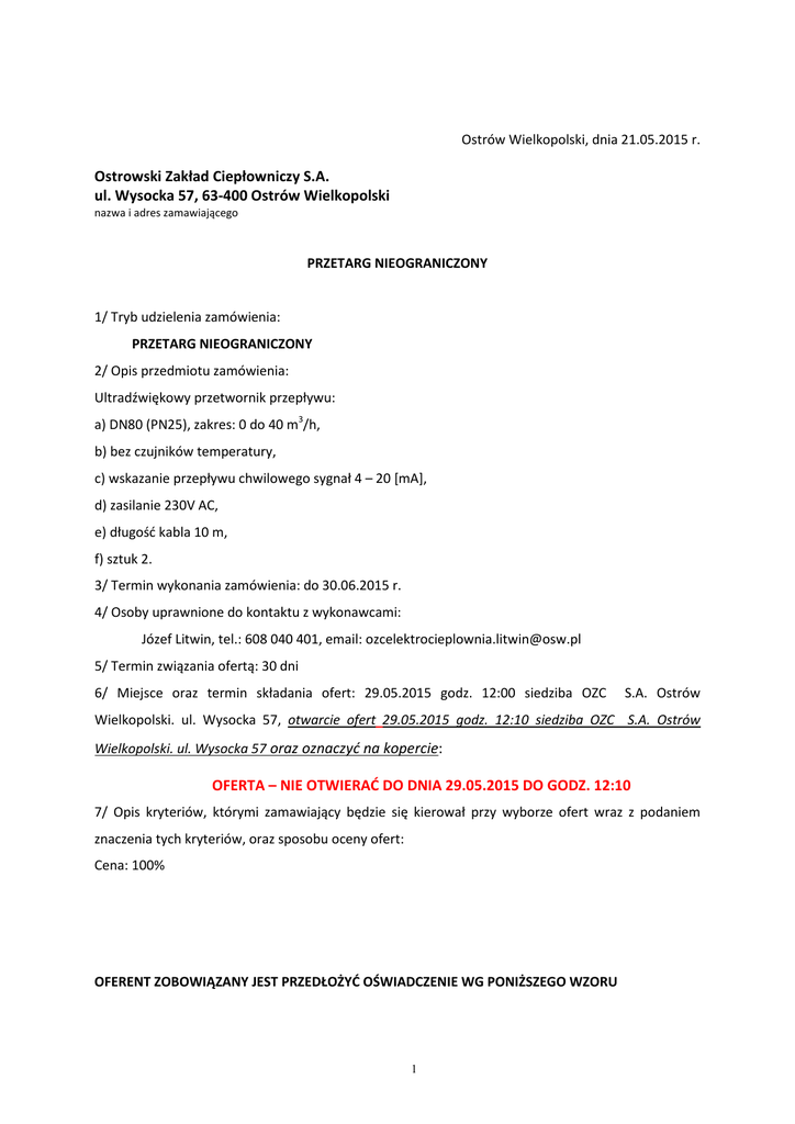Ostrów Wielkopolski, dnia 21.05.2015 r. Ostrowski Zakład Ciepłowniczy S.A. ul. Wysocka 57, 63-400 Ostrów Wielkopolski nazwa i adres zamawiającego PRZETARG NIEOGRANICZONY 1/ Tryb udzielenia zamówienia: PRZETARG NIEOGRANICZONY 2/ Opis przedmiotu zamówienia: Ultradźwiękowy przetwornik przepływu: a) DN80 (PN25), zakres: 0 do 40 m3/h, b) bez czujników temperatury, c) wskazanie przepływu chwilowego sygnał 4 – 20 [mA], d) zasilanie 230V AC, e) długość kabla 10 m, f) sztuk 2. 3/ Termin wykonania zamówienia: do 30.06.2015 r. 4/ Osoby uprawnione do kontaktu z wykonawcami: Józef Litwin, tel.: 608 040 401, email: [email protected] 5/ Termin związania ofertą: 30 dni 6/ Miejsce oraz termin składania ofert: 29.05.2015 godz. 12:00 siedziba OZC S.A. Ostrów Wielkopolski. ul. Wysocka 57, otwarcie ofert 29.05.2015 godz. 12:10 siedziba OZC S.A. Ostrów Wielkopolski. ul. Wysocka 57 oraz oznaczyć na kopercie: OFERTA – NIE OTWIERAĆ DO DNIA 29.05.2015 DO GODZ. 12:10 7/ Opis kryteriów, którymi zamawiający będzie się kierował przy wyborze ofert wraz z podaniem znaczenia tych kryteriów, oraz sposobu oceny ofert: Cena: 100% OFERENT ZOBOWIĄZANY JEST PRZEDŁOŻYĆ OŚWIADCZENIE WG PONIŻSZEGO WZORU 1 ........................................... pieczęć firmowa OŚWIADCZENIE Oświadczamy że: 1) jesteśmy uprawnieni do występowania w obrocie prawnym, posiadamy uprawnienia niezbędne do wykonania określonych prac lub czynności, 2) dysponujemy niezbędną wiedzą i doświadczeniem, a także potencjałem ekonomicznym i technicznym oraz pracownikami zdolnymi do wykonywania zamówienia, 3) znajdujemy się w sytuacji finansowej zapewniającej wykonanie zamówienia, 4) nie podlegamy wykluczeniu na podstawie § 11 ust. 2 i 3 Regulaminu Udzielania Zamówień W Ostrowskim Zakładzie Ciepłowniczym S.A. z dnia 10 lutego 2015 r. ................................................................ (podpisy osoby/osób uprawnionych do występowania w obrocie prawnym, reprezentowania i składania oświadczeń woli w imieniu Wykonawcy) Miejscowość: ............................dnia................... r. niepotrzebne skreślić 2