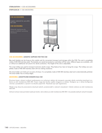 STERILISATION I CSD ACCESSORIES STERYLIZACJA I CSD AKCESORIA CSD ACCESSORIES Logistic materials for use within the CSD. CSD ACCESORIA Materiały logistyczne do użycia w działach centralnej sterylizacji. CSD ACCESSORIES. LOGISTIC SUPPLIES FOR THE CSD Big mesh baskets can be hung on this mobile rack for convenient transport and storage within the CSD. The rack is completely made of AISI 304 stainless steel. The baskets can easily be hooked on and taken off the racks. Different types are available, with or without an additional rail column for sterile containers. The height of the rails is adjustable. The wrap trolleys are used to transport and store sterile wraps. They feature four bars to hang the wraps. The trolleys are completely made of AISI 304 stainless steel with low sliding resistance. The shoe holder can hold up to six pairs of shoes. It is completely made of AISI 304 stainless steel and is electrolytically polished. The shoe holder has no sharp edges. AKCESORIA. LOGISTYCZNE DODATKI DLA CSD Druciane kosze z dużymi oczkami podwieszane na ruchomym stelażu do transportu wewnątrz działu centralnej sterylizacji zrobione ze stali nierdzewnej ASIS 304. Kosze mogą być bardzo szybko ściągane ze stelaża. Dostępne są w różnej konfiguracji również z przedziałem z szynami na sterylne pojemniki. Wysokość szyn jest regulowana. Wózek wrap służy do przewożenia sterylnych płacht, prześcieradeł w czterech wieszakach. Całość zrobiona ze stali nierdzewnej AISI 304. Uchwyt na buty może pomieścić sześć par butów. Jest zrobiony ze stali nierdzewnej AISI 304 i nie posiada żadnych ostrych krawędzi. 146 OPTOTECHNIKA – BELINTRA STERILISATION I CSD ACCESSORIES STERYLIZACJA I CSD AKCESORIA MOBILE RACK FOR WIRE BASKETS MOBILNY STELAŻ DO KOSZY Article Number Numer artykułu Dimensions (WxDxH) Wymiary (SxGxW) Description Opis 30001 00027 560 x 430 x 1460 mm 3 baskets 3 kosze 30001 00028 630 x 560 x 1620 mm 8 baskets 8 koszy MOBILE RACK WITH REMOVABLE GUIDES FOR CONTAINERS AND 8 WIRE BASKETS MOBILNY STELAŻ DO KOSZY Z KOLUMNĄ 8 SZYN Article Number Numer artykułu Dimensions (WxDxH) Wymiary (SxGxW) 30001 00029 1000 x 560 x 1620 mm PAPERTROLLEY WÓZEK NA PŁACHTY Article Number Numer artykułu Dimensions (WxDxH) Wymiary (SxGxW) 30001 00030 1360 x 720 x 1030 mm SHOE RACK UCHWYT NA BUTY Article Number Numer artykułu Dimensions (WxDxH) Wymiary (SxGxW) 30001 00031 580 x 230 x 220 mm OPTOTECHNIKA – BELINTRA 147