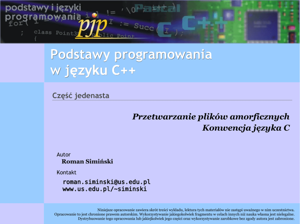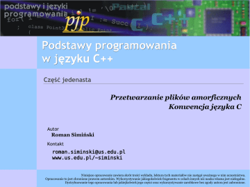 Podstawy programowania w języku języku C++ Część jedenasta Przetwarzanie plików amorficznych Konwencja języka C Autor Roman Simiński Kontakt [email protected] www.us.edu.pl/~siminski Niniejsze opracowanie zawiera skrót treści wykładu, lektura tych materiałów nie zastąpi uważnego w nim uczestnictwa. Opracowanie to jest chronione prawem autorskim. Wykorzystywanie jakiegokolwiek fragmentu w celach innych niż nauka własna jest nielegalne. Dystrybuowanie tego opracowania lub jakiejkolwiek jego części oraz wykorzystywanie zarobkowe bez zgody autora jest zabronione. Podstawy programowania w C++ Przetwarzanie plików amorficznych Przetwarzanie plików binarnych, motywacja Często pliki nie zawierają danych tekstowych. Przykładem są pliki graficzne, dźwiękowe czy multimedialne. Ich zawartość to najczęściej binarny obraz zawartości pamięci operacyjnej (np. ciąg bajtów opisujących kolory piksela) uzupełniony o dodatkowe informacje (np. nagłówek pliku BMP, czy dane EXIF). Do przetwarzania plików, których zawartość ma charakter binarny, wykorzystuje się najczęściej odczyt/zapis bloków. Plik PDF w podglądzie tekstowym Plik JPG w podglądzie tekstowym Pod pojęciem bloku rozumieć będziemy ciąg bajtów o określonej długości, nie zakładamy, że ciąg taki ma jakakolwiek strukturę. Rozmiar takiego bloku jest określony liczbą jego bajtów. Copyright © Roman Simiński Strona : 2 Podstawy programowania w C++ Przetwarzanie plików amorficznych Przetwarzanie plików binarnych, koncepcja Aby korzystać z blokowego odczytu i zapisu musimy spełnić dwa warunki: musimy dysponować otwartym plikiem, zaleca się, aby plik taki otwarty był w trybie binarnym; musimy w programie posiadać zmienną — która realizuje funkcję bufora — z której będą pobierane dane do zapisu, lub do której będą pobierane dane w przypadku odczytu. Program Zmienna buforowa Odczyt bloku fread Zapis bloku fwrite Copyright © Roman Simiński Strona : 3 Podstawy programowania w C++ Przetwarzanie plików amorficznych Przetwarzanie plików binarnych, przykład Załóżmy, że chcemy napisać program, którego zadaniem jest: utworzenie nowego pliku binarnego, zapisanie do niego liczby typu float o wartości 123.321, zamknięcie pliku; powtórne jego otwarcie w trybie do odczytu, odczytanie zapisanej wcześniej liczby i wyprowadzenie jej do stdout. Copyright © Roman Simiński Strona : 4 Podstawy programowania w C++ Przetwarzanie plików amorficznych Przetwarzanie plików binarnych, otwarcie pliku, zapis liczby typu float #include <stdio.h> #include <stdlib.h> int main() { FILE * fp; float num = 123.321; if( ( fp = { printf( fwrite( fclose( } fopen( "d.dat", "wb" ) ) != NULL ) "\nZapis liczby: %g", num ); &num, sizeof( num ), 1, fp ); fp ); . . . return EXIT_SUCCESS; } Copyright © Roman Simiński Strona : 5 Podstawy programowania w C++ Przetwarzanie plików amorficznych Przetwarzanie plików binarnych, zapis zmiennej num Rozmiar zapisywanego bloku. fwrite( &num , Wskaźnik na zmienną num, która ma być zapisana do pliku fp. Zmienna ta, jest blokiem zapisywanym do pliku. Copyright © Roman Simiński sizeof( num ) , Liczba zapisywanych bloków. 1 , fp ); Wskaźnik pliku otwartego do zapisu. Strona : 6 Podstawy programowania w C++ Przetwarzanie plików amorficznych Przetwarzanie plików binarnych, otwarcie pliku, zapis liczby typu float Zawartość pliku d.dat Szesnastkowo Copyright © Roman Simiński Jako tekst Strona : 7 Podstawy programowania w C++ Przetwarzanie plików amorficznych Opis funkcji blokowego zapisu — fwrite size_t fwrite( void * ptr, size_t size, size_t n, FILE * stream ); Funkcja zapisuje dane z obszaru pamięci wskazywanego przez ptr do strumienia stream. Zapisuje n bloków o rozmiarze size. Łączna liczba zapisanych bajtów to n*size. Rezultatem funkcji jest liczba zapisanych bloków (nie bajtów!). W przypadku wystąpienia końca pliku lub błędu, rezultatem funkcji jest liczba, potencjalnie zerowa, bezbłędnie zapisanych bloków. Copyright © Roman Simiński Strona : 8 Podstawy programowania w C++ Przetwarzanie plików amorficznych Przetwarzanie plików binarnych, otwarcie pliku, odczyt liczby typu float #include <stdio.h> #include <stdlib.h> int main() { FILE * fp; float num = 123.321; . . . num = 0; if( ( fp = fopen( "d.dat", "rb" ) ) != NULL ) { fread( &num, sizeof( num ), 1, fp ); printf( "\nOdczyt liczby: %g", num ); fclose( fp ); } puts( "\n\nNacisnij Enter by zakonczyc..." ); ( void )getchar(); return EXIT_SUCCESS; } Copyright © Roman Simiński Strona : 9 Podstawy programowania w C++ Przetwarzanie plików amorficznych Przetwarzanie plików binarnych, odczyt do zmiennej num Rozmiar odczytywanego bloku. fread( &num , Wskaźnik na zmienną num, ty ma być zapisany blok odczytany z pliku fp. Copyright © Roman Simiński sizeof( num ) , Liczba odczytywanych bloków. 1 , fp ); Wskaźnik pliku otwartego do odczytu. Strona : 10 Podstawy programowania w C++ Przetwarzanie plików amorficznych Opis funkcji blokowego odczytu — fread size_t fread( void * ptr, size_t size, size_t n, FILE * stream ); Funkcja czyta dane ze strumienia stream do obszaru pamięci wskazywanego przez ptr. Odczytuje n bloków o rozmiarze size. Łączna liczba odczytanych bajtów to n*size. Rezultatem funkcji jest liczba przeczytanych bloków (nie bajtów!). W przypadku napotkania końca pliku lub błędu, rezultatem jest liczba bezbłędnie odczytanych bloków, która potencjalnie może być równa zero. Copyright © Roman Simiński Strona : 11 Podstawy programowania w C++ Przetwarzanie plików amorficznych Odczyt i zapis z kontrolą poprawności Funkcje fread i fwrite pozwalają na kontrolę poprawności wykonywanych operacji odczytu i zapisu. Wystarczy kontrolować rezultat wywołania tych funkcji i porównywać z liczbą określonych bloków. if( ( fp = fopen( "d.dat", "wb" ) ) != NULL ) { if( fwrite( &num, sizeof( num ), 1, fp ) != 1 ) printf( "\nBlad zapisu!" ); else printf( "\n