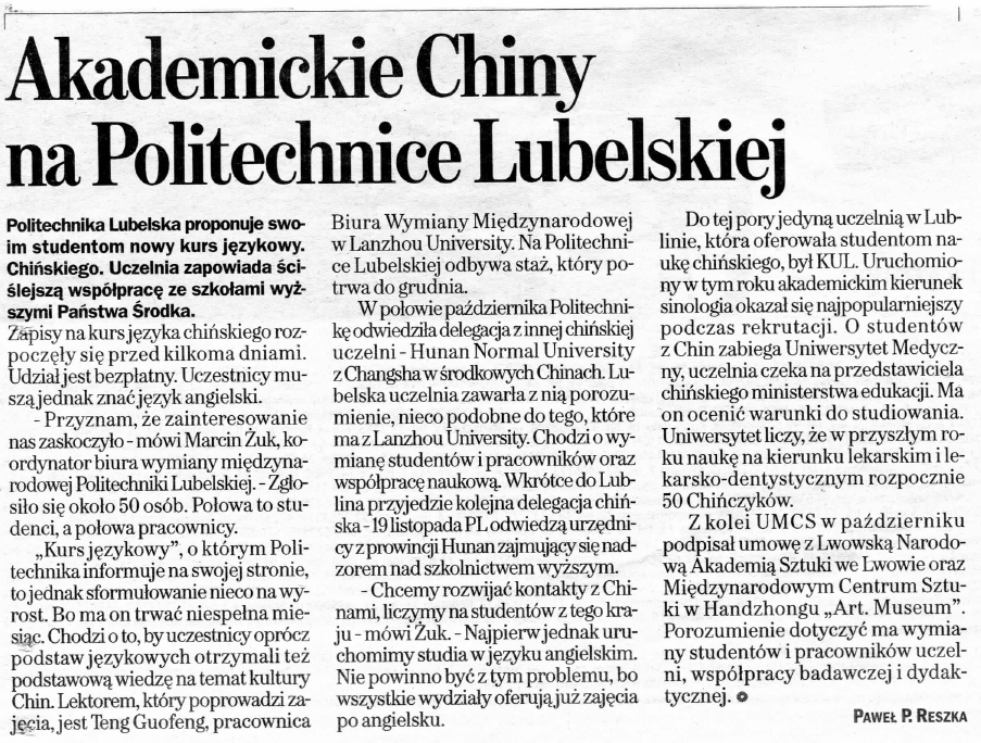 Akademickie Chiny na PoKtechnice Lubelskiej Politechnika Lubelska proponuje swoim studentom nowy kurs j^zykowy. Chihskiego. Uczelnia zapowiada scislejszq wspofpracQ ze szkotami wyzszymi Pafistwa Srodka. Zhpisy na kurs j^zyka chinskiego rozpocz^ty si§ przed kilkoma dniami. Udzial jest bezplatny. Uczestnicy muszq jednak znac j^zyk angielski. - Przyznam, ze zainteresowanie nas zaskoczylo - mowi Marcin Zuk, koordynator biura wymiany mi^dzynarodowej PolitechnM Lubelskiej. - Zglosilo si§ okolo 50 osob. Polowa to studenci, a polowa pracownicy. „Kurs j^zykowy", o ktorym Politechnika informuje na swojej stronie, to jednak sformulowanie nieco na wyrost. Bo ma on trwac niespelna miesi^c. Chodzi o to, by uczestnicy oprocz podstaw j^zykowych otrzymali tez podstawow^ wiedz? na temat kultury Chin. Lektorem, ktoiy poprowadzi zajeeia, jest Teng Guofeng, pracownica Biura Wymiany Mi^dzynarodowej w Lanzhou University. Na Politechnice Lubelskiej odbywa staz, ktory potrwadogrudnia. W polowie pazdziemika Politechnika odwiedzila delegacja z innej chihskiej uczelni - Hunan Normal University z Changsha w srodkowych Chinach. Lubelska uczelnia zawarla z ni^ porozumienie, nieco podobne do tego, ktore ma z Lanzhou University. Chodzi o wymiany studentow i pracownikow oraz wspolprac^ naukow^ Wkrotce do Lublina przyjedzie kolejna delegacja chinska -19 listopada PL odwiedzq urz^dnicy z prowincji Hunan zajmuj^ si§ nadzorem nad szkolnictwem wyzszym. - Chcemy rozwijac kontakty z Chinami, liczymy na studentow z tego kraju - mowi Zuk. - Najpierw jednak uruchomimy studia w j^zyku angielskim. Nie powinno bye z tym problemu, bo wszystkie wydziaJy oferuj^ juz zaj^cia po angielsku. Do tej pory jedynq uczelni^ w Lublinie, ktora oferowala studentom nauk§ chihskiego, byl KUL. Uruchomiony w tym roku akademickim kierunek sinologia okazal si§ najpopulamiejszy podczas rekrutacji. O studentow z Chin zabiega Uniwersytet Medyczny, uczelnia czeka na przedstawiciela chihskiego ministerstwa edukacji. Ma on ocenic warunki do studiowania. Uniwersytet liczy, ze w przyszljrm roku nauk§ na kierunku lekarskim i lekarsko-dentystycznym rozpocznie 50 Chinczykow. Z kolei UMCS w pazdzierniku podpisal umow§ z Lwowsk^ NarodoW4 Akademiq Sztuki we Lwowie oraz Mi^dzynarodowym Centrum Sztuki w Handzhongu „Art. Museum". Porozumienie dotyczyc ma wymiany studentow i pracownikow uczelni, wspolpracy badawczej i dydaktycznej. o PAWEt P. RESZKA
