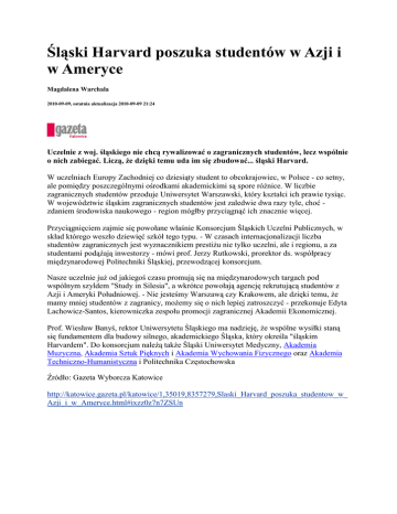 Śląski Harvard poszuka studentów w Azji i w Ameryce Magdalena Warchala 2010-09-09, ostatnia aktualizacja 2010-09-09 21:24 Uczelnie z woj. śląskiego nie chcą rywalizować o zagranicznych studentów, lecz wspólnie o nich zabiegać. Liczą, że dzięki temu uda im się zbudować... śląski Harvard. W uczelniach Europy Zachodniej co dziesiąty student to obcokrajowiec, w Polsce - co setny, ale pomiędzy poszczególnymi ośrodkami akademickimi są spore różnice. W liczbie zagranicznych studentów przoduje Uniwersytet Warszawski, który kształci ich prawie tysiąc. W województwie śląskim zagranicznych studentów jest zaledwie dwa razy tyle, choć zdaniem środowiska naukowego - region mógłby przyciągnąć ich znacznie więcej. Przyciągnięciem zajmie się powołane właśnie Konsorcjum Śląskich Uczelni Publicznych, w skład którego weszło dziewięć szkół tego typu. - W czasach internacjonalizacji liczba studentów zagranicznych jest wyznacznikiem prestiżu nie tylko uczelni, ale i regionu, a za studentami podążają inwestorzy - mówi prof. Jerzy Rutkowski, prorektor ds. współpracy międzynarodowej Politechniki Śląskiej, przewodzącej konsorcjum. Nasze uczelnie już od jakiegoś czasu promują się na międzynarodowych targach pod wspólnym szyldem "Study in Silesia", a wkrótce powołają agencję rekrutującą studentów z Azji i Ameryki Południowej. - Nie jesteśmy Warszawą czy Krakowem, ale dzięki temu, że mamy mniej studentów z zagranicy, możemy się o nich lepiej zatroszczyć - przekonuje Edyta Lachowicz-Santos, kierowniczka zespołu promocji zagranicznej Akademii Ekonomicznej. Prof. Wiesław Banyś, rektor Uniwersytetu Śląskiego ma nadzieję, że wspólne wysiłki staną się fundamentem dla budowy silnego, akademickiego Śląska, który określa "śląskim Harvardem". Do konsorcjum należą także Śląski Uniwersytet Medyczny, Akademia Muzyczna, Akademia Sztuk Pięknych i Akademia Wychowania Fizycznego oraz Akademia Techniczno-Humanistyczna i Politechnika Częstochowska Źródło: Gazeta Wyborcza Katowice http://katowice.gazeta.pl/katowice/1,35019,8357279,Slaski_Harvard_poszuka_studentow_w_ Azji_i_w_Ameryce.html#ixzz0z7n7ZSUn
