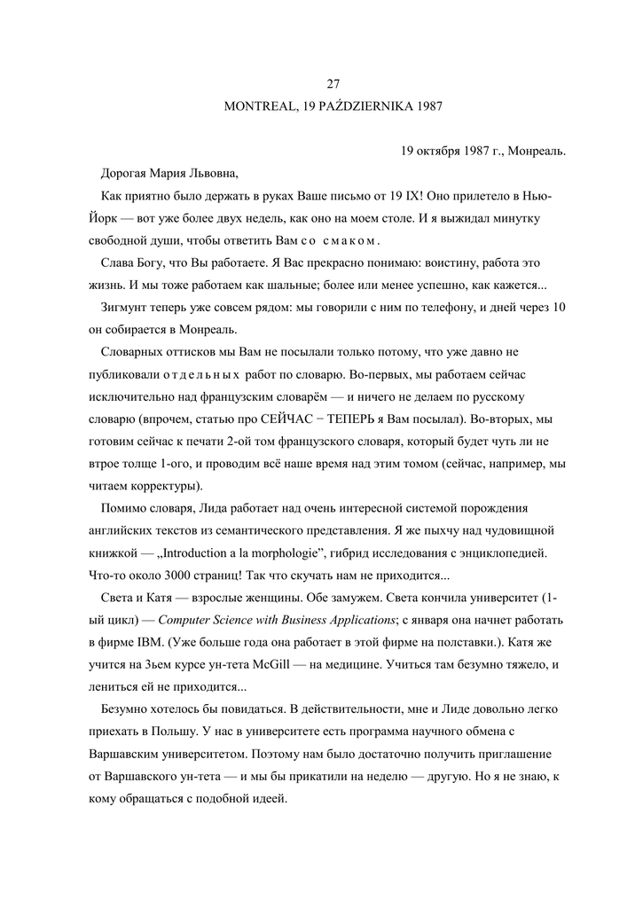 27 MONTREAL, 19 PAŹDZIERNIKA 1987 19 октября 1987 г., Монреаль. Дорогая Мария Львовна, Как приятно было держать в руках Ваше письмо от 19 IX! Оно прилетело в НьюЙорк — вот уже более двух недель, как оно на моем столе. И я выжидал минутку свободной души, чтобы ответить Вам с о с м а к о м . Слава Богу, что Вы работаете. Я Вас прекрасно понимаю: воистину, работа это жизнь. И мы тоже работаем как шальные; более или менее успешно, как кажется... Зигмунт теперь уже совсем рядом: мы говорили с ним по телефону, и дней через 10 он собирается в Монреаль. Словарных оттисков мы Вам не посылали только потому, что уже давно не публиковали о т д е л ь н ы х работ по словарю. Во-первых, мы работаем сейчас исключительно над французским словарём — и ничего не делаем по русскому словарю (впрочем, статью про СЕЙЧАС − ТЕПЕРЬ я Вам посылал). Во-вторых, мы готовим сейчас к печати 2-ой том французского словаря, который будет чуть ли не втрое толще 1-ого, и проводим всё наше время над этим томом (сейчас, например, мы читаем корректуры). Помимо словаря, Лида работает над очень интересной системой порождения английских текстов из семантического представления. Я же пыхчу над чудовищной книжкой — „Introduction a la morphologie”, гибрид исследования с энциклопедией. Что-то около 3000 страниц! Так что скучать нам не приходится... Света и Катя — взрослые женщины. Обе замужем. Света кончила университет (1ый цикл) — Computer Science with Business Applications; с января она начнет работать в фирме IBM. (Уже больше года она работает в этой фирме на полставки.). Катя же учится на 3ьем курсе ун-тета McGill — на медицине. Учиться там безумно тяжело, и лениться ей не приходится... Безумно хотелось бы повидаться. В действительности, мне и Лиде довольно легко приехать в Польшу. У нас в университете есть программа научного обмена с Варшавским университетом. Поэтому нам было достаточно получить приглашение от Варшавского ун-тета — и мы бы прикатили на неделю — другую. Но я не знаю, к кому обращаться с подобной идеей. В июне этого года Лида была в Москве, где она провела две очень радостных недели. Я же встретился в Праге с Колей Перцовым, моим старым другом и коллегой. Нет, всё-таки кое-что меняется не только к худшему! (Хотя я и не верю в с е р ь ё з н ы е и глубокие изменения в СССР.) Нежно обнимаю Вас — и желаю Вам доброго здоровья (остальное у Вас точно есть!). Любящий Вас Игорь М. [S t e m p l e:] 1) Montreal, 22 X 87. 2) Warszawa, 11 XI 87. 3) Warszawa, 11 XI 87. Rkp Arch. IBL PAN, k. 2 i koperta. — Na kopercie dwie adnotacje listonosza: „11 XI 87” i „ 16 XI 87”. Przekład polski 19 października 1987 r., Montreal. Droga Mario Lwowna, jak przyjemnie było trzymać w ręku Pani list z dnia 19 IX! Przyleciał on do Nowego Yorku — i już ponad dwa tygodnie, odkąd leży na moim stole. Wyczekiwałem minuty wewnętrznego spokoju, by móc Pani odpowiedzieć z e s m a k i e m . Chwała Bogu, że Pani pracuje. Świetnie Panią rozumiem: zaprawdę, praca to życie. I my też pracujemy jak szaleni, z większym bądź mniejszym powodzeniem, jak się wydaje… Zygmunt jest teraz zupełnie blisko, rozmawialiśmy z nim telefonicznie i mniej więcej za 10 dni wybiera się do Montrealu. Odbitek słownikowych nie posyłaliśmy Pani tylko dlatego, że już od dawna nie publikowaliśmy o d d z i e l n y c h prac związanych ze słownikiem. Po pierwsze, teraz pracujemy tylko nad słownikiem francuskim — i nic nie robimy z zakresu słownika rosyjskiego (zresztą, artykuł o SIEJCZAS − TIEPIER posyłałem Pani). Po drugie, przygotowujemy teraz do druku drugi tom słownika francuskiego, który będzie niemal trzy razy grubszy od pierwszego, i cały nasz czas spędzamy nad tym tomem (teraz, na przykład, czytamy korektę). Oprócz słownika Lida pracuje nad bardzo ciekawym systemem generowania tekstów angielskich z reprezentacji semantycznej, ja zaś ślęczę nad potworną książką — „Introduction a la morphologie”. To hybryda analizy i encyklopedii. Coś około 3000 stron! A więc, nie mamy kiedy się nudzić… Swieta i Katia to dorosłe kobiety. Obie zamężne. Swieta ukończyła uniwersytet (pierwszy cykl) — Computer Science with Business Applications, od stycznia zaczn