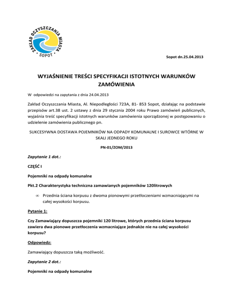 Sopot dn.25.04.2013 WYJAŚNIENIE TREŚCI SPECYFIKACJI ISTOTNYCH WARUNKÓW ZAMÓWIENIA W odpowiedzi na zapytania z dnia 24.04.2013 Zakład Oczyszczania Miasta, Al. Niepodległości 723A, 81- 853 Sopot, działając na podstawie przepisów art.38 ust. 2 ustawy z dnia 29 stycznia 2004 roku Prawo zamówień publicznych, wyjaśnia treść specyfikacji istotnych warunków zamówienia sporządzonej w postępowaniu o udzielenie zamówienia publicznego pn. SUKCESYWNA DOSTAWA POJEMNIKÓW NA ODPADY KOMUNALNE I SUROWCE WTÓRNE W SKALI JEDNEGO ROKU PN-01/ZOM/2013 Zapytanie 1 dot.: CZĘŚĆ I Pojemniki na odpady komunalne Pkt.2 Charakterystyka techniczna zamawianych pojemników 120litrowych • Przednia ściana korpusu z dwoma pionowymi przetłoczeniami wzmacniającymi na całej wysokości korpusu. Pytanie 1: Czy Zamawiający dopuszcza pojemniki 120 litrowe, których przednia ściana korpusu zawiera dwa pionowe przetłoczenia wzmacniające jednakże nie na całej wysokości korpusu? Odpowiedz: Zamawiający dopuszcza taką możliwość. Zapytanie 2 dot.: Pojemniki na odpady komunalne Pkt.3 Charakterystyka techniczna zamawianych pojemników 240litrowych • Przednia ściana korpusu z dwoma pionowymi przetłoczeniami wzmacniającymi na całej wysokości korpusu. Pytanie 2 Czy Zamawiający dopuszcza pojemniki 240litrowe, których przednia ściana korpusu zawiera dwa pionowe przetłoczenia wzmacniające jednakże nie na całej wysokości korpusu? Odpowiedz: Zamawiający dopuszcza taką możliwość. Zapytanie 3 dot.: CZĘŚĆ II Pojemniki do segregacji Pkt 1. Pojemniki segregacyjne o pojemności 120litrów • Przednia ściana korpusu z dwoma pionowymi przetłoczeniami na całej wysokości korpusu. Pytanie 3 Czy Zamawiający dopuszcza pojemniki segregacyjne o pojemności 120 litrów, których przednia ściana korpusu zawiera dwa pionowe przetłoczenia wzmacniające jednakże nie na całej wysokości korpusu? Odpowiedz: Zamawiający dopuszcza taką możliwość Zapytanie 4 dot.: Pojemniki do segregacji Pkt.2. pojemniki segregacyjne o pojemności 240 litrów • Przednia ściana korpusu z dwoma pionowymi przetłoczeniami na całej wysokości korpusu. Pytanie 4 Czy Zamawiający dopuszcza pojemniki segregacyjne o pojemności 240 litrów, których przednia ściana korpusu zawiera dwa pionowe przetłoczenia wzmacniające jednakże nie na całej wysokości korpusu? Odpowiedz Zamawiający dopuszcza taka możliwość.