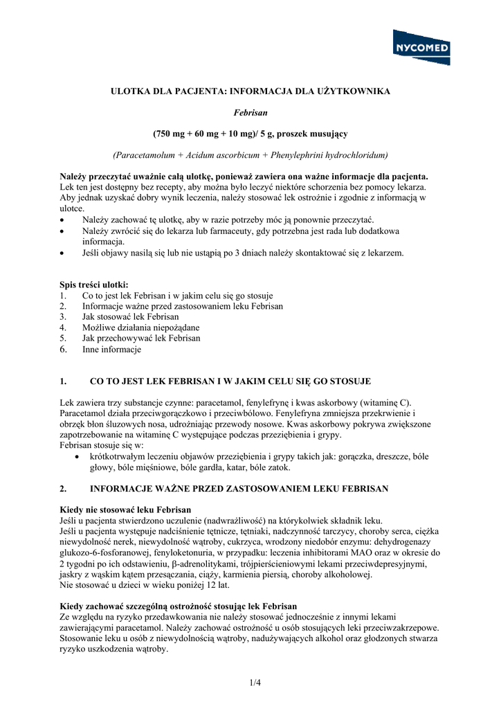 ULOTKA DLA PACJENTA: INFORMACJA DLA UŻYTKOWNIKA Febrisan (750 mg + 60 mg + 10 mg)/ 5 g, proszek musujący (Paracetamolum + Acidum ascorbicum + Phenylephrini hydrochloridum) Należy przeczytać uważnie całą ulotkę, ponieważ zawiera ona ważne informacje dla pacjenta. Lek ten jest dostępny bez recepty, aby można było leczyć niektóre schorzenia bez pomocy lekarza. Aby jednak uzyskać dobry wynik leczenia, należy stosować lek ostrożnie i zgodnie z informacją w ulotce. • Należy zachować tę ulotkę, aby w razie potrzeby móc ją ponownie przeczytać. • Należy zwrócić się do lekarza lub farmaceuty, gdy potrzebna jest rada lub dodatkowa informacja. • Jeśli objawy nasilą się lub nie ustąpią po 3 dniach należy skontaktować się z lekarzem. Spis treści ulotki: 1. Co to jest lek Febrisan i w jakim celu się go stosuje 2. Informacje ważne przed zastosowaniem leku Febrisan 3. Jak stosować lek Febrisan 4. Możliwe działania niepożądane 5. Jak przechowywać lek Febrisan 6. Inne informacje 1. CO TO JEST LEK FEBRISAN I W JAKIM CELU SIĘ GO STOSUJE Lek zawiera trzy substancje czynne: paracetamol, fenylefrynę i kwas askorbowy (witaminę C). Paracetamol działa przeciwgorączkowo i przeciwbólowo. Fenylefryna zmniejsza przekrwienie i obrzęk błon śluzowych nosa, udrożniając przewody nosowe. Kwas askorbowy pokrywa zwiększone zapotrzebowanie na witaminę C występujące podczas przeziębienia i grypy. Febrisan stosuje się w: • krótkotrwałym leczeniu objawów przeziębienia i grypy takich jak: gorączka, dreszcze, bóle głowy, bóle mięśniowe, bóle gardła, katar, bóle zatok. 2. INFORMACJE WAŻNE PRZED ZASTOSOWANIEM LEKU FEBRISAN Kiedy nie stosować leku Febrisan Jeśli u pacjenta stwierdzono uczulenie (nadwrażliwość) na którykolwiek składnik leku. Jeśli u pacjenta występuje nadciśnienie tętnicze, tętniaki, nadczynność tarczycy, choroby serca, ciężka niewydolność nerek, niewydolność wątroby, cukrzyca, wrodzony niedobór enzymu: dehydrogenazy glukozo-6-fosforanowej, fenyloketonuria, w przypadku: leczenia inhibitorami MAO oraz w okresie do 2 tygodni po ich odstawieniu, β-adrenolitykami, trójpierścieniowymi lekami przeciwdepresyjnymi, jaskry z wąskim kątem przesączania, ciąży, karmienia piersią, choroby alkoholowej. Nie stosować u dzieci w wieku poniżej 12 lat. Kiedy zachować szczególną ostrożność stosując lek Febrisan Ze względu na ryzyko przedawkowania nie należy stosować jednocześnie z innymi lekami zawierającymi paracetamol. Należy zachować ostrożność u osób stosujących leki przeciwzakrzepowe. Stosowanie leku u osób z niewydolnością wątroby, nadużywających alkohol oraz głodzonych stwarza ryzyko uszkodzenia wątroby. 1/4 Należy zachować szczególną ostrożność u pacjentów z niewydolnością nerek, czynną chorobą wrzodową, przerostem gruczołu krokowego, podwyższonym ciśnieniem wewnątrzgałkowym, guzem chromochłonnym, a także u pacjentów uczulonych na kwas acetylosalicylowy oraz leczonych lekami uspokajającymi i innymi lekami sympatykomimetycznymi tj. zmniejszającymi przekrwienie, hamującymi apetyt, lekami psychostymulującymi podobnymi do amfetaminy. Należy zachować ostrożność u osób w podeszłym wieku. W trakcie leczenia nie należy spożywać alkoholu. Jeżeli stwierdzono wcześniej u pacjenta nietolerancję niektórych cukrów, pacjent powinien skontaktować się z lekarzem przed przyjęciem leku. Należy skonsultować się z lekarzem nawet, jeśli powyższe ostrzeżenia dotyczą sytuacji występujących w przeszłości. Stosowanie leku u dzieci Nie stosować u dzieci w wieku poniżej 12 lat. Stosowanie leku u pacjentów z zaburzeniami czynności nerek i (lub) wątroby Należy zachować szczególną ostrożność u pacjentów ze schorzeniami nerek i (lub) wątroby. Lek jest przeciwwskazany u pacjentów z niewydolnością wątroby i (lub) ciężką niewydolnością nerek. Stosowanie leku u pacjentów w podeszłym wieku Należy zachować ostrożność stosując lek Febrisan. Ciąża i karmienie piersią Nie stosować w okresie ciąży i karmienia piersią. Prowadzenie pojazdów i obsługa maszyn Należy zachować ostrożność podczas prowadzenia pojazdów lub obsługi urządzeń mechanicznych. Ważne informacje o niektórych składnikach leku Febrisan Lek zawiera sacharozę (cukier). Jeżeli stwierdzono wcześniej u pacjenta nietolerancję niektórych cukrów, pacjent powinien skontaktować się z lekarzem przed przyjęciem leku. Lek zawiera źródło fenyloalaniny (aspartam). Może być szkodliwy dla pacjentów z fenyloketonurią. Stosowanie leku Febrisan z innymi lekami Należy poinformować lekarza o wszystkich przyjmowanych ostatnio lekach, nawet tych, które są wydawane bez recepty. Oddziaływanie leku Febrisan z innymi lekami wynika z oddziaływania substancji czynnych wchodzących w skład leku. Paracetamol: Nasila działanie doustnych leków przeciwzakrzepowych z grupy kumaryny. Podawanie z niesteroidowymi lekami przeciwzapalnymi (np. ibuprofen) nasila ryzyko wystąpienia zaburzeń czynności nerek. Salicylamid wydłuża czas wydalania paracetamolu. Stosowanie z lekami przyspieszajacymi metabolizm paracetamolu w wątrobie (ryfampicyna, niektóre leki nasenne i przeciwpadaczkowe) zwiększa ryzyko uszkodzenia wątroby. Podawany z inhibitorami MAO oraz w okresie do 2 tygodni po ich odstawieniu może wywołać stany pobudzenia i wysoką gorączkę. Równoczesne stosowanie paracetamolu z zydowudyną (AZT) może nasilać toksyczne działanie zydowudyny na szpik. Stosowany z lamotryginą lub chloramfenikolem zmniejsza ich stężenie w surowicy. Metoklopramid przyspiesza, a propantelina opóźnia wchłanianie paracetamolu z przewodu pokarmowego. Cymetydyna, izoniazyd, probenecyd, ranitydyna, propranolol, salicylamid – wydłużają okres półtrwania paracetamolu w surowicy. Spożywanie alkoholu podczas leczenia paracetamolem prowadzi do powstania toksycznego metabolitu wy