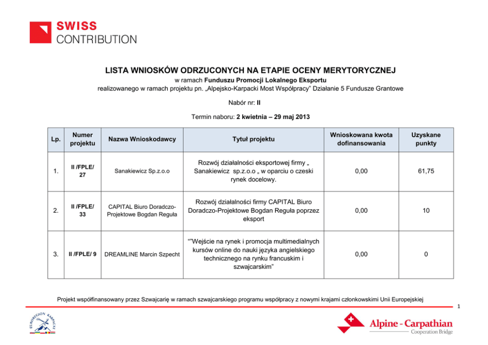 LISTA WNIOSKÓW ODRZUCONYCH NA ETAPIE OCENY MERYTORYCZNEJ w ramach Funduszu Promocji Lokalnego Eksportu realizowanego w ramach projektu pn. „Alpejsko-Karpacki Most Współpracy” Działanie 5 Fundusze Grantowe Nabór nr: II Termin naboru: 2 kwietnia – 29 maj 2013 Lp. Numer projektu Nazwa Wnioskodawcy Tytuł projektu Wnioskowana kwota dofinansowania Uzyskane punkty 1. II /FPLE/ 27 Sanakiewicz Sp.z.o.o Rozwój działalności eksportowej firmy „ Sanakiewicz sp.z.o.o „ w oparciu o czeski rynek docelowy. 0,00 61,75 2. II /FPLE/ 33 CAPITAL Biuro DoradczoProjektowe Bogdan Reguła Rozwój działalności firmy CAPITAL Biuro Doradczo-Projektowe Bogdan Reguła poprzez eksport 0,00 10 DREAMLINE Marcin Szpecht “”Wejście na rynek i promocja multimedialnych kursów online do nauki języka angielskiego technicznego na rynku francuskim i szwajcarskim” 0,00 0 3. II /FPLE/ 9 Projekt współfinansowany przez Szwajcarię w ramach szwajcarskiego programu współpracy z nowymi krajami członkowskimi Unii Europejskiej 1 4. 5. II /FPLE/ 13 II /FPLE/ 37 Przedsiębiorstwo Wielobranżowe ”DREMEX „Sp.z.o.o Usprawnienie procesu produkcji towarów eksportowych Przedsiębiorstwa Wielobranżowego DREMEX Sp.z.o.o 0,00 0 WEINART Dystrybucja Piotr Nowak Nawiązanie współpracy z Ukrainą poprzez eksport wina, napojów bezalkoholowych oraz półproduktów niezbędnych przy ich produkcji przy pomocy zakupionego środka transportu oraz skorzystania z doradztwa. 0,00 0 Łączna kwota dofinansowania: 0,00 PLN Projekt współfinansowany przez Szwajcarię w ramach szwajcarskiego programu współpracy z nowymi krajami członkowskimi Unii Europejskiej 2