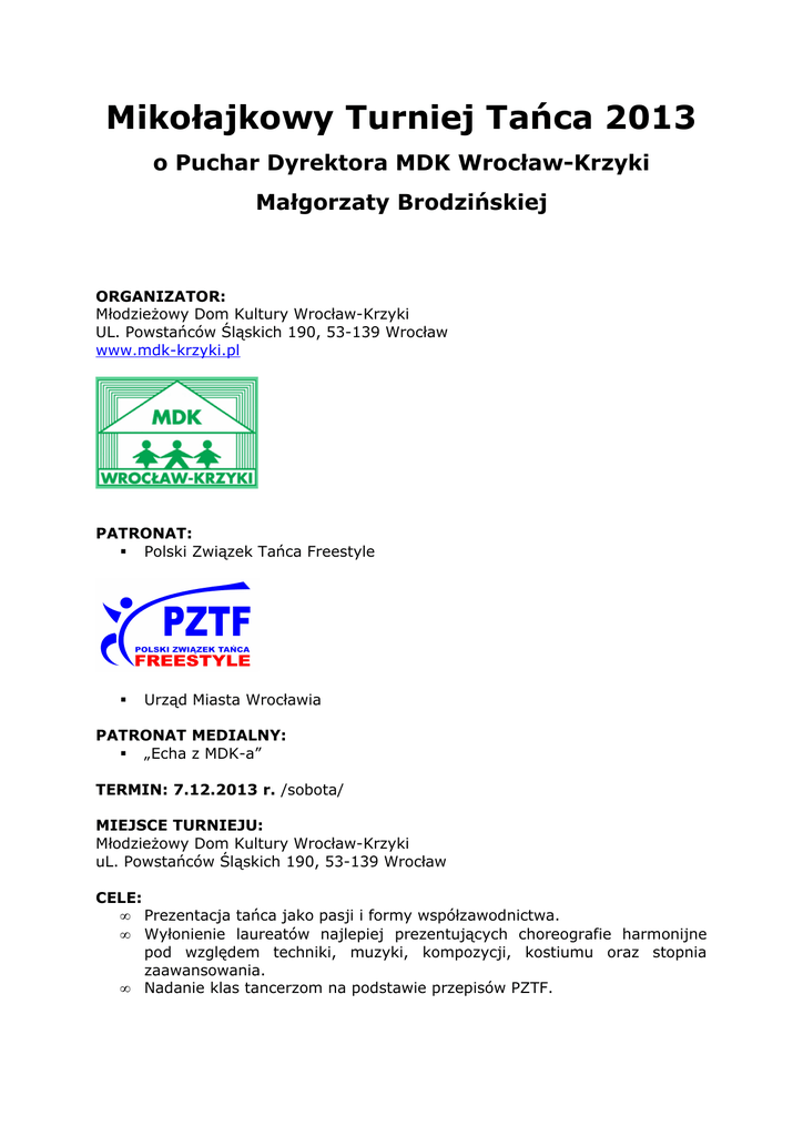 Mikołajkowy Turniej Tańca 2013 o Puchar Dyrektora MDK Wrocław-Krzyki Małgorzaty Brodzińskiej ORGANIZATOR: Młodzieżowy Dom Kultury Wrocław-Krzyki UL. Powstańców Śląskich 190, 53-139 Wrocław www.mdk-krzyki.pl PATRONAT: Polski Związek Tańca Freestyle Urząd Miasta Wrocławia PATRONAT MEDIALNY: „Echa z MDK-a” TERMIN: 7.12.2013 r. /sobota/ MIEJSCE TURNIEJU: Młodzieżowy Dom Kultury Wrocław-Krzyki uL. Powstańców Śląskich 190, 53-139 Wrocław CELE: • Prezentacja tańca jako pasji i formy współzawodnictwa. • Wyłonienie laureatów najlepiej prezentujących choreografie harmonijne pod względem techniki, muzyki, kompozycji, kostiumu oraz stopnia zaawansowania. • Nadanie klas tancerzom na podstawie przepisów PZTF. KONKURENCJE TANECZNE: Styl Konkurencja Disco Dance /PZTF Solo debiut dziewczęta + chłopcy Solo klasyfikacyjne kl.: E,D,C,B,A dziewczęta + chłopcy Solo kl. S dziewczęta / chłopcy Duety debiuty Duety-poziomy taneczne E+D, C+B Jazz Dance /PZTF Solo debiut dziewczęta + chłopcy Solo klasyfikacyjne kl.: E,D,C dziewczęta + chłopcy Modern /PZTF Solo debiut dziewczęta + chłopcy Solo klasyfikacyjne kl. E,D,C dziewczęta + chłopcy małe Grupy open* Małe grupy 3-7 osób II liga i I liga Kategoria wiekowa Solo Dzieci: 7.- /2006 i młodsi 8.-9 lat /2005-2004 10.-11 lat /2003-2002 Juniorzy: 12.-13 lat /2001-2000 14.-15 lat /1999-1998 Dorośli: 16 lat/1997 i starsi Duety 11.- /2002 i młodsi 12.-15 / 2001-1998 16.+ / 1997 i starsi 11 lat i młodsi (11-) 12-15 lat (12-15) 16 lat i starsi (16-) O przynależności do danej kategorii wiekowej decyduje wiek najstarszego uczestnika. * w turnieju małych grup dozwolone są wszystkie style taneczne CZAS PREZENTACJI: solo i duety we wszystkich konkurencjach – 1 min. małe Grupy open – 1.30-3.00 min. MUZYKA: muzyka organizatora – we wszystkich konkurencjach PZTF. muzyka własna – w konkurencji małe Grupy open /Plik mp3 obowiązkowo na 2 typach nośników: pendrive i CD – dostarczone przy rejestracji/. WARUNKI UCZESTNICTWA: Przesłanie na adres Biura Organizacyjnego wypełnionej karty zgłoszenia oraz opłaty startowej w nieprzekraczalnym terminie do dnia 29.XI.2013r. 1. Zgłoszenie - przesłanie karty zgłoszenia (wzór karty w załączeniu) na adres e-mail: [email protected] 2. Wniesienie opłaty startowej: - 40,00 PLN od osoby / konkurencję - dla tancerzy PZTF i PFT 20,00 PLN od osoby / konkurencję (dla tancerzy PZTF za drugą i każdą następną konkurencję opłata wynosi 10,00 PLN). 3. Opłaty należy dokonać na konto: Komitet Rodzicielski przy MDK-Krzyki ul. Powstańców Śląskich 190, 53-139 Wrocław 06 1020 5242 0000 2702 0019 3334 Tytuł przelewu: darowizna na rzecz MTT (za co i od jakiego kubu) 4. Komitet Rodzicielski MDK Wrocław-Krzyki wystawia wyłącznie dowody wpłaty - nie wystawia faktur. 5. Organizator potwierdza delegacje w dniu turnieju w biurze organizacyjnym. 6. W przypadku wycofania ze startu opłata startowa nie ulega zwrotowi. 7. Potwierdzenie udziału podczas rejestracji uczestników 07.12.2013 r. w godz. 9.00 –10.30. 8. Tancerze PZTF / PFT - posiadanie ważnej książeczki startowej z ważną licencją PZTF na 2013 lub Karty Startowej PZTF dla debiutantów. 9. Tancerze konkurencji open - posiadanie ważnego dokumentu tożsamości, stwierdzającego wiek uczestnika turnieju. 10. Rejestracji dokonuje jeden reprezentant klubu (trener lub osoba wydelegowana). POSTANOWIENIA OGÓLNE: Przyjazd uczestników odbywa się na koszt własny lub instytucji delegującej. Organizator nie sprawuje opieki nad uczestnikami imprezy. Organizator nie ubezpiecza uczestników turnieju oraz nie odpowiada za rzeczy pozostawione w szatniach. Organizator nie pośredniczy w rezerwacji noclegów. Wszyscy uczestnicy muszą podporządkować się zaleceniom organizacyjnym, przepisom BHP i PPOŻ. Wszystkie Sprawy Sporne nie ujęte Regulaminem rozstrzyga Kierownik Turnieju w porozumieniu z Sędzią Głównym. . SPOSÓB OCENY: Turniej zostanie przeprowadzony zgodnie z przepisami PZTF. w klasach oraz na poziomach (duety) przy obliczaniu wyników finału stosowany jest Skating system, w rundach wstępnych – krzyże. w kategorii Debiuty – ocena szkolna w konkurencji małe Grupy open – ocena festiwalowa. ORGANIZATOR ZAPEWNIA: 1. Nagrody: Debiuty (solo i duety) – dyplomy W klasach, poziomach – dyplomy dla finalistów, medale dla 1, 2,3 miejsce Nagrody finansowe kl. S - 1 m. - 120 zł; 2m. - 80 zł; 3m. - 60 zł; 4-6/7/8 - 40 zł Nagrody finansowe ufundowane są przez Polski Związek Tańca Freestyle i przeznaczone są dla tancerzy zrzeszonych w PZTF oraz przekazywane są na konto członka zwyczajnego PZTF. Małe grupy – puchar i dyplom dla wszystkich zespołów Certyfikat uczestnictwa dla klubu. Puchar Dyrektora MDK Wrocław-Krzyki dla małej Grupy, która zajmie pierwsze miejscw w I lidze. 2. Scena o wymiarach 6m x 7m. 3. Komisja Sędziowska została zatwierdzona przez Zarząd Polskiego Związku Tańca Freestyle. 4. Opiekę medyczną w czasie turnieju. 5. Punkt gastronomiczny. 6. Wstęp wolny dla widzów. ORGANIZATOR ZASTRZEGA: • Prawo do nie wpisania na listę startową turnieju uczestników zgłoszonych po 29.11.2013. • Prawo rejestracji video i fotografowania turnieju dla celów archiwalnych oraz popularyzacji ruchu tanecznego. • Organizator zastrzega sobie prawo do zmian w programie turnieju. INFORMACJE SZCZEGÓŁOWE: Dyrektor Organizacyjny Turnieju: Małgorzata Brodzińska - Dyrektor MDK Wrocław-Krzyki, [email protected] Kierownik Artystyczny Turnieju: Izabela Adamiec – tel.: 501 463 590, [email protected] PROGRAM RAMOWY: 9.00 – 10.30 rejestracja i próby sceny 11.00 – rozpoczęcie turnieju Program Ramowy (rozpisany na konkurencje) będzie dostępny 3 dni przed turniejem na stronie: www.mdk-krzyki.pl i www.taniecfreestyle.pl W imieniu Dyrektor MDK Wrocław-Krzyki zapraszam do udziału w naszym turnieju. Małgorzaty Brodzińskiej Izabela Adamiec Kierownik Artystyczny