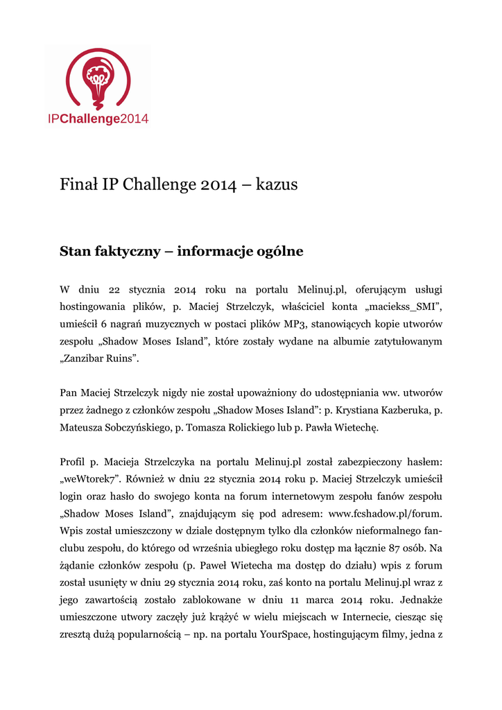 Finał IP Challenge 2014 – kazus Stan faktyczny – informacje ogólne W dniu 22 stycznia 2014 roku na portalu Melinuj.pl, oferującym usługi hostingowania plików, p. Maciej Strzelczyk, właściciel konta „maciekss_SMI”, umieścił 6 nagrań muzycznych w postaci plików MP3, stanowiących kopie utworów zespołu „Shadow Moses Island”, które zostały wydane na albumie zatytułowanym „Zanzibar Ruins”. Pan Maciej Strzelczyk nigdy nie został upoważniony do udostępniania ww. utworów przez żadnego z członków zespołu „Shadow Moses Island”: p. Krystiana Kazberuka, p. Mateusza Sobczyńskiego, p. Tomasza Rolickiego lub p. Pawła Wietechę. Profil p. Macieja Strzelczyka na portalu Melinuj.pl został zabezpieczony hasłem: „weWtorek7”. Również w dniu 22 stycznia 2014 roku p. Maciej Strzelczyk umieścił login oraz hasło do swojego konta na forum internetowym zespołu fanów zespołu „Shadow Moses Island”, znajdującym się pod adresem: www.fcshadow.pl/forum. Wpis został umieszczony w dziale dostępnym tylko dla członków nieformalnego fanclubu zespołu, do którego od września ubiegłego roku dostęp ma łącznie 87 osób. Na żądanie członków zespołu (p. Paweł Wietecha ma dostęp do działu) wpis z forum został usunięty w dniu 29 stycznia 2014 roku, zaś konto na portalu Melinuj.pl wraz z jego zawartością zostało zablokowane w dniu 11 marca 2014 roku. Jednakże umieszczone utwory zaczęły już krążyć w wielu miejscach w Internecie, ciesząc się zresztą dużą popularnością – np. na portalu YourSpace, hostingującym filmy, jedna z piosenek pochodzących z „Zanzibar Ruins” zanotowała 138 459 wyświetleń, zanim nie została usunięta na żądanie członków zespołu (15 marca 2014 roku). Obecnie na YourSpace jest około 20 filmów z nagraniami pochodzącymi z „Zanzbiar Ruins”, ich liczba stale wzrasta. Mając na względzie powyższe okoliczności, muzycy zrezygnowali z wydania reedycji płyty. Pan Paweł Wietecha, oburzony jednak całym zajściem, domaga się odszkodowania z tytułu naruszenia autorskich praw majątkowych, jakie przysługują mu względem utworów z „Zanzibar Ruins”. Zadania Uniwersytet Jagielloński: 1) proszę sporządzić, jako pełnomocnicy p. Pawła Wietechy, pozew o naruszenie autorskich praw majątkowych do utworów z albumu „Zanzibar Ruins” domagając się odszkodowania z tytułu tego naruszenia 2) proszę reprezentować powoda podczas rozprawy wyznaczonej w ramach wszczętego postępowania Uniwersytet Warszawski: 1) proszę sporządzić, jako pełnomocnicy p. Macieja Strzelczyka, odpowiedź na pozew strony przeciwnej 2) proszę reprezentować pozwanego podczas rozprawy wyznaczonej w ramach wszczętego postępowania Na potrzeby symulacji przyjmujemy następujące terminy: 16 kwietnia, godz. 20:59 – termin złożenia pozwu 7 maja, godz. 20:59 – termin złożenia odpowiedzi na pozew 17 maja, godz. 11:30 – termin rozprawy Sądem właściwym jest Sąd Okręgowy w Warszawie, sprawa powinna zostać rozpoznana przez II Wydział Cywilny. Uczestnicy symulacji: 1) nie mogą rozszerzać stanu faktycznego kazusu, 2) nie mogą składać wniosków o przeprowadzenie dowodów osobowych, 3) mogą powoływać się na okoliczności wskazane w kazusie bez konieczności ich dowodzenia, 4) mogą składać wnioski o przeprowadzenie dowodów rzeczowych na okoliczności niezwiązane z historią przedstawioną w kazusie (a okoliczności rzeczywistych, np. dotyczących rynku muzycznego). Stan faktyczny – informacje szczegółowe Historia „Shadow Moses Island” Zespół „Shadow Moses Island”, grający muzykę rockową, powstał w 2005 roku w Białymstoku. Od początku występuje w tym samym składzie: p. Mateusz Sobczyński, p. Krystian Kazberuk, p. Tomasz Rolicki oraz p. Paweł Wietecha, który jest wokalistą i frontmanem zespołu. W maju 2007 roku muzycy nagrali własnym sumptem swoją debiutancką płytę pt. „Zanzibar Ruins”, wypuszczając na rynek 1000 egzemplarzy, które sprzedawali podczas swoich koncertów. Koszt całego przedsięwzięcia – włączając wynajem studia nagraniowego oraz remastering – oscylował w granicach 5000 zł. Płyta spotkała się z uwagą środowiska alternatywnej muzyki rockowej, lecz zespół zyskał szerszą popularność dopiero po wydaniu drugiej płyty – „Infection” – w lutym 2010 roku przez profesjonalną wytwórnię „TransProduction”. Album ten sprzedał się w liczbie 22895 egzemplarzy (stan na 31 marca 2014 r.), osiągając tym samym status Złotej Płyty. Muzycy zaczęli wówczas zdobywać uznanie w środowisku – piosenki z drugiej płyty pojawiały się w ogólnopolskich rozgłośniach radiowych poświęconych muzyce rockowej, zespół regularnie zapraszano na festiwale muzyki rockowej, zdobywał branżowe nagrody, w tym za „odkrycie roku”. W listopadzie 2012 roku ta sama wytwórnia wydała trzeci album zespołu – „Revo”, który sprzedał się w liczbie 85392 egzemplarzy (stan na 31 marca 2014 r.), osiągając status Platynowej Płyty. Wszystkie single albumu pojawiały się na listach przebojów największych polskich rozgłośni. Jeden z utworów stał się motywem przewodnim ścieżki dźwiękowej wysokobudżetowego polskiego filmu wojennego „Lecą bociany”, który został zgłoszony do rywalizacji o Oscara w kategorii filmu nieanglojęzycznego (ostatecznie nie otrzymał nominacji) W czerwcu 2013 roku zespół nagrał płytę koncertową, która również osiągnęła status Platynowej (57809 sprzedanych egzemplarzy; stan na 31 marca 2014 r.). Podstawowe dane na temat dyskografii zespołu przedstawiają się następująco: Album Zanzibar Ruins Cena Liczba sprzedanych egz. 20 zł 1000 Infection 29,99 zł 22895 Revo 34,99 zł 85392 49,99 zł 57809 Shadow Moses Island LIVE „Zanzibar Ruins” Płyta „Zanzibar Ruins” składa się z 6 utworów. Jak zgodnie przyznają muzycy, każdy z utworów został w całości skomponowany pr