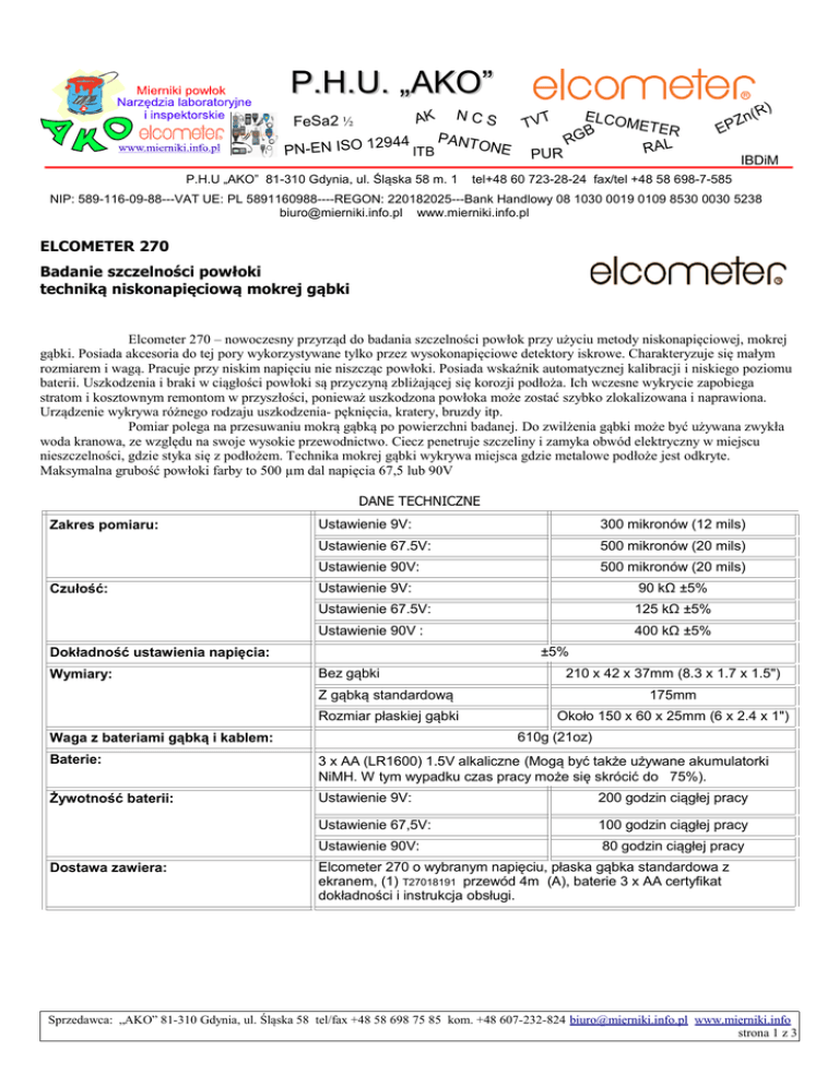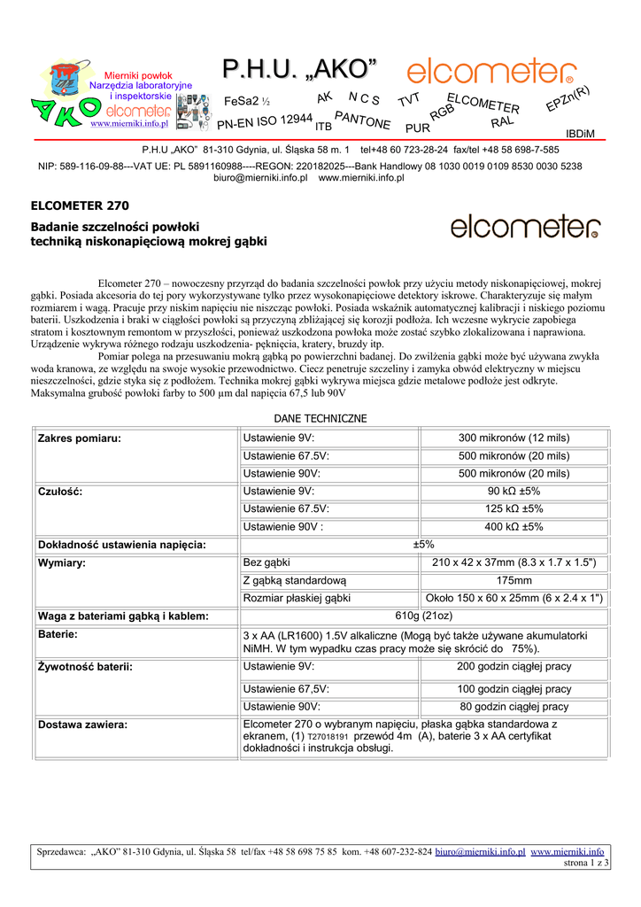P.H.U. „AKO” FeSa2 ½ PN-EN ISO 12 944 AK NCS ITB PANT ONE P.H.U „AKO” 81-310 Gdynia, ul. Śląska 58 m. 1 T VT PUR ELCOM ET ER B RG RAL Zn EP (R) IBDiM tel+48 60 723-28-24 fax/tel +48 58 698-7-585 NIP: 589-116-09-88---VAT UE: PL 5891160988----REGON: 220182025---Bank Handlowy 08 1030 0019 0109 8530 0030 5238 [email protected] www.mierniki.info.pl ELCOMETER 270 Badanie szczelności powłoki techniką niskonapięciową mokrej gąbki Elcometer 270 – nowoczesny przyrząd do badania szczelności powłok przy użyciu metody niskonapięciowej, mokrej gąbki. Posiada akcesoria do tej pory wykorzystywane tylko przez wysokonapięciowe detektory iskrowe. Charakteryzuje się małym rozmiarem i wagą. Pracuje przy niskim napięciu nie niszcząc powłoki. Posiada wskaźnik automatycznej kalibracji i niskiego poziomu baterii. Uszkodzenia i braki w ciągłości powłoki są przyczyną zbliżającej się korozji podłoża. Ich wczesne wykrycie zapobiega stratom i kosztownym remontom w przyszłości, ponieważ uszkodzona powłoka może zostać szybko zlokalizowana i naprawiona. Urządzenie wykrywa różnego rodzaju uszkodzenia- pęknięcia, kratery, bruzdy itp. Pomiar polega na przesuwaniu mokrą gąbką po powierzchni badanej. Do zwilżenia gąbki może być używana zwykła woda kranowa, ze względu na swoje wysokie przewodnictwo. Ciecz penetruje szczeliny i zamyka obwód elektryczny w miejscu nieszczelności, gdzie styka się z podłożem. Technika mokrej gąbki wykrywa miejsca gdzie metalowe podłoże jest odkryte. Maksymalna grubość powłoki farby to 500 µm dal napięcia 67,5 lub 90V DANE TECHNICZNE Zakres pomiaru: Czułość: Ustawienie 9V: 300 mikronów (12 mils) Ustawienie 67.5V: 500 mikronów (20 mils) Ustawienie 90V: 500 mikronów (20 mils) Ustawienie 9V: 90 kΩ ±5% Ustawienie 67.5V: 125 kΩ ±5% Ustawienie 90V : 400 kΩ ±5% ±5% Dokładność ustawienia napięcia: Wymiary: Bez gąbki 210 x 42 x 37mm (8.3 x 1.7 x 1.5") Z gąbką standardową 175mm Rozmiar płaskiej gąbki Około 150 x 60 x 25mm (6 x 2.4 x 1") 610g (21oz) Waga z bateriami gąbką i kablem: Baterie: 3 x AA (LR1600) 1.5V alkaliczne (Mogą być także używane akumulatorki NiMH. W tym wypadku czas pracy może się skrócić do 75%). Żywotność baterii: Ustawienie 9V: 200 godzin ciągłej pracy Ustawienie 67,5V: 100 godzin ciągłej pracy Ustawienie 90V: 80 godzin ciągłej pracy Dostawa zawiera: Elcometer 270 o wybranym napięciu, płaska gąbka standardowa z ekranem, (1) T27018191 przewód 4m (A), baterie 3 x AA certyfikat dokładności i instrukcja obsługi. Sprzedawca: „AKO” 81-310 Gdynia, ul. Śląska 58 tel/fax +48 58 698 75 85 kom. +48 607-232-824 [email protected] www.mierniki.info strona 1 z 3 DOSTĘPNE MODELE I NUMERY KATALOGOWE Model OPIS Elcometer 270/2 Elcometer 270 Pinhole Detector 67.5V D270----2 Elcometer 270/3 Elcometer 270 Pinhole Detector 9V & 90V D270----3 Elcometer 270/4 Elcometer 270 Pinhole Detector 9, 67.5 & 90V D270----4 Akcesoria Wałek gąbkowy, gąbka płaska prostokątna, płyn nawilżający, uchwyt z ekranem, uchwyt teleskopowy 1m z ekranem, przedłużacz, 10m kabel sygnałowy powrotny, zapinka itp. Lista akcesoriów poniżej. Zestaw inspektorski T27018191 Numer kat. 1x ekran płaski, 1x ekran do gąbki rolkowej, 1x 10m kabel, 2x uchwyty rozszerzające, 1x uchwyt teleskopowy, 1x pasek z klipsem, 1x butelka płynu nawilżającego, 3x baterie AA, 1x zapasowa gąbka płaska, 1x zapasowa gąbka rolkowa oraz walizka. UWAGA Zestaw nie zawiera głównego przyrządu. Do miernika Elcometer 270 dostępny jest cały zakres akcesoriów i części zamiennych: Sprzedawca: „AKO” 81-310 Gdynia, ul. Śląska 58 tel/fax +48 58 698 75 85 kom. +48 607-232-824 [email protected] www.mierniki.info strona 2 z 3 OPIS DO RYSUNKÓW Z POPRZEDNIEJ STRONY Ekran standardowy z gąbką T27016867 1 Nr katalogowy Gąbka prostokątna z nakrętką motylkową. Rectangular Sponge Set, x 3, 150 mm x 60 mm x 25 mm (6" x 2.4" x 1") T27018050 Gąbka – wałek z ekranem. Roller Wand with Roller Sponge T27016960 Zapasowa gąbka – wałek średnica 4,60 mm x 50 mm szerokość. Roller Sponge Set, x 4, 60 mm dia. x 50 mm long (2.4" x 2") with washer and clip T27018051 3 Butelka środka zwilżającego 1:600 (Kodak Photo-flo™) Bottle of Wetting Agent (Kodak Photo-flo™) T27018024 4 Uchwyt teleskopowy 1m . Telescopic Wand - extends to 1m (39"), with Lead and Belt Clip T27016998 5 Przedłużacz 420 mm (16.5") Extension Piece Przedłużacze można łączyć T27016965 6 Rączka do przedłużacza. Handle, Lead & Belt Clip for Separate Wand using extension piece(s) T27016999 7 Przewód powrotny rączka-pasek. Łączy się go z poz 6 i 8. Długość 1,7m. Replacement Separate Wand Lead (1.7 m/5.5 ft) T27016983 8 Zapinka przewodu powrotnego. Replacement Belt Clip T27016981 9 Przewód powrotny na zwijaczu 10m (32.5ft) Signal Return Cable and Storage Drum T99916996 10 Walizeczka zawiera elementy od 1 do 9 Consultant’s Carry Case Accommodates detector and items 1 to 9 T27018025 Zakrętka do pojemnika baterii z uszczelką . Replacement Battery Cap Assembly T27016997 2 - Elcometer 270 z kablem powrotnym 10 m na zwijaczu oraz: A - Gąbka z ekranem prostokątnym, standardowym załączone w dostawie. B – Gąbka wałek z ekranem. C- Gąbka standardowa z przedłużaczem 420 mm. Urządzenie Elcometer 270 jest zgodne z następującymi normami: ASTM 3894.2 ASTM D 5162-A ASTM G6 ASTM G62-A BS 7793-2 NACE RP 0188 ISO 14654 ISO 8289 A NACE SP 0188 NACE TM0384 Sprzedawca: „AKO” 81-310 Gdynia, ul. Śląska 58 tel/fax +48 58 698 75 85 kom. +48 607-232-824 [email protected] www.mierniki.info strona 3 z 3