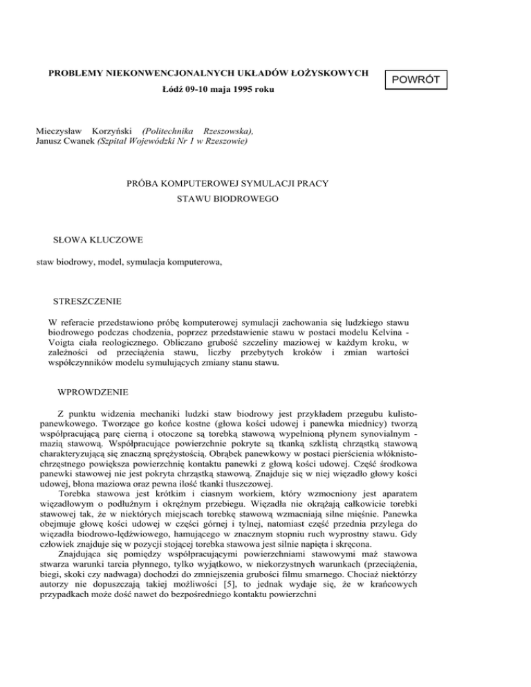 PROBLEMY NIEKONWENCJONALNYCH UKŁADÓW ŁOŻYSKOWYCH Łódź 09-10 maja 1995 roku POWRÓT Mieczysław Korzyński (Politechnika Rzeszowska), Janusz Cwanek (Szpital Wojewódzki Nr 1 w Rzeszowie) PRÓBA KOMPUTEROWEJ SYMULACJI PRACY STAWU BIODROWEGO SŁOWA KLUCZOWE staw biodrowy, model, symulacja komputerowa, STRESZCZENIE W referacie przedstawiono próbę komputerowej symulacji zachowania się ludzkiego stawu biodrowego podczas chodzenia, poprzez przedstawienie stawu w postaci modelu Kelvina Voigta ciała reologicznego. Obliczano grubość szczeliny maziowej w każdym kroku, w zależności od przeciążenia stawu, liczby przebytych kroków i zmian wartości współczynników modelu symulujących zmiany stanu stawu. WPROWDZENIE Z punktu widzenia mechaniki ludzki staw biodrowy jest przykładem przegubu kulistopanewkowego. Tworzące go końce kostne (głowa kości udowej i panewka miednicy) tworzą współpracującą parę cierną i otoczone są torebką stawową wypełnioną płynem synovialnym mazią stawową. Współpracujące powierzchnie pokryte są tkanką szklistą chrząstką stawową charakteryzującą się znaczną sprężystością. Obrąbek panewkowy w postaci pierścienia włóknistochrzęstnego powiększa powierzchnię kontaktu panewki z głową kości udowej. Część środkowa panewki stawowej nie jest pokryta chrząstką stawową. Znajduje się w niej więzadło głowy kości udowej, błona maziowa oraz pewna ilość tkanki tłuszczowej. Torebka stawowa jest krótkim i ciasnym workiem, który wzmocniony jest aparatem więzadłowym o podłużnym i okrężnym przebiegu. Więzadła nie okrążają całkowicie torebki stawowej tak, że w niektórych miejscach torebkę stawową wzmacniają silne mięśnie. Panewka obejmuje głowę kości udowej w części górnej i tylnej, natomiast część przednia przylega do więzadła biodrowo-lędźwiowego, hamującego w znacznym stopniu ruch wyprostny stawu. Gdy człowiek znajduje się w pozycji stojącej torebka stawowa jest silnie napięta i skręcona. Znajdująca się pomiędzy współpracującymi powierzchniami stawowymi maź stawowa stwarza warunki tarcia płynnego, tylko wyjątkowo, w niekorzystnych warunkach (przeciążenia, biegi, skoki czy nadwaga) dochodzi do zmniejszenia grubości filmu smarnego. Chociaż niektórzy autorzy nie dopuszczają takiej możliwości [5], to jednak wydaje się, że w krańcowych przypadkach może dość nawet do bezpośredniego kontaktu powierzchni chrząstek panewki i głowy kości udowej i wystąpienia ich przyspieszonego zużycia tribologicznego[4, 6, 8, 9, 10 i in.]. W chwili wykroku hamowane głównie przez mięśnie rozluźniane więzadła stwarzają dobre warunki do wypełnienia mazią stawową komory torebki stawowej, natomiast w chwili prostowania biodra następuje wtłoczenie mazi stawowej do przestrzeni pomiędzy panewką a głową kości udowej w wyniku skręcenia torebki stawowej i więzadeł. Wybitnie pomagają w tym więzadła okrężne, które w tym czasie przesuwają się w kierunku głowy kości udowej i panewki uniemożliwiając wypływ mazi ze szczeliny stawowej, spełniając rolę dławika [2]. Tak więc w chwili największego obciążenia maź nie może wypłynąć ze strefy zawartej pomiędzy powierzchniami stawowymi ze względu na wyżej opisane działanie uszczelniające więzadeł. Pod działaniem normalnego obciążenia chrząstka stawowa nie ulega odkształceniu. Większe obciążenie stawu powoduje dopasowanie się kształtów współpracujących powierzchni głowy i panewki do siebie. Jest to możliwe dzięki arkadowemu przebiegowi włókien kolagenowych chrząstki i pozwala jej na odkształcanie się podczas obciążenia i powrót do poprzedniego kształtu po jego ustaniu. Przyłożone do chrząstki obciążenie powoduje wyciskanie z niej płynu śródmiąższowego, który po ustaniu obciążenia jest ponownie absorbowany lecz sieć włókien utrudniających powrót do stanu wyjściowego powoduje, że następuje to z pewnym opóźnieniem. Można powiedzieć, że chrząstka zachowuje się jak ośrodek lepko-sprężysty. Spełniająca rolę płynu smarującego maź stawowa, zwilża powierzchniową warstwę chrząstki, dzięki czemu ma ona doskonałe właściwości poślizgowe. Po ustaniu obciążenia, maź stawowa częściowo powraca do stanu wyjściowego tzn. jest lepko-sprężysta. Jej lepkość jest o rząd wielkości większa niż lepkość wody i zmienia się wraz z prędkością ścinania, grubością warstwy i temperaturą. Lepkość rośnie przy malejącej prędkości ścinania a także pod wpływem zwiększania stężenia hialuronatu - głównego składnika mazi stawowej. W pewnych warunkach lepkość mazi stawowej może wzrosnąć nawet o dwa rzędy [11]. MODELE MECHANICZNE STAWU BIODROWEGO Zarówno chrząstka stawowa jak i maź stawowa wykazują cechy ośrodków lepkosprężystych i można do badań ludzkiego stawu biodrowego przyjmować odpowiednie modele mechaniczne cieczy nienewtonowskich. Jednak należy mieć na uwadze, że ludzki staw biodrowy nie jest zwykłym mechanizmem i znaczny wpływ na jego funkcjonowanie mają nie tylko "czynniki konstrukcyjne" takie jak budowa anatomiczna (wady budowy, struktura tkanek itp.), czynniki tribologiczne takie jak tarcie i smarowanie ale również (a może przede wszystkim) biochemiczne, genetyczne itp. oddziaływania na stan i właściwości elementów stawu, specyficzne dla żywych organizmów. Na obecnym etapie wiedzy daleko jest jeszcze do stworzenia modelu badawczego stawu biodrowego, ujmującego wszystkie czynniki wyszczególnionych oddziaływań, nie jest wykluczone, że niektóre z nich nie są jeszcze w ogólne znane, a na pewno wpływ wielu z nich nie jest jeszcze określony. Obecne badania modelowe to przeważnie badania różnorodnych, stosunkowo prostych modeli takich jak model reologiczny Maxwella czy Kelvina - Voigta (rys. 1.), budowanych w analogii do konstrukcji mechanicznych (łożysk, amortyzatorów, przeg