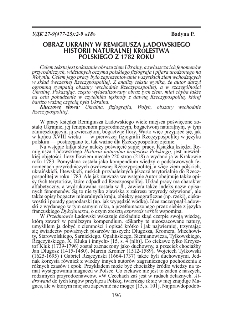 УДК 27-9(477-25):2-9 «18» Badyna P. OBRAZ UKRAINY W REMIGIUSZA ŁADOWSKIEGO HISTORII NATURALNEJ KRÓLESTWA POLSKIEGO Z 1782 ROKU Celem tekstu jest pokazanie obrazu ziem Ukrainy, a zwłaszcza ich fenomenów przyrodniczych, widzianych oczyma polskiego fizjografa i pijara urodzonego na Wołyniu. Celem jego pracy było zaprezentowanie wszystkich ziem wchodzących w skład ówczesnej Rzeczypospolitej. Z analizy tekstu wynika, że autor darzył ogromną sympatią obszary wschodnie Rzeczypospolitej, a w szczególności Ukrainę. Pokazując, często wyidealizowany obraz tych ziem, miał chyba także na celu pobudzenie w czytelniku tęsknoty z dawną Rzeczypospolitą, której bardzo ważną częścią była Ukraina. Kluczowe słowa: Ukraina, fizjografia, Wołyń, obszary wschodnie Rzeczypospolitej. W pracy księdza Remigiusza Ładowskiego wiele miejsca poświęcone zostało Ukrainie, jej fenomenom przyrodniczym, bogactwom naturalnym, w tym zamieszkującym ją zwierzętom, bogactwie flory. Warto więc przyjrzeć się, jak w końcu XVIII wieku — w pierwszej fizjografii Rzeczypospolitej w języku polskim — postrzegano te, tak ważne dla Rzeczypospolitej ziemie. Na wstępie kilka słów należy poświęcić samej pracy. Książka księdza Remigiusza Ładowskiego Historia naturalna królestwa Polskiego, jest niewielkiej objętości, liczy bowiem niecałe 220 stron (218) a wydano ją w Krakowie roku 1783. Pomyślana została jako kompendium wiedzy o podstawowych fenomenach przyrodniczych ówczesnej Rzeczypospolitej, a więc ziem polskich, ukraińskich, litewskich, ruskich przynależnych jeszcze terytorialnie do Rzeczpospolitej w roku 1783. Ale jak zauważa we wstępie Autor obejmuje także opisy tych terytoriów, które odpadł od Rzeczpospolitej. Układ pracy ma charakter alfabetyczny, a wydrukowana została w 8., zawiera także indeks nazw opisanych fenomenów. Są to nie tylko zjawiska z zakresu przyrody ożywionej, ale także opisy bogactw mineralnych kraju, obiekty geograficzne (np. rzeki), ciekawostki i porady gospodarski (np. jak wypędzić wódkę). Idee zaczerpnął Ładowski z wydanego w tym samym roku, a przetłumaczonego przez siebie z języka francuskiego Dykcjonarza, o czym zresztą expressis verbis wspomina. W Przedmowie Ładowski wskazuje dokładnie skąd czerpie swoją wiedzę, którą zawarł w poniższym kompendium. «Skarby te nieoszacowane natury, umyśliłem ja dobyć z ciemności i opisać krótko i jak najwierniej, trzymając się świadectw poważnych pisarzów naszych: Długosza, Kromera, Miechowity, Starowolskiego, Sarnickiego. Opalińskiego, Siemianowicza, Tylkowskiego, Rzączyńskiego, X. Kluka i innych» [15, s. 4 (nlb)]. Co ciekawe tylko Krzysztof Kluk (1739-1796) został zaznaczony jako duchowny, a przecież chociażby Jan Długosz (1415-1480), Marcin Kromer (1512-1589), Wojciech Tylkowski (1625-1695) i Gabriel Rzączyński (1664-1737) także byli duchownymi. Jednak korzysta również z wiedzy innych autorów zagranicznego pochodzenia z różnych czasów i epok. Przykładem może być chociażby źródło wiedzy na temat występowania magnezu w Polsce. Co ciekawe nie jest to żaden z naszych, rodzimych przyrodoznawców. «W Czechach zaś jest w rudach żelaznych. Aldrowand do tych krajów przyłącza Polskę, twierdząc iż się w niej znajduje Magnes, ale w którym miejscu zapewnić nie mogę» [15, s. 101]. Najprawdopodob196 Obraz Ukrainy w Remigiusza Ładowskiego Historii... niej chodzi w tym fragmencie o Ulissesa Aldrovandiego (1522–1605), włoskiego przyrodoznawcę i lekarza. Pojawiają się również odwołania do wybitnych przyrodoznawców epoki nowożytnej, takich jak chociażby Karol Linneusz (1707-1778) czy Georg L. de Buffon (1707-1788) [15, s. 138]. Przy czym należy podkreślić, że owi luminarze przyrodoznawstwa nowożytnego pojawiają się w związku z hasłami zaczerpniętymi z prac księdza Kluka. Jeśli chodzi o autorów polskich, to powoływał się nasz Pijar niejednokrotnie na niejakich: Opaleńskiego (sic!), Starowolskiego i Gwagnina. W przypadku pierwszego nazwiska nastąpiła najprawdopodobniej zamian literowa i chodzi o Opalińskiego. Przemawia za tym chociażby fakt powołania się na tegoż Opalińskiego we wstępie do omawianego tu dykcjonarza [15, s. 6 (nlb)]. Niedającą się jednoznacznie rozstrzygnąć w oparciu o tekst źródłowy, jest sprawa imienia owego Opalińskiego, jednakże można przypuszczać, że chodzi tu o postać znaną, wybitną, by nie powiedzieć sztandarową. Sprawa się o tyle komplikuje, że w historiografii polskiej mamy właściwie dwie osoby o tym nazwisku, które mogą być podejrzewane o podanie niniejszych informacji. Chodzi mianowicie albo o Krzysztofa Opalińskiego(1609–1655), albo jego rodzonego młodszego brata Łukasza Opalińskiego (1612–1662). Byli to synowie Piotra wojewody poznańskiego, obaj prowadzili bardzo intensywną działalność polityczną, intelektualną i pisarską. W kręgu ich zainteresowań była problematyka gospodarcza, która wiązała się integralnie z zagadnieniami reformy kraju, którą obaj propagowali [więcej informacji biograficznych: 11, s. 476 i 477]. Niektórzy badacze polskiej myśli ekonomicznej przypisują najważniejszą pracę z tego zakresu Dyskurs o pomnożeniu miast w Polsce z 1648 r., w której nota bene mogły znaleźć się dane zaczerpnięte przez Ładowskiego, Łukaszowi. Jednakże istnieje również satyra O sposobach pomnożenia miast i na nierząd w nich autorstwa Krzysztofa. Co ciekawe, a przede wszystkim ważne satyra zawiera powtórzenie tez zawartych w Dyskursie… Edward Lipiński, badacz myśli ekonomicznej i społecznej okresu staropolskiego pominął analizę Dyskursu… przypisując większą wagę satyrze a w związku z tym i koncepcji Krzysztofa Opalińskiego [16, s. 199 in.]. Mniej problemu stwarza ustalenie osoby twórcy drugiego źródła informacji Ładowskiego, a mianowicie Starowolskiego. Chodzi tu najprawdopodobniej o osobę Sz