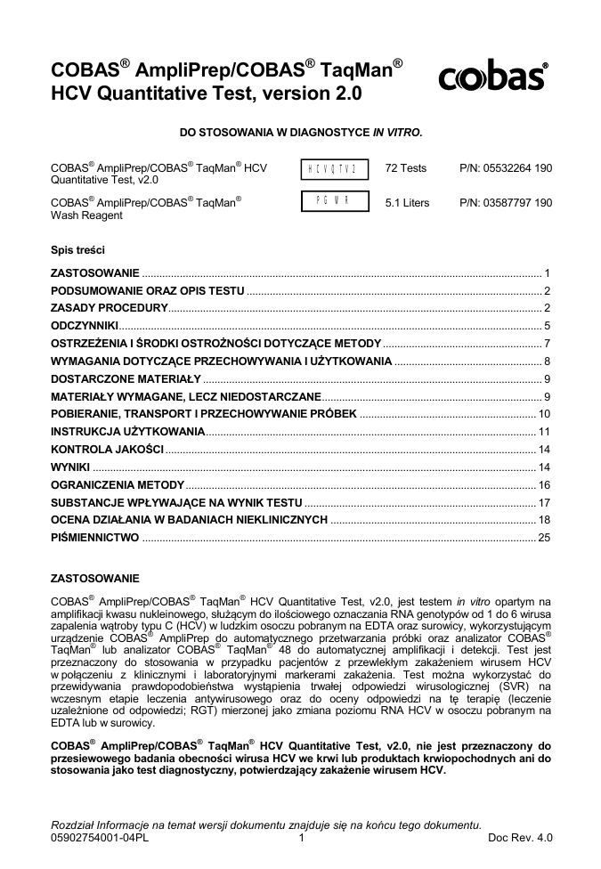 COBAS® AmpliPrep/COBAS® TaqMan® HCV Quantitative Test, version 2.0 DO STOSOWANIA W DIAGNOSTYCE IN VITRO. ® ® ® HCVQTV2 72 Tests P/N: 05532264 190 ® ® ® PG WR 5.1 Liters P/N: 03587797 190 COBAS AmpliPrep/COBAS TaqMan HCV Quantitative Test, v2.0 COBAS AmpliPrep/COBAS TaqMan Wash Reagent Spis treści ZASTOSOWANIE .......................................................................................................................................... 1 PODSUMOWANIE ORAZ OPIS TESTU ...................................................................................................... 2 ZASADY PROCEDURY................................................................................................................................. 2 ODCZYNNIKI.................................................................................................................................................. 5 OSTRZEŻENIA I ŚRODKI OSTROŻNOŚCI DOTYCZĄCE METODY ....................................................... 7 WYMAGANIA DOTYCZĄCE PRZECHOWYWANIA I UŻYTKOWANIA ................................................... 8 DOSTARCZONE MATERIAŁY ..................................................................................................................... 9 MATERIAŁY WYMAGANE, LECZ NIEDOSTARCZANE............................................................................ 9 POBIERANIE, TRANSPORT I PRZECHOWYWANIE PRÓBEK ............................................................. 10 INSTRUKCJA UŻYTKOWANIA .................................................................................................................. 11 KONTROLA JAKOŚCI ................................................................................................................................ 14 WYNIKI ......................................................................................................................................................... 14 OGRANICZENIA METODY ......................................................................................................................... 16 SUBSTANCJE WPŁYWAJĄCE NA WYNIK TESTU ................................................................................ 17 OCENA DZIAŁANIA W BADANIACH NIEKLINICZNYCH ....................................................................... 18 PIŚMIENNICTWO ........................................................................................................................................ 25 ZASTOSOWANIE COBAS® AmpliPrep/COBAS® TaqMan® HCV Quantitative Test, v2.0, jest testem in vitro opartym na amplifikacji kwasu nukleinowego, służącym do ilościowego oznaczania RNA genotypów od 1 do 6 wirusa zapalenia wątroby typu C (HCV) w ludzkim osoczu pobranym na EDTA oraz surowicy, wykorzystującym urządzenie COBAS® AmpliPrep do automatycznego przetwarzania próbki oraz analizator COBAS® TaqMan® lub analizator COBAS® TaqMan® 48 do automatycznej amplifikacji i detekcji. Test jest przeznaczony do stosowania w przypadku pacjentów z przewlekłym zakażeniem wirusem HCV w połączeniu z klinicznymi i laboratoryjnymi markerami zakażenia. Test można wykorzystać do przewidywania prawdopodobieństwa wystąpienia trwałej odpowiedzi wirusologicznej (SVR) na wczesnym etapie leczenia antywirusowego oraz do oceny odpowiedzi na tę terapię (leczenie uzależnione od odpowiedzi; RGT) mierzonej jako zmiana poziomu RNA HCV w osoczu pobranym na EDTA lub w surowicy. COBAS® AmpliPrep/COBAS® TaqMan® HCV Quantitative Test, v2.0, nie jest przeznaczony do przesiewowego badania obecności wirusa HCV we krwi lub produktach krwiopochodnych ani do stosowania jako test diagnostyczny, potwierdzający zakażenie wirusem HCV. Rozdział Informacje na temat wersji dokumentu znajduje się na końcu tego dokumentu. 05902754001-04PL 1 Doc Rev. 4.0 PODSUMOWANIE ORAZ OPIS TESTU Wirus zapalenia wątroby typu C uważany jest za główny czynnik etiologiczny odpowiedzialny za 90–95% 1-4 przypadków wirusowego zapalenia wątroby po przetoczeniach krwi . HCV to wirus zawierający pojedynczy łańcuch sensowny RNA, którego genom zawiera około 9500 nukleotydów kodujących 3000 aminokwasów. Jako wirus występujący we krwi, HCV może być przenoszony przez krew i produkty krwiopochodne. Powszechnie przyjęte badania przesiewowe krwi w kierunku obecności wirusa HCV doprowadziły do znacznego obniżenia ryzyka zapalenia wątroby związanego z transfuzjami. Największa częstość zakażeń wirusem HCV występuje w związku z nadużywaniem narkotyków dożylnych oraz — 4 w mniejszym stopniu — z innymi rodzajami przezskórnej ekspozycji . Częstość występowania zakażenia wirusem HCV, określana za pomocą drodze testów immunoserologicznych, wynosi od 0,6% w Kanadzie 3 do 1,5% w Japonii . Wskaźniki samoistnej eliminacji wirusa u osób poddanych ekspozycji są bardzo zróżnicowane. Od 10% do 60% przypadków zostało zgłoszonych jako potwierdzone klinicznie poprzez zaobserwowanie normalizacji aktywności enzymów wątrobowych oraz eliminacji z surowicy RNA HCV5. Cząstek wirusa HCV nie można uzyskać z próbek zainfekowanej krwi, dlatego też obecność przeciwciał anty-HCV u pacjentów zakażonych wirusem HCV doprowadziła do opracowania testów immunoserologicznych swoistych dla tych przeciwciał. Obecność przeciwciał przeciwko wirusowi HCV jest jednak miarą wcześniejszego narażenia na zakażenie i nie może być uważana za marker aktualnego zakażenia. Pomiar aktywności aminotransferazy alaninowej (ALT) jest uważany za zastępczy wskaźnik zakażenia wirusem HCV. Nie jest jednak sposobem bezpośredniej oceny wiremii. Natomiast ocena ilościowa RNA HCV w celu pomiaru wyjściowej wiremii oraz monitorowania leczenia jest uznaną metodą, wykazującą skuteczność odpowiedzi przeciwwirusowej na leczenie peginterferonem i rybawiryną6–10. Zgodnie z bieżącymi wytycznymi dotyczącymi postępowania i leczenia w przypadku zakażenia wirusem HCV