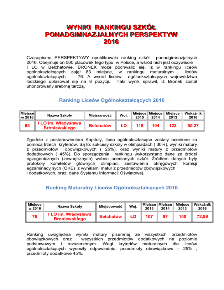 W WY YN NIIK KII R RA AN NK KIIN NG GU US SZZK KÓ ÓŁŁ P PO ON NA AD DG GIIM MN NA AZ ZJJA ALLN NY YC CH HP PE ER RS SP PE EK KT TY YW W 22001166 Czasopismo PERSPEKTYWY opublikowało ranking szkół ponadgimnazjalnych 2016. Obejmuje on 500 placówek tego typu w Polsce, a wśród nich jest oczywiście I LO w Bełchatowie. BRONEK może pochwalić się, iż w rankingu liceów ogólnokształcących zajął 83 miejsce, w rankingu maturalnym liceów ogólnokształcących – 76. A wśród liceów ogólnokształcących województwa łódzkiego uplasował się na 8 pozycji. Taki wynik sprawił, iż Bronek został uhonorowany srebrną tarczą. Ranking Liceów Ogólnokształcących 2016 Miejsce w 2016 Nazwa Szkoły Miejscowość Woj. 83 I LO im. Władysława Broniewskiego Bełchatów ŁD Miejsce Miejsce Miejsce 2015 2014 2013 119 104 Wskaźnik 2016 123 55,27 Zgodnie z postanowieniem Kapituły, licea ogólnokształcące zostały ocenione za pomocą trzech kryteriów. Są to: sukcesy szkoły w olimpiadach ( 30%), wyniki matury z przedmiotów obowiązkowych ( 25%), oraz wyniki matury z przedmiotów dodatkowych ( 45%). Do sporządzenia rankingu wykorzystano dane ze źródeł egzogenicznych (zewnętrznych) wobec ocenianych szkół. Źródłem danych były protokoły komitetów głównych olimpiad, zestawienia okręgowych komisji egzaminacyjnych (OKE) z wynikami matur z przedmiotów obowiązkowych i dodatkowych, oraz dane Systemu Informacji Oświatowej. Ranking Maturalny Liceów Ogólnokształcących 2016 Miejsce w 2016 Nazwa Szkoły Miejscowość Woj. 76 I LO im. Władysława Broniewskiego Bełchatów ŁD Miejsce Miejsce Miejsce 2015 2014 2013 107 97 100 Wskaźnik 2016 72,99 Ranking uwzględnia wyniki matury pisemnej ze wszystkich przedmiotów obowiązkowych oraz wszystkich przedmiotów dodatkowych na poziomie podstawowym i rozszerzonym. Wagi kryteriów maturalnych dla liceów ogólnokształcących wynosiły odpowiednio: przedmioty obowiązkowe – 25% , przedmioty dodatkowe 45%. Ranking Liceów Województwa Łódzkiego 2016 Miejsce Rank. w 2016 głów. 1 2 3 4 5 6 19 21 34 50 59 62 7 72 8 9 83 93 10 95 11 99 Nazwa szkoły I Liceum Ogólnokształcące im. M. Kopernika Publiczne LO Politechniki Łódzkiej XXI Liceum Ogólnokształcące im. B. Prusa XII LO im. Stanisława Wyspiańskiego III Liceum Ogólnokształcące im. T. Kościuszki Salezjańskie LO im. Księdza Bosko Pijarskie Liceum Ogólnokształcące Królowej Pokoju I LO im. Władysława Broniewskiego Klasyczne LO im. ks. St. Konarskiego XXXI Liceum Ogólnokształcące im. Ludwika Zamenhofa Publ. LO UŁ im. Spraw. wśród Narodów Świata Miejscowość WSK Łódź Łódź Łódź Łódź Łódź Łódź 68.01 67.35 61.81 58.59 57.64 56.95 Łowicz 55.92 Bełchatów 55.27 Skierniewice 54.49 Łódź 54.24 Łódź 53.65