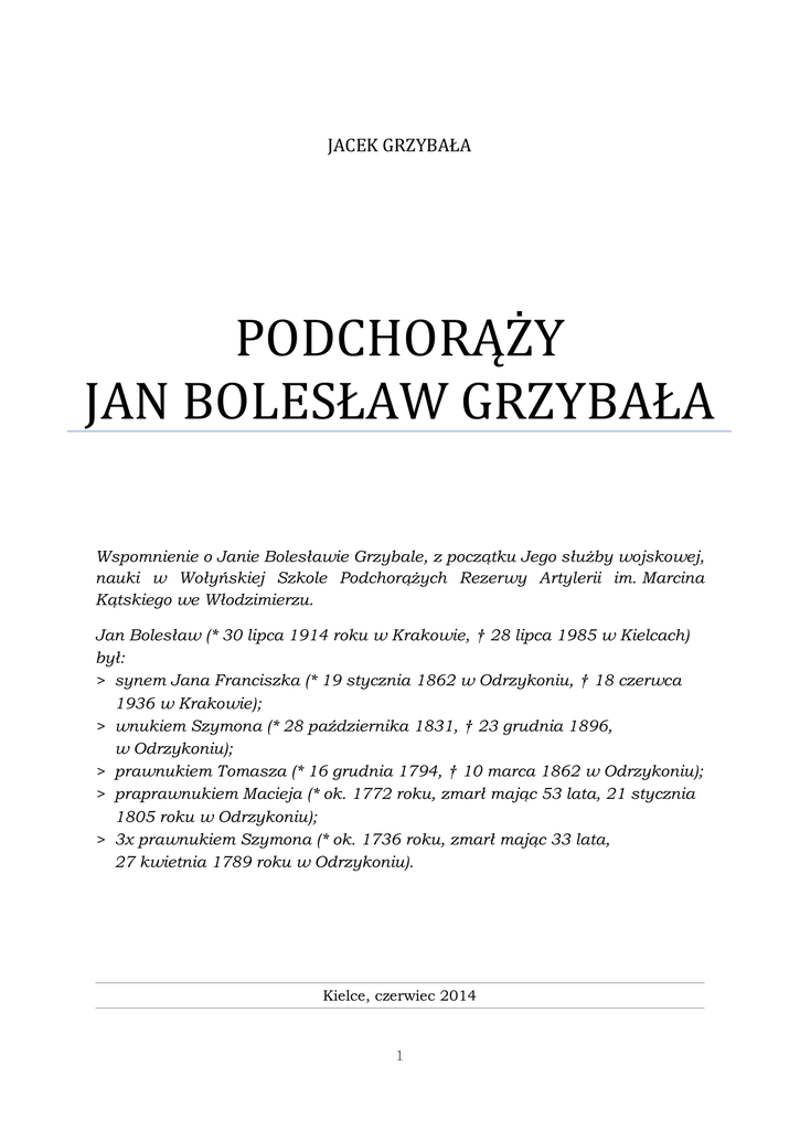 JACEK GRZYBAŁA PODCHORĄŻY JAN BOLESŁAW GRZYBAŁA Wspomnienie o Janie Bolesławie Grzybale, z początku Jego służby wojskowej, nauki w Wołyńskiej Szkole Podchorążych Rezerwy Artylerii im. Marcina Kątskiego we Włodzimierzu. Jan Bolesław (* 30 lipca 1914 roku w Krakowie, † 28 lipca 1985 w Kielcach) był: > synem Jana Franciszka (* 19 stycznia 1862 w Odrzykoniu, † 18 czerwca 1936 w Krakowie); > wnukiem Szymona (* 28 października 1831, † 23 grudnia 1896, w Odrzykoniu); > prawnukiem Tomasza (* 16 grudnia 1794, † 10 marca 1862 w Odrzykoniu); > praprawnukiem Macieja (* ok. 1772 roku, zmarł mając 53 lata, 21 stycznia 1805 roku w Odrzykoniu); > 3x prawnukiem Szymona (* ok. 1736 roku, zmarł mając 33 lata, 27 kwietnia 1789 roku w Odrzykoniu). Kielce, czerwiec 2014 1 Mój Tata, Jan Bolesław Grzybała, urodzony 30 lipca 1914 roku w Krakowie, w 1933 roku zdaje maturę w Gimnazjum OO. Pijarów i rozpoczyna studia Akademii Górniczej w Krakowie na Wydziale Górniczym. W trakcie studiów zostaje powołany do wojska. Jego przydział to Wołyńska Szkoła Podchorążych Rezerwy Artylerii im. Marcina Kątskiego we Włodzimierzu 1. Nauka w szkole trwała jeden rok, w przypadku mego Taty to okres od 21 września 1937 do 28 czerwca 1938 roku. Kogo, celem odbycia służby wojskowej, powoływano do takiej szkoły? Warunkiem było ukończenie szkoły średniej i posiadanie matury. Powoływano także, tak jak mojego Tatę, studentów w trakcie studiów, gdyż już wtedy sytuacja polityczna była bardzo nie jasna trzeba było się zbroić oraz szkolić kadrę. Komendantem Szkoły był pułkownik mgr Jan Antoni Filipowicz 2. Komendant Wołyńskiej Szkoły Podchorążych Rezerwy Artylerii im. Marcina Kątskiego we Włodzimierzu, pułkownik mgr Jan Antoni Filipowicz. Obwieszczenie. Decyzją z dnia 21 maja 1922 r. Nr A. O. 1638 - Pan Minister Spraw Wewnętrznych zmienił nazwę miasta "Włodzimierz-Wołyński" Województwa Wołyńskiego na "Włodzimierz". ~ Wojewoda (-) M. Mickiewicz. (Dziennik Urzędowy Województwa Wołyńskiego. R. 2, 1922/1923, nr 4 z dnia 4 lipca 1922, poz. 250.) 2 Pułkownik mgr Jan Antoni Filipowicz był jednym z obrońców Lwowa w 1918 roku – organizuje obronę artyleryjską miasta. Brał udział w walkach na kresach wschodnich z agresją bolszewicką w 1920 roku. Za wybitne męstwo z narażeniem życia w walkach obronnych 1918 – 1920, w dniu 17 stycznia 1921 roku, został wyróżniony Orderem Virtuti Militari V klasy. Po zakończeniu działań wojennych zostaje oficerem zawodowym w wojsku. W 1927 roku kończy studia magisterskie z polskiego prawa. W latach 1929 – 1934 dowodzi 3 Dywizjonem Artylerii Konnej w Wilnie. Od 28 kwietnia 1934 do grudnia 1938 pełni obowiązki Komendanta Szkoły Podchorążych Artylerii we Włodzimierzu. W 1937 roku awansuje do stopnia pułkownika Wojska Polskiego. 1 2 Słuchacze byli skoszarowani i otrzymywali, tak jak w normalnym wojsku, żołd. Z opowiadań Taty wiem, że ich rocznik zrzekł się części tego żołdu na rzecz jednej ze szkół a konkretnie na dożywianie w niej dzieci. Po ukończeniu szkoły słuchacze otrzymywali tytuł bombardier lub kapral podchorąży. Absolwentom, którzy wyróżniali się osiągnięciami w nauce przyznawano stopień plutonowy podchorąży. Wśród nich był mój Tata, który na 78 słuchaczy uzyskał 6 lokatę oraz jego kolega ze studiów Edmund Peszko, który uzyskał 5 lokatę. Czego uczono w Wołyńskiej Szkole Podchorążych Rezerwy Artylerii? Według świadectwa mojego Taty, podczas kursu trwającego 10 miesięcy słuchaczy obowiązywało łącznie szesnaście przedmiotów nauczania wyszkolenie bojowe, instrukcje strzelania, terenoznawstwo i topografia, wyszkolenie piesze, wyszkolenie strzeleckie, jazda konna, bateria zaprzężona, działoczyny, opis sprzętu i amunicja artyleryjska, nauka służby wewnętrznej, łączność, gazoznawstwo, organizacja wojska i P.W., wyszkolenie saperskie, nauka o koniu oraz wychowanie fizyczne. Na poligonie w trakcie zajęć ze strzelania z działa. Celowniczy Jan Bolesław Grzybała stoi w środku, z przodu. 3 Było to 76 lat temu i niektóre przedmioty w wyszkoleniu wojskowym wydają się dzisiaj zupełnie archaiczne, np. jazda konna, bateria zaprzężona czy nauka o koniu. Tata mój z jazdy konnej miał ocenę 9 na 10 możliwych. Ocena była wysoka a uzyskał ją zapewne dlatego, iż wszystkie wakacje będąc jeszcze uczniem gimnazjum spędzał w majątku rodzinnym swojej matki Jadwigi z domu Krassowskiej, w Zakrzowie gm. Oksa woj. Kieleckie. Tu zawsze był jeden koń wolny do jazdy wierzchem, z czego mój Tata korzystał. Ta umiejętność jazdy konnej przydała się Tacie nie tylko w szkole wojskowej, lecz przede wszystkim we wrześniu 1939 roku, gdy jako żołnierz 5 pułku artylerii ciężkiej Armii „Kraków”, na koniu przejechał szmat Polski, Bieszczady, Gorgany uważane za jedne z najdzikszych gór Europy, a potem przejście graniczne na Przełęczy Tatarskiej i dalej na Węgry aż do Miskolca 3. Fotografia zrobiona podczas zajęć z jazdy konnej. Z pamiątek z pobytu w szkole podchorążych pozostało w domu zdjęcie z poligonu w trakcie strzelania z działa, świadectwo Taty z podchorążówki oraz zdjęcie całego rocznika z kadrą zrobione po rozdaniu świadectw. Zobacz: Pechowy odział, podchorąży rez. Jan Grzybała, opisujący fragment żołnierskich losów Jana Bolesława Grzybały - internowanie i pobyt na Węgrzech od września 1939 do marca 1940 roku. 3 4 Świadectwo ukończenia w 1938 roku przez Jana Bolesława Grzybałę Wołyńskiej Szkoły Podchorążych Rezerwy Artylerii im. Marcina Kątskiego we Włodzimierzu. 5 Aneks Jak podaje Kazimierz Bar, w okresie międzywojennym władze wojskowe niejednokrotnie zajmowały się problemem szkolnictwa w wyniku tego w latach 1918 - 1939 dokonywane były liczne przeobrażenia w strukturze szkolnictwa wojskowego. Poszczególne rodzaje broni i służb organizowały odpowiednie szkoły, któr