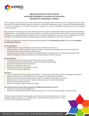 identify Agencja Interaktywna Kerris Identify poszukuje kandydatów na praktyki na stanowisku: Specjalista ds. Marketingu i Reklamy Kerris to grupa firm skoncentrowana wokół nowoczesnych technologii, branży internetowej oraz rozwiązań mobilnych. Marka Kerris Identify to prężnie działająca Agencja Interaktywna świadczące profesjonalne usługi w zakresie: identyfikacji graficznych, tworzenia oraz obsługi stron i portali internetowych, systemów IT, a także marketingu internetowego (w tym marketingu w wyszukiwarkach). Mimo niespełna rocznej obecności na rynku, udało nam się stworzyć zgrany zespół profesjonalistów z ogromnym doświadczeniem. Współpracujemy z przedsiębiorstwami o różnej wielkości i na różnych etapach rozwoju. Dostarczamy rozwiązania pozwalające oszczędzić czas i pieniądze, polepszyć komfort pracy oraz zwiększyć rozpoznawalność marki, a przez to także generowane zyski. Z powodzeniem realizujemy projekty dla spółek giełdowych, instytucji publicznych, a także firm z sektora MSP. W związku z dynamicznym rozwojem firmy poszukujemy kandydatów na dwumiesięczne praktyki na stanowisko Specjalisty ds. Marketingu i Reklamy: Zakres obowiązków: • Współtworzenie strategii marketingowych dla ciekawych Klientów Biznesowych. • Kreatywna praca w ramach zespołów projektowych (tworzenie kampanii marketingowych, prace koncepcyjne nad materiałami reklamowymi oraz hasłami reklamowymi). • Wsparcie przy prowadzeniu i samodzielne prowadzenie kampanii marketingowych i e-marketingowych (social media, kampanie mailingowe, reklama kontekstowa, marketing afiliacyjny, nośniki tradycyjne). Nasze oczekiwania: • Wykształcenie minimum średnie, preferowane studia z zakresu marketingu. • Co najmniej podstawowe doświadczenie w zakresie marketingu internetowego. • Bardzo dobra znajomość branży internetowej. • Niekończące się pokłady kreatywności. • Pozytywne nastawianie i wysoka kultura osobista. • Dobra znajomość języka angielskiego. Oferujemy: • Pracę w niehierarchicznej i bardzo przyjaznej atmosferze – charakterystycznej dla młodych i prężnie rozwijających się zespołów. • Ogromną elastyczność, w tym możliwość pracy w niepełnym wymiarze oraz pracy zdalnej. • Możliwość skrócenia dwumiesięcznego okresu praktyk i zatrudnienia na atrakcyjnych warunkach. • Kreatywną pracę i ciekawe wyzwania – będziesz miał realny wpływ na realizowane projekty. • Pokrycie kosztów reprezentacji firmy. • Możliwość przyspieszonego rozwoju zawodowego. Jeśli zainteresowała Cię nasza oferta zachęcamy do aplikowania (do dnia 13.02.2012r.): 1. Wyślij swoje CV na adres [email protected]. 2. Zareklamuj swoją kandydaturę! (na nie więcej niż pół strony A4 – forma listu motywacyjnego nie jest konieczna). Prosimy o dopisanie klauzuli: Wyrażam zgodę na przetwarzanie moich danych osobowych w celach rekrutacji, zgodnie z Ustawą z dn. 29 sierpnia 1997 r. o ochronie danych osobowych (Dz. U. z 2002 r. Nr 101, poz. 926 z późniejszymi zmianami). Kerris Identify ul. Kazimierzowska 52 (Iip.), 02-546 Warszawa, [email protected], www.kerris.pl