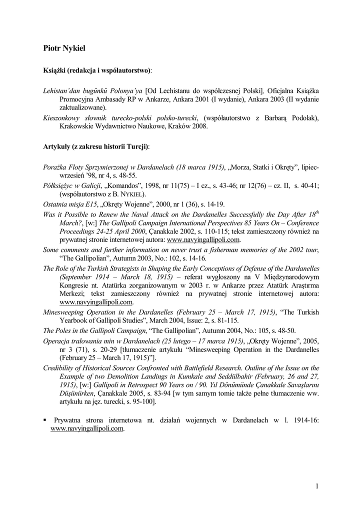 Piotr Nykiel Książki (redakcja i współautorstwo): Lehistan’dan bugünkü Polonya’ya [Od Lechistanu do współczesnej Polski], Oficjalna Książka Promocyjna Ambasady RP w Ankarze, Ankara 2001 (I wydanie), Ankara 2003 (II wydanie zaktualizowane). Kieszonkowy słownik turecko-polski polsko-turecki, (współautorstwo z Barbarą Podolak), Krakowskie Wydawnictwo Naukowe, Kraków 2008. Artykuły (z zakresu historii Turcji): Porażka Floty Sprzymierzonej w Dardanelach (18 marca 1915), „Morza, Statki i Okręty”, lipiecwrzesień ’98, nr 4, s. 48-55. Półksiężyc w Galicji, „Komandos”, 1998, nr 11(75) – I cz., s. 43-46; nr 12(76) – cz. II, s. 40-41; (współautorstwo z B. NYKIEL). Ostatnia misja E15, „Okręty Wojenne”, 2000, nr 1 (36), s. 14-19. Was it Possible to Renew the Naval Attack on the Dardanelles Successfully the Day After 18th March?, [w:] The Gallipoli Campaign International Perspectives 85 Years On – Conference Proceedings 24-25 April 2000, Çanakkale 2002, s. 110-115; tekst zamieszczony również na prywatnej stronie internetowej autora: www.navyingallipoli.com. Some comments and further information on never trust a fisherman memories of the 2002 tour, “The Gallipolian”, Autumn 2003, No.: 102, s. 14-16. The Role of the Turkish Strategists in Shaping the Early Conceptions of Defense of the Dardanelles (September 1914 – March 18, 1915) – referat wygłoszony na V Międzynarodowym Kongresie nt. Atatürka zorganizowanym w 2003 r. w Ankarze przez Atatürk Araştırma Merkezi; tekst zamieszczony również na prywatnej stronie internetowej autora: www.navyingallipoli.com. Minesweeping Operation in the Dardanelles (February 25 – March 17, 1915), “The Turkish Yearbook of Gallipoli Studies”, March 2004, Issue: 2, s. 81-115. The Poles in the Gallipoli Campaign, “The Gallipolian”, Autumn 2004, No.: 105, s. 48-50. Operacja trałowania min w Dardanelach (25 lutego – 17 marca 1915), „Okręty Wojenne”, 2005, nr 3 (71), s. 20-29 [tłumaczenie artykułu “Minesweeping Operation in the Dardanelles (February 25 – March 17, 1915)”]. Credibility of Historical Sources Confronted with Battlefield Research. Outline of the Issue on the Example of two Demolition Landings in Kumkale and Seddülbahir (February, 26 and 27, 1915), [w:] Gallipoli in Retrospect 90 Years on / 90. Yıl Dönümünde Çanakkale Savaşlarını Düşünürken, Çanakkale 2005, s. 83-94 [w tym samym tomie także pełne tłumaczenie ww. artykułu na jęz. turecki, s. 95-100]. Prywatna strona internetowa nt. działań wojennych w Dardanelach w l. 1914-16: www.navyingallipoli.com. 1 Przekłady (z jęz. angielskiego): Książki: Taylor M., Współczesne lotnictwo wojskowe. Encyklopedia, Art Books, Kraków 1993 (przekład wspólnie z W. Jaskowską). Flack J., Współczesne lotnictwo bojowe, Art Books, Kraków 1993. Encyklopedia II wojny światowej, Wydawnictwo Ryszard Kluszczyński, Kraków 1994 (tłumaczenie zbiorowe). Artykuły: Burford J., Duchy dżungli [LRRP’s in action], „Komandos” 1998, nr 7-8 (72), s. 46-50 – cz. I; nr 9 (73), s. 19-22 – cz. II. 2