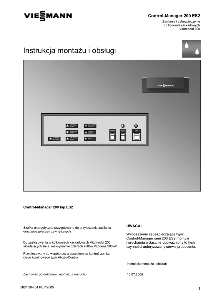 Control-Manager 200 ES2 Zasilanie i zabezpieczenie do kotłowni kaskadowych Vitomoduł 200 Instrukcja montażu i obsługi ZB. MELD USTEREK MIN POZ. WODY MAX TEMP. WODY MAX CIŚN. WODY ZABEZP. KOMIN. MIN CIŚN. WODY INNE RESET TEST SIEĆ Control-Manager 200 typ ES2 Szafka energetyczna przygotowana do przyłączenia zasilania oraz zabezpieczeń zewnętrznych. Do zastosowania w kotłowniach kaskadowych Vitomoduł 200 składających się z maksymalnie czterech kotłów Vitodens 200-W. UWAGA : Wyposażenie zabezpieczające typu: Control-Manager serii 200 ES2 montuje i uruchamia wyłącznie upoważniony to tych czynności autoryzowany serwis producenta. Przystosowany do współpracy z zespołem do kontroli zaniku ciągu kominowego typu Abgas-Control Instrukcja montażu i obsługi Zachować po dokonaniu montażu i rozruchu 5824 304 04 PL 7/2005 15.07.2005 1 ______________________________________________________________________________________________________ Instrukcja montażu i obsługi Control-Manager 200 typ ES2 Widok strony czołowej i opis przyłączy Opis realizowanych funkcji Szafka energetyczna Control-Manager 200 typu ES2 przeznaczona jest do podłączenia zasilania 220V AC kotłów Vitodens 200-W, zainstalowanych w kotłowni kaskadowej Vitomoduł 200 Ponadto przygotowano szereg przyłączy do zewnętrznych urządzeń zabezpieczających według potrzeb klienta jak : Z pełną identyfikacją usterek zewnętrznych. Zastosowanie Control-Manager 200 typu ES2 znacznie ułatwia i przyspiesza prace związane z instalacją kotłowni kaskadowej Vitomoduł 200. ogranicznik poziomu wody, ogranicznik ciśn. maksymalnego ogranicznik ciśn. minimalnego zbiorczy ogr. temp. maks (STB) kontrolna przepustnica spalin czujnik zaniku ciągu kominowego (Abgas-Control) inne zabezpieczenia zewnętrzne - Rozruch Control-Manager 200 ES2 we współpracy z systemem Abgas-Control prowadzi upoważniony serwis fabryczny. Po rozruchu zakładane są plomby fabryczne. Widok płyty czołowej ZB. MELD. USTEREK MIN POZ. WODY MAX TEMP. WODY MAX CIŚN. WODY ZABEZP. KOMIN. MIN CIŚN. WODY INNE RESET TEST SIEĆ Opis przyłączy X1 – przygotowane do przyłączenia sygnalizacji zbiorczego meldowania usterek, którego wykonanie leży w zakresie Inwestora, X2 – przyłącza blokujące pracę kotłów w kaskadzie Vitomoduł 200 . Należy przyłączyć odpowiednio do styków 1 i L złącza wtykowego nr 53 rozszerzenia wewnętrznego H1, zainstalowanego w regulatorze każdego kotła Vitodens 200-W. 5824 304 04 PL 7/2005 L 6 7 PE N L X3 – do przyłączenia zewnętrznych urządzeń zabezpieczających – zgodnie z opisem. Należy przyłączyć te styki, zewnętrznych urządzeń zabezpieczających, które są normalnie zwarte. W stanie dostawy w przyłączach X3 zainstalowano mostki zwierające, które należy stosownie usuwać przed przyłączeniem urządzeń zabezpieczających. 8 9 10 11 12 13 14 15 PE N L PE N L PE N VITODENS 300 NR4 ZASILANIE ~220v 5 VITODENS 300 NR3 ZASILANIE ~220v 4 VITODENS 300 NR2 ZASILANIE ~220v 9 10 10 11 11 12 12 13 13 9 VITODENS 300 NR1 ZASILANIE ~220v 8 INNE ZABEZPIECZENIA 8 CZUJNIK CIĄGU KOMINOWEGO 7 7 PRZEPUSTNIC A SPALIN 6 (STB) TEMP MAX 6 OGRANI. CIŚNIENIA MIN. 5 OGRANI. CIŚNIENIA MAX 5 OGRANI. POZIOMU WODY 4 VITODENS 300 NR4 (53) 3 4 VITODENS 300 NR3 (53) 24V ZBIORCZE MELD. USTEREK + 3 X5 X4 X3 VITODENS 300 NR2 (53) 1 2 X2 VITODENS 300 NR1 (53) X1 1 2 L 3 PE N ZASILANIE GŁÓWNE ~220V X4 – przygotowane do indywidualnego przyłączenia zasilania 230 AC każdego kotła Vitodens 200-W kaskady Vitomoduł 200. X5 – zasilanie sieciowe 230 V AC Control-Manager 200 ES2 UWAGA: W przypadku stosowania wielu urządzeń zabezpieczających na jednej parze styków z listwy X3 (np. INNE ZABEZP) należy dokonywać ich przyłączenia w sposób szeregowy. 2 ______________________________________________________________________________________________________ Instrukcja montażu i obsługi Control-Manager 200 typ ES2 Schemat podłączenia Informacje ogólne Moduł zabezpieczający typu ControlManager 200 ES2 należy podłączyć do kontrolera spalin serii Abgas-Control, oraz rozszerzenia wewnętrznego H1 zamontowanego w każdym regulatorze Vitotronic 100 HC1 kotła Vitodens 200-W. Prosimy o zwrócenie uwagi na fakt, że zasilanie każdego z kotłów Vitodens 200-W (230 AC) należy doprowadzić z modułu zabezpieczającego ControlManager typu 200 ES2. Podczas prac montażowych należy wyłączyć zasilanie kotłowni i zachować wszelkie względy bezpieczeństwa. Po odłączeniu napięcia zasilającego od modułu Control-Manager 200 ES2 winno nastąpić pozbawienie zasilania kotłów Vitodens 200-W. Schemat podłączenia w przypadku kaskady trzech kotów przedstawiono na rysunku poniżej. Schemat ideowy podłączenia AbgasControl Control-Manager 200 ES2 X3 X2 X4 X2 X2 X4 X4 X1 X5 Opis przewodów elektrycznych X1 – meldowanie usterek 24V DC X2 – przyłącza blokujące pracę kotłów w kaskadzie Vitomoduł 200 . Należy przyłączyć odpowiednio do styków 1 i L złącza wtykowego nr 53 rozszerzenia wewnętrznego H1, zainstalowanego w regulatorze każdego kotła Vitodens 200-W. X3 – do przyłączenia czujnika zaniku ciągu zainstalowanego w kontrolerze Abgas-Control. X4 – zasilanie kotłów 230 V AC 5824 304 04 PL 7/2005 UWAGA: X5 – zasilanie sieciowe 230 V AC (Control-Manager 200 ES2). Rozruch Control-Manager 200 ES2 we współpracy z systemem Abgas-Control prowadzi upoważniony serwis fabryczny. Po rozruchu zakładane są plomby fabryczne. Rodzaje przewodów Nr Typ X1 X2 X3 X4 X5 H05VV-F H05VV-F H05VV-F H05VV-F H05VV-F Ilość żył S 2 2 2 3 3 1,5 mm2 1,0 mm2 1,0 mm2 1,5 mm2 1,5 mm2 3 ______________________________________________________________________________________________________ Instrukcja montażu i obsługi Control-Manager 200 typ ES2 Schemat podłączenia Abgas-Control do wyposażenia zabezp. Control-Manager c.d. Montaż rozszerzenia wewnętrznego H1 2. 1. 96 5. 7x 6. A 3. Zaciski z listwy